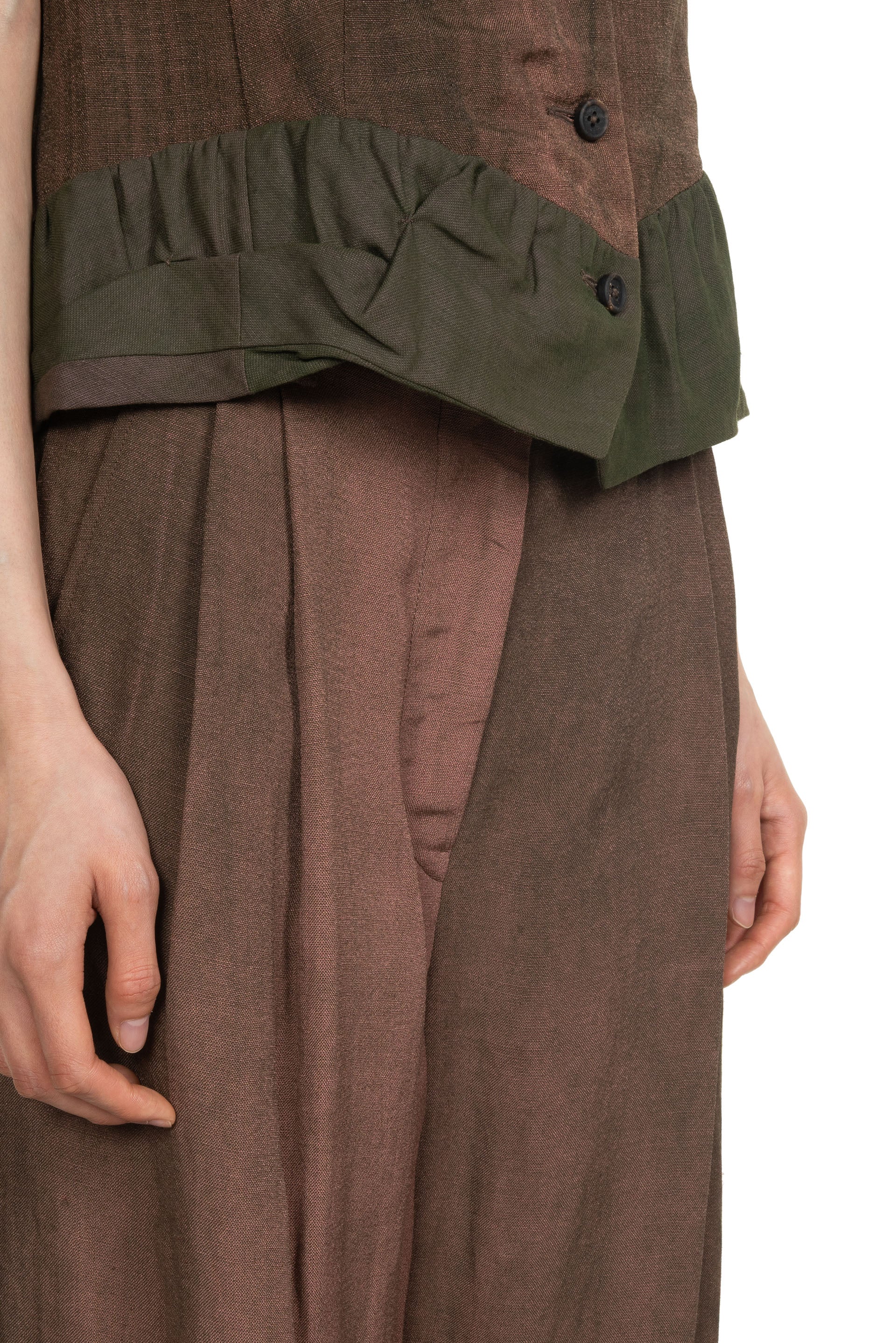 With a colour palette of purples, greens, and greys, Ziggy Chen’s designs evoke the textures of aged architecture and the natural world. The garments feel as natural as they look, combining softness with structure. Seamlessly blending Eastern and Western influences, Gnartricate captures the essence of timeless beauty, from fluid silhouettes to intricate patterns. Ziggy Chen continues to redefine the intersection of tradition and modernity in fashion as seen with the Straight Leg Trousers.