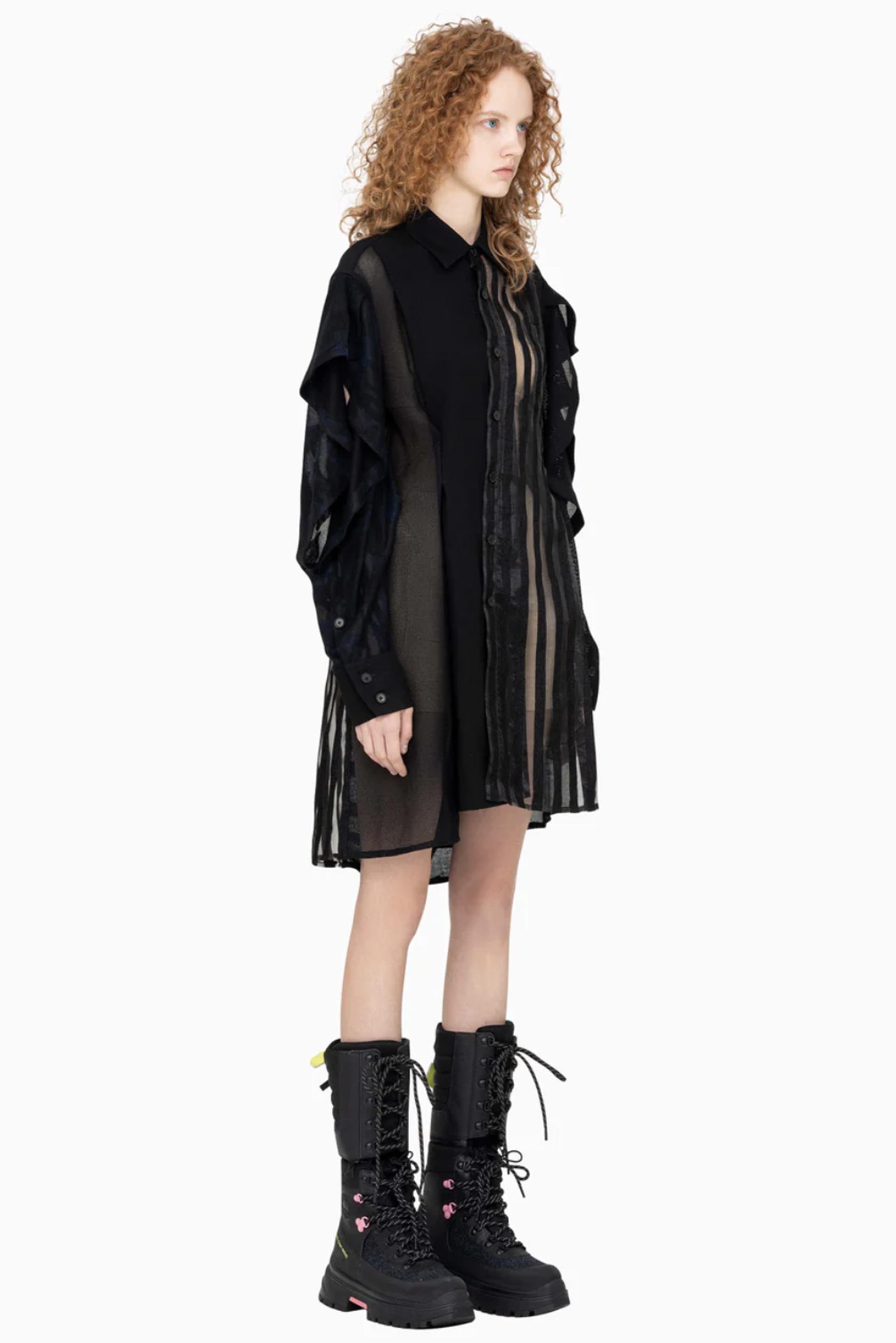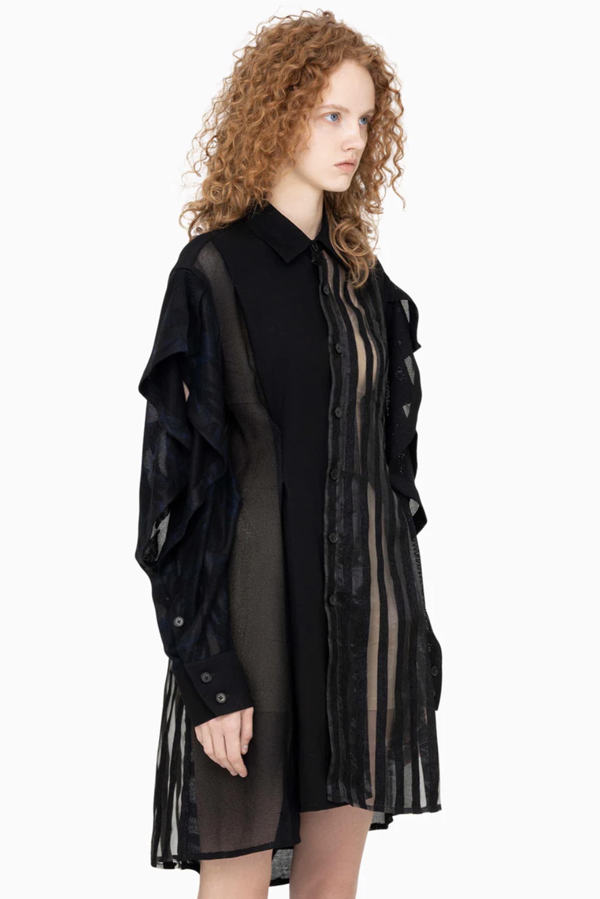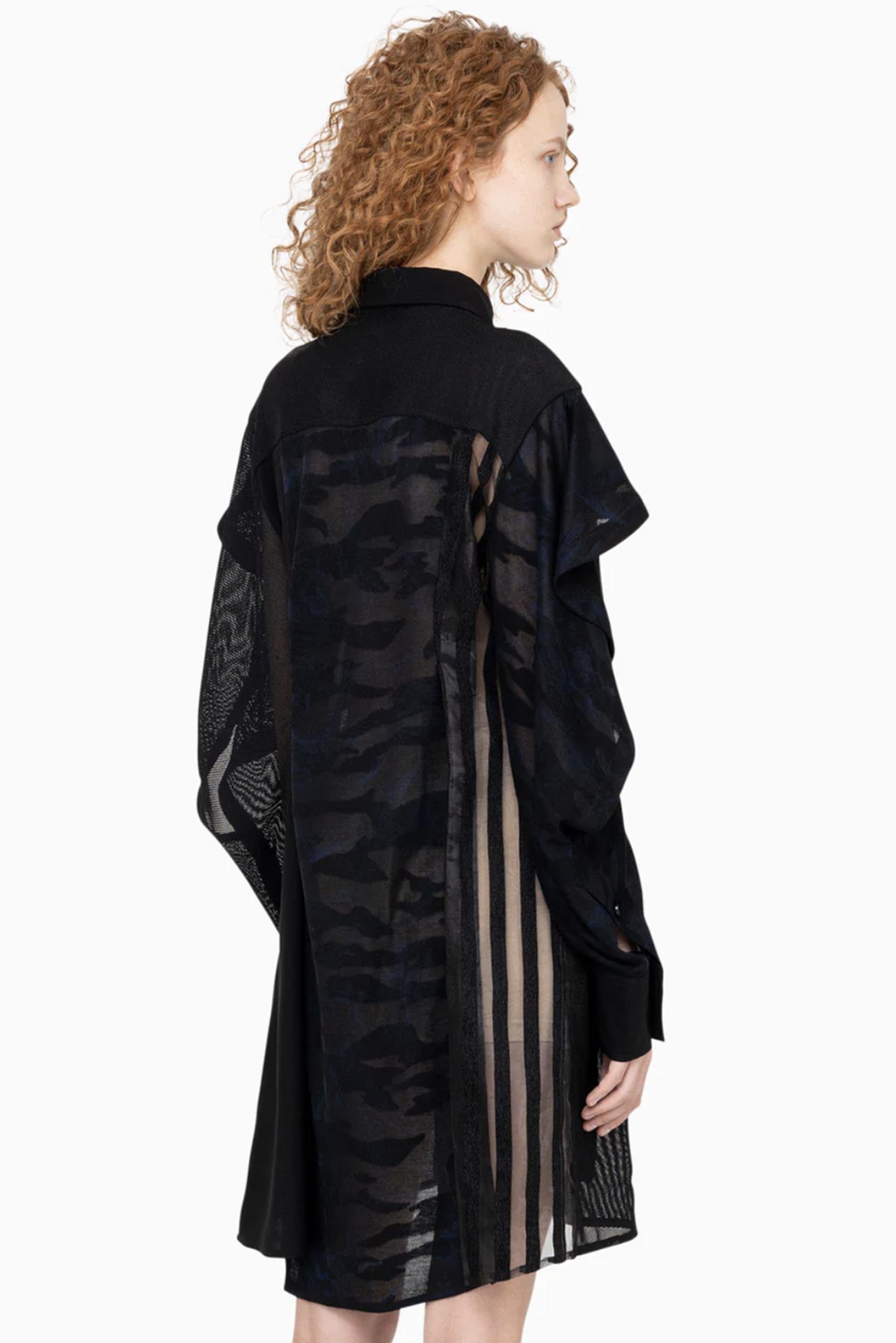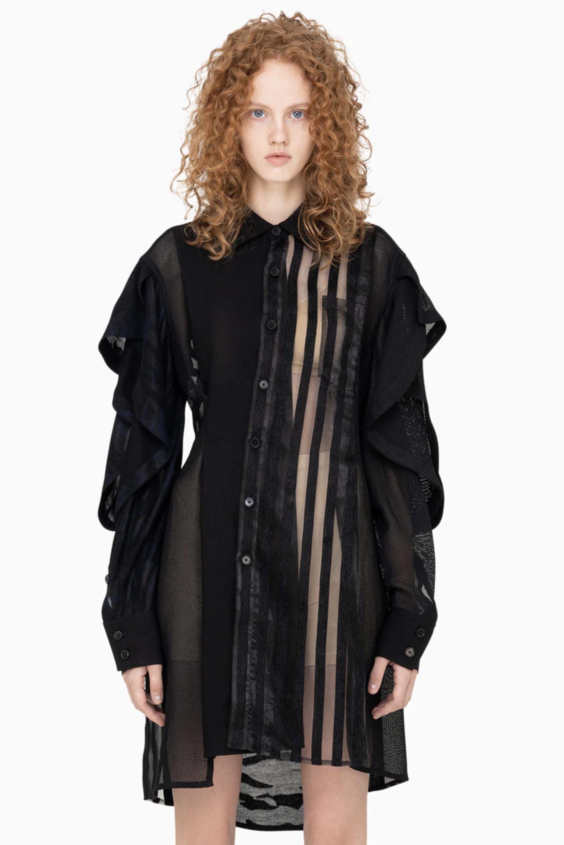 Deconstructed and layered patchwork shirt-dress. Made in black sheer. Feature stripes and camouflage patterns. Volumetric wavy sleeves. Buttoned closure to the front and an asymmetrical hem.