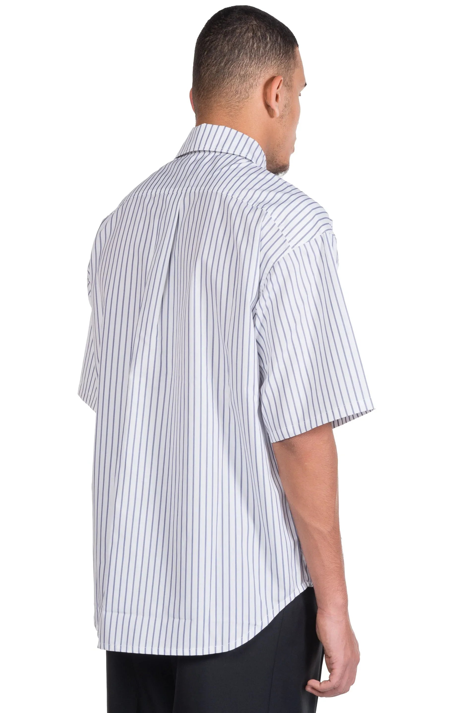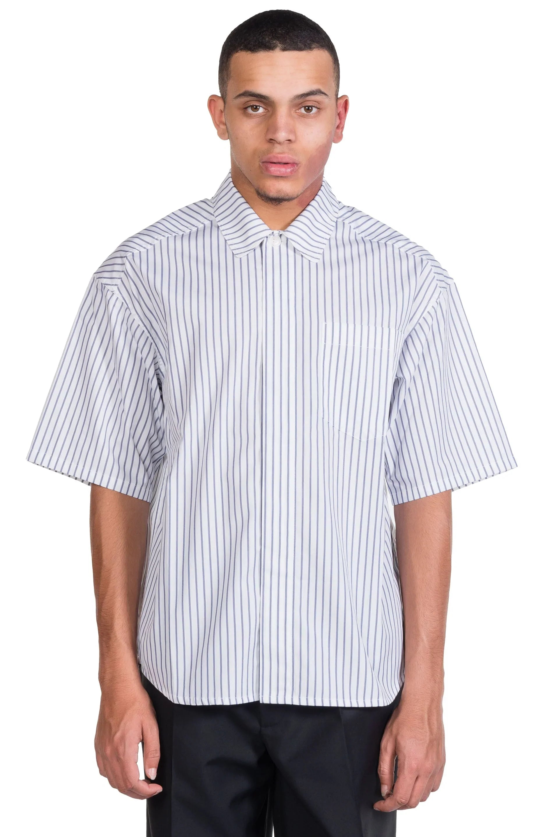 Stripe Short Sleeve Shirt. Horn buttons. Front pockets. Relaxed fit. Dropped shoulders. Colour: White/Blue. Composition: Cotton