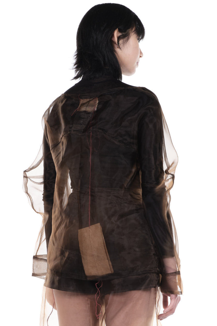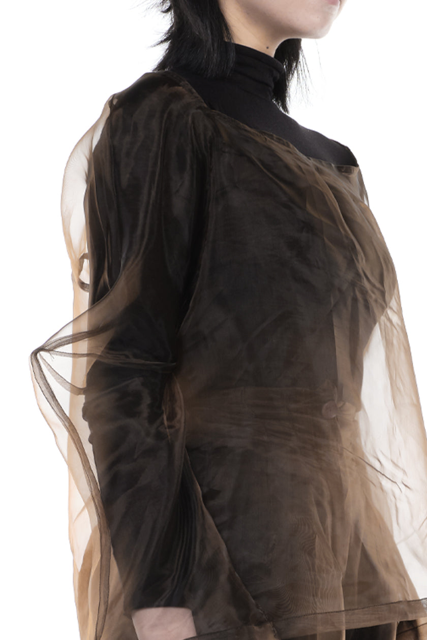 Structured Top in Chocolate from Peng Tai. Long Sleeves. Wide round neck. Brand stitching at back. Beautiful organza fabric.