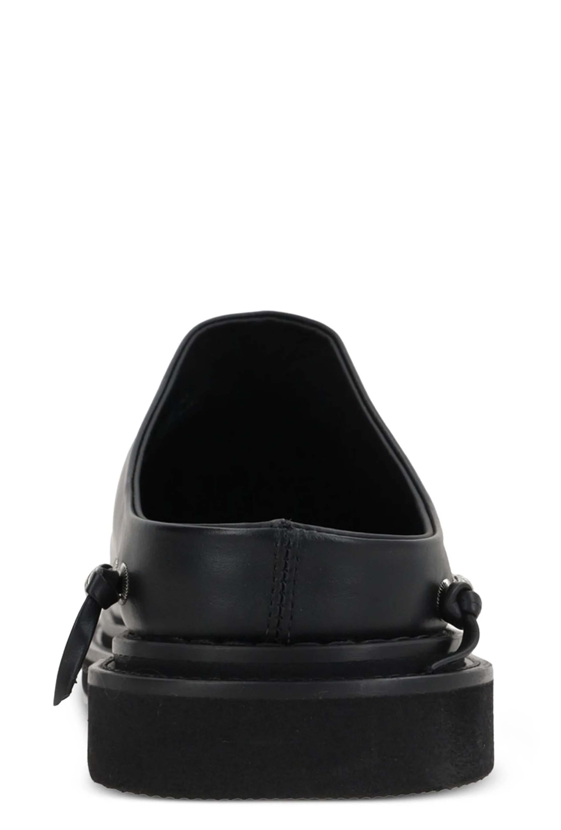 Toga Virilis Leather slippers in Black. Flat rubber sole. Branded foot bed. Metal eyelet detailing. Charm detail throughout.