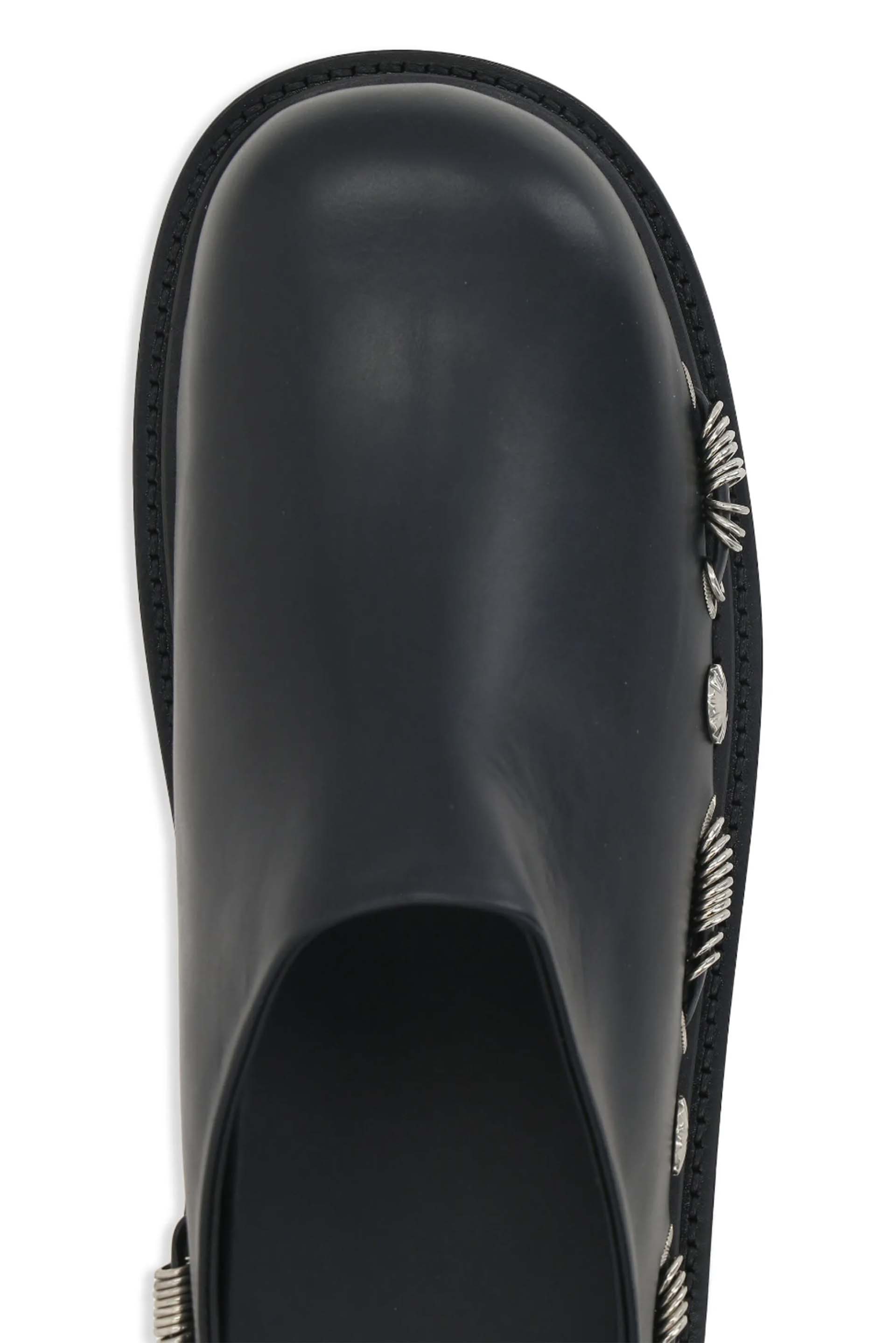 Toga Virilis shoes aesthetic was born from a desire to fuse contemporary western styles with traditional Japanese design, detailing and materials. Toga's footwear take inspiration from vintage elements, brought up to date with contemporary shapes and bold prints as seen with the Studded Clogs Black.