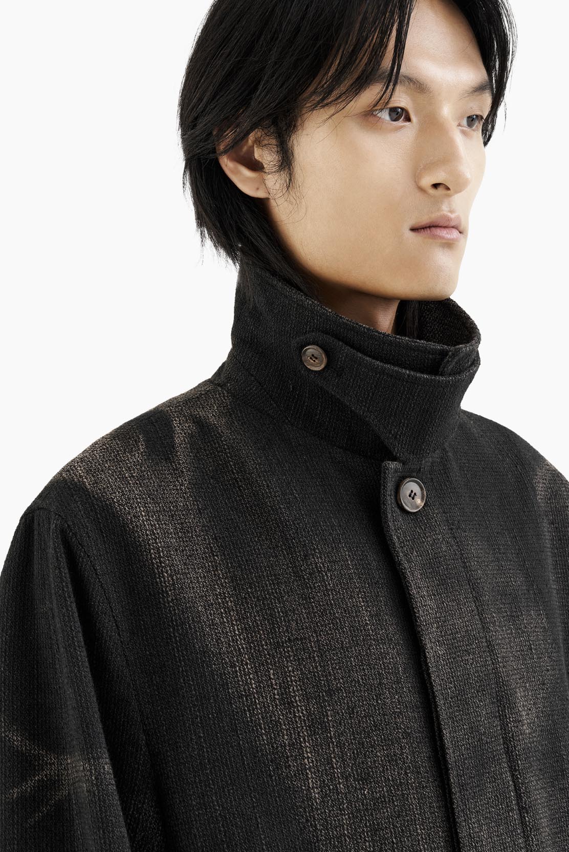 seamlessly with its textured fabric. Relaxed fit. Detachable neck cover with horn buttons. Adjustable belt. Adjustable cuffs. Horn buttons on cuffs and front.