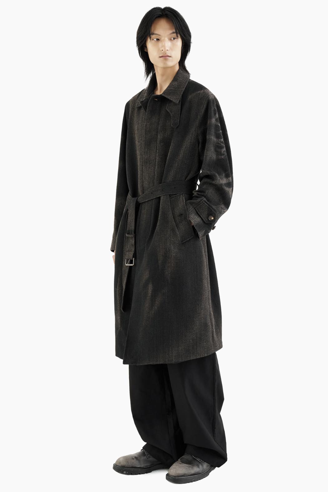 JiyongKim’s signature sun-faded effect is developed over months of natural exposure to sunlight, rain, and wind—creating one-of-a-kind patterns without chemical dyes or water waste. Vintage textiles and hardware are reimagined into relaxed, draped silhouettes in earthy tones, reflecting the brand’s commitment to sustainability and innovation. Rooted in slow fashion, JiyongKim celebrates nature with dynamic, eco-conscious designs that elevate the beauty of mindful craftsmanship as seen with the Sun-Bleached Mac Coat.