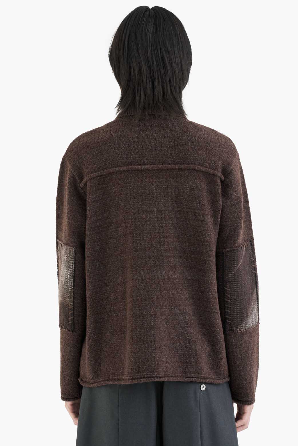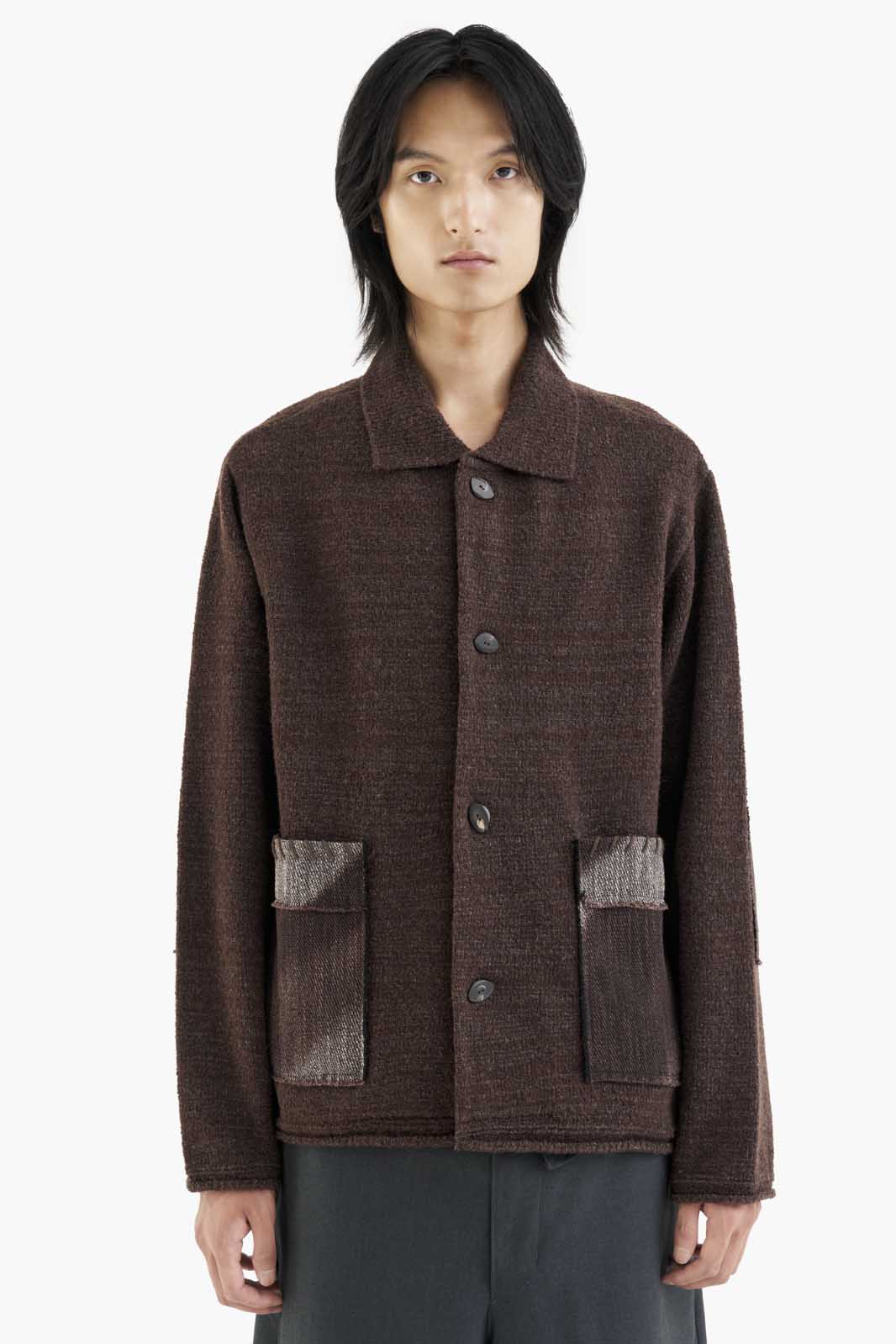 JiyongKim wool–alpaca–nylon blend knit cardigan, finished with rolled edges on structured panels, featuring Sun-Bleach patch pockets made from fabric remnants and distinctive button details. Long sleeves. Button closure at front. Regular collar. Two front pockets. Soft textural fabric. This item has been Sun-Bleached and carries a unique imprint of nature and time. Each item features individual irregularities for a one-of-a-kind finish.
