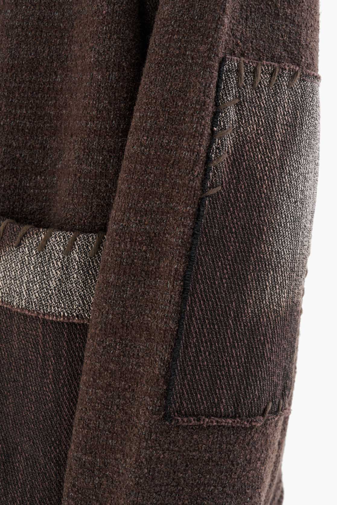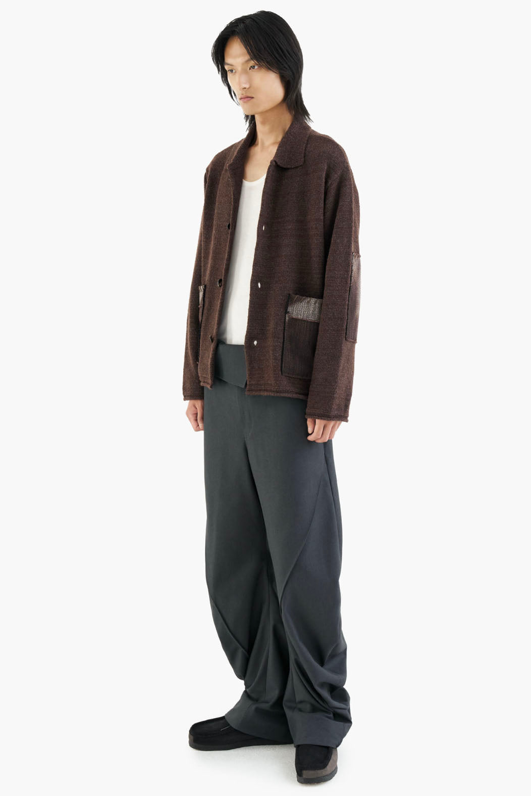 JiyongKim’s signature sun-faded effect is developed over months of natural exposure to sunlight, rain, and wind—creating one-of-a-kind patterns without chemical dyes or water waste. Vintage textiles and hardware are reimagined into relaxed, draped silhouettes in earthy tones, reflecting the brand’s commitment to sustainability and innovation. Rooted in slow fashion, JiyongKim celebrates nature with dynamic, eco-conscious designs that elevate the beauty of mindful craftsmanship as seen with the Sun-Bleached Pocket Knit Cardigan.