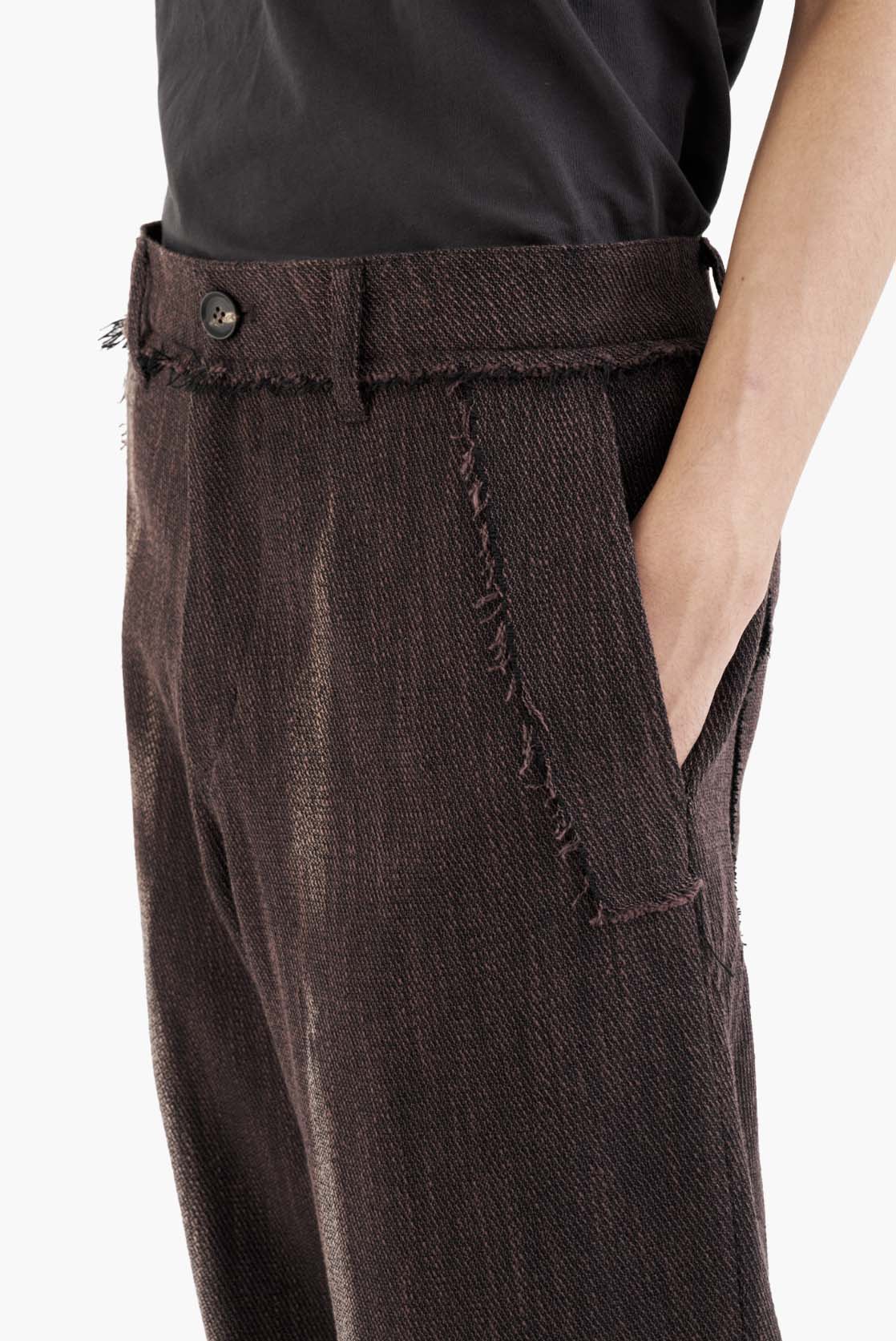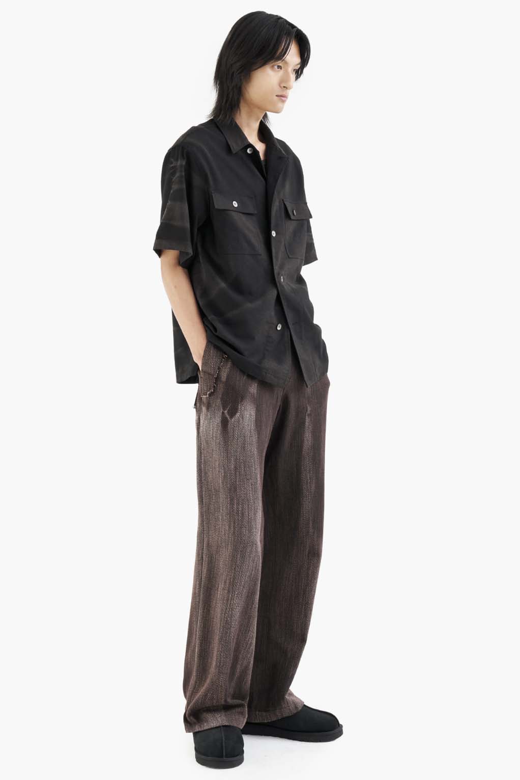JiyongKim’s signature sun-faded effect is developed over months of natural exposure to sunlight, rain, and wind—creating one-of-a-kind patterns without chemical dyes or water waste. Vintage textiles and hardware are reimagined into relaxed, draped silhouettes in earthy tones, reflecting the brand’s commitment to sustainability and innovation. Rooted in slow fashion, JiyongKim celebrates nature with dynamic, eco-conscious designs that elevate the beauty of mindful craftsmanship as seen with the Sun-Bleached Raw Edge Straight Trousers.