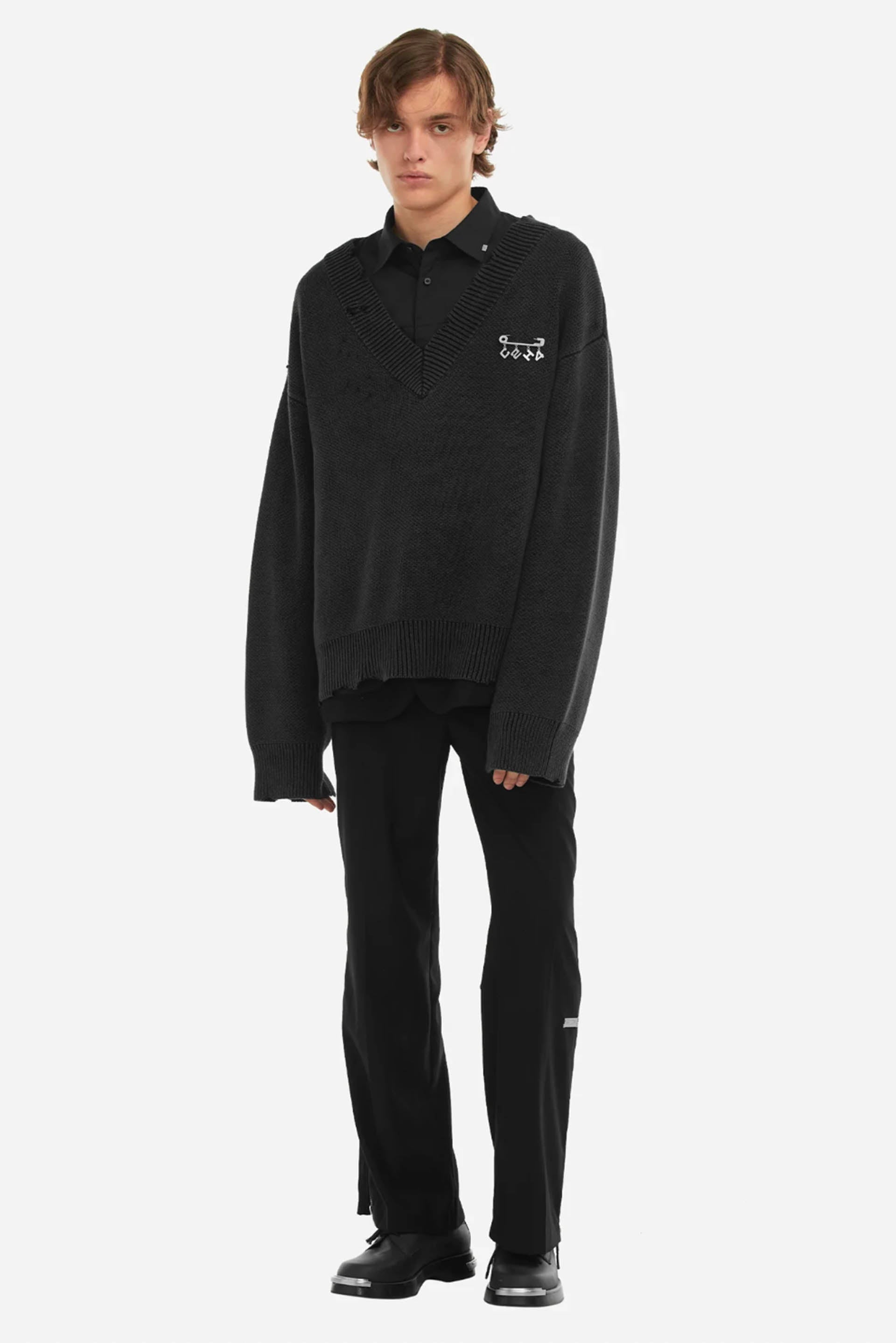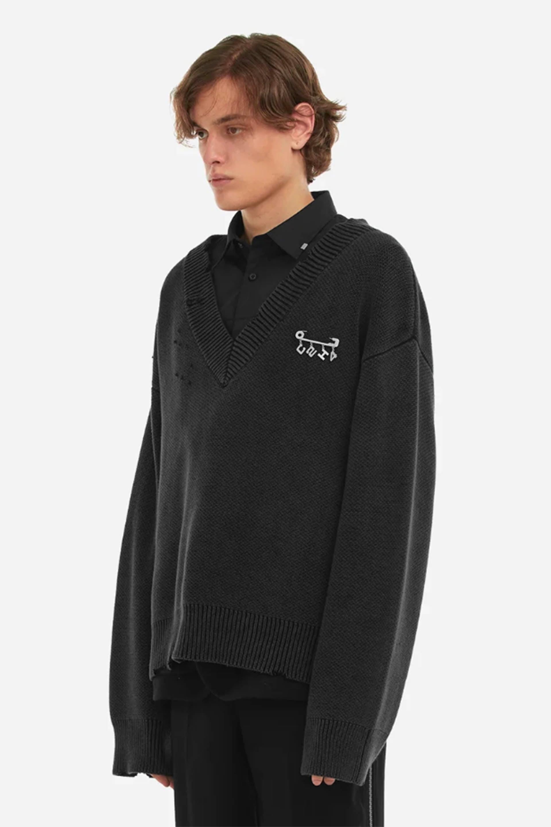 Long Sleeve Knit Wool-blend Sweater. Garment Colour Fading Tech. Distressing At Rib Knit V-neck Collar, Cuffs, And Hem. Comes With White Gold Coated Brass Safety Pin Set At Front.