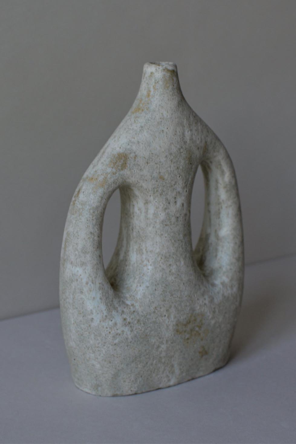 Sculptural vessel made from grogged pink stoneware clay using a press mould technique. Hand painted layers of glaze gives a mottled stoney-lichen effect with diverse tones coming from the glaze’s interaction with the iron rich clay body. Internally the vessel is also glazed. Due to the clay composition and handmade process, each piece will have slight variations in form, surface and colour.