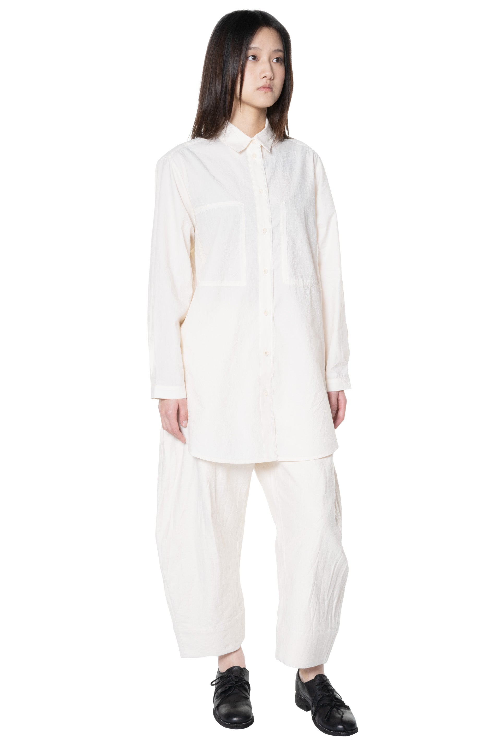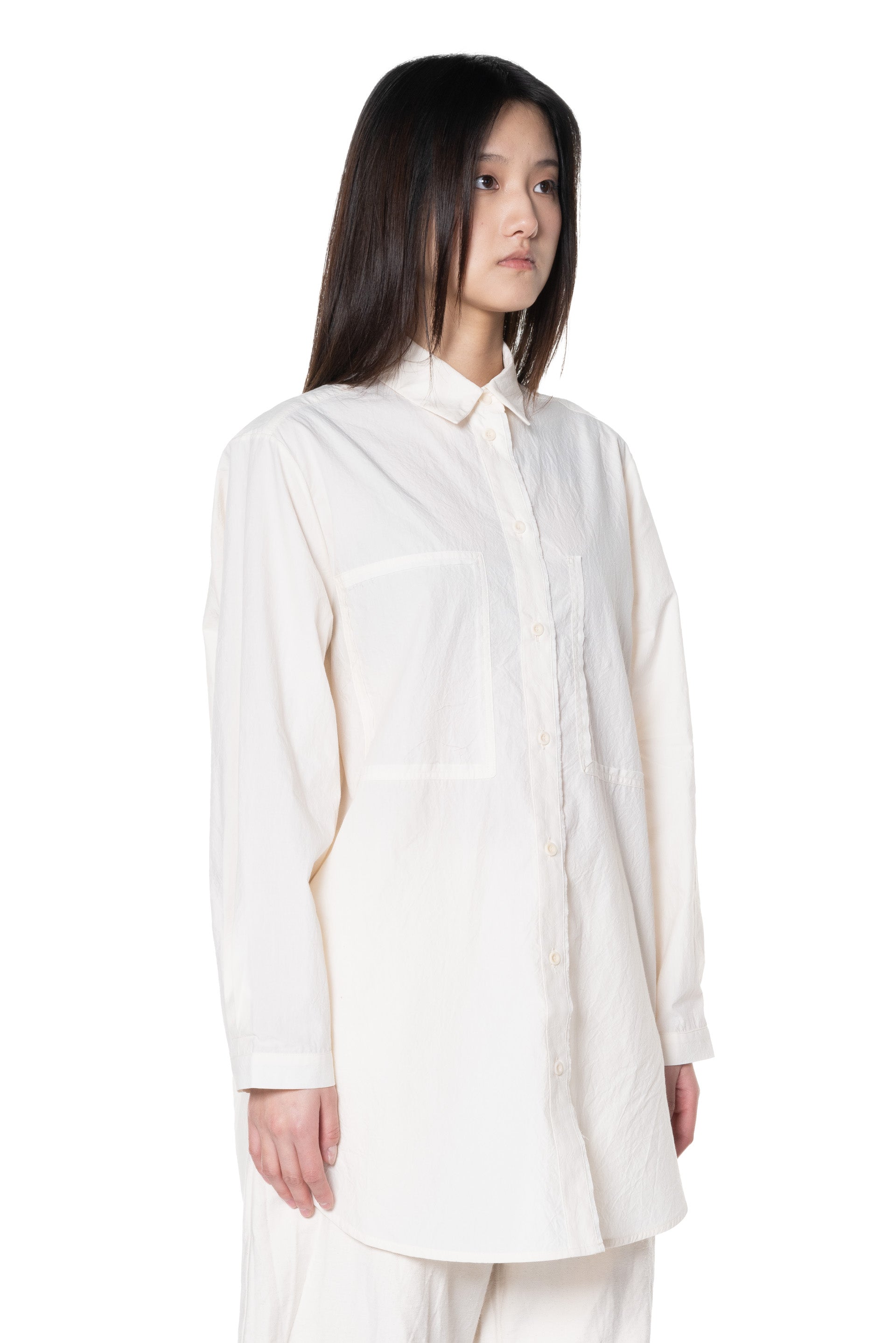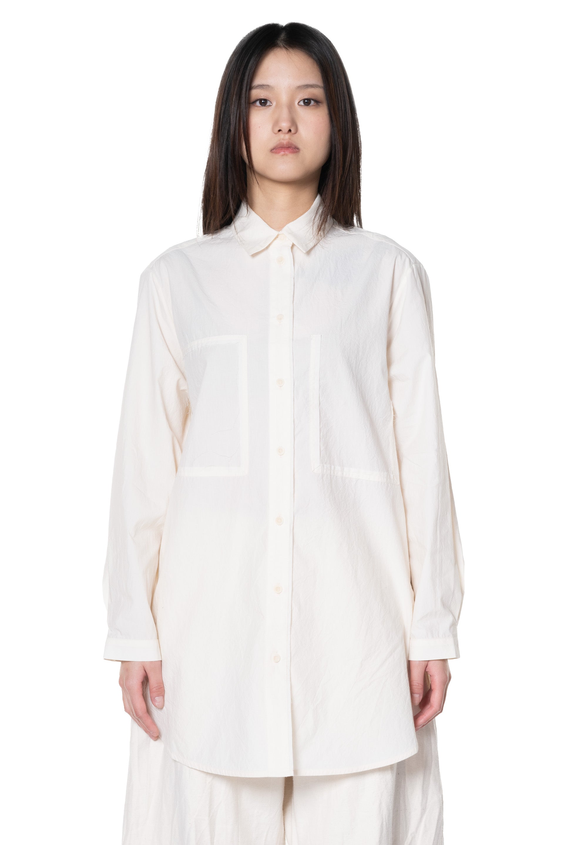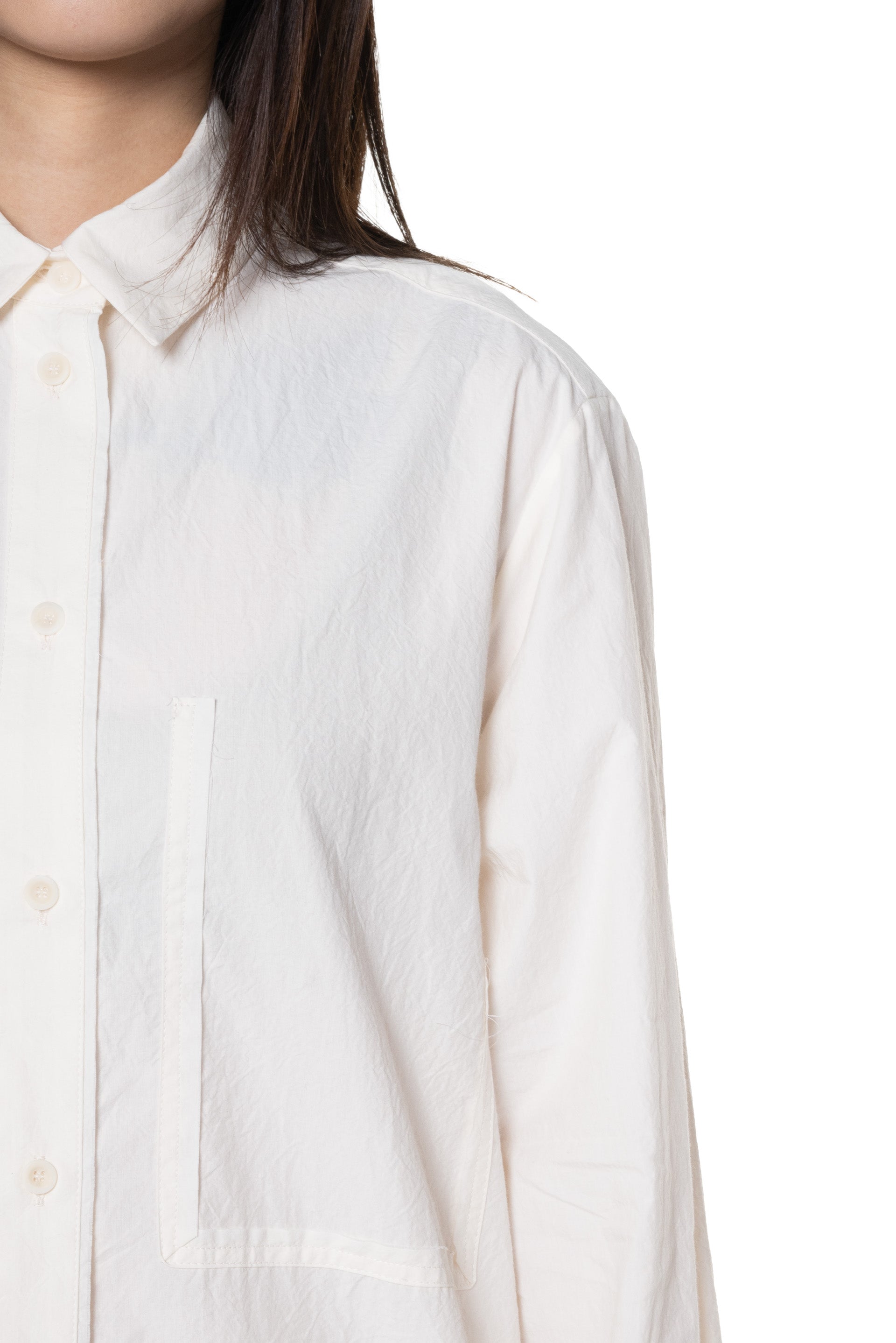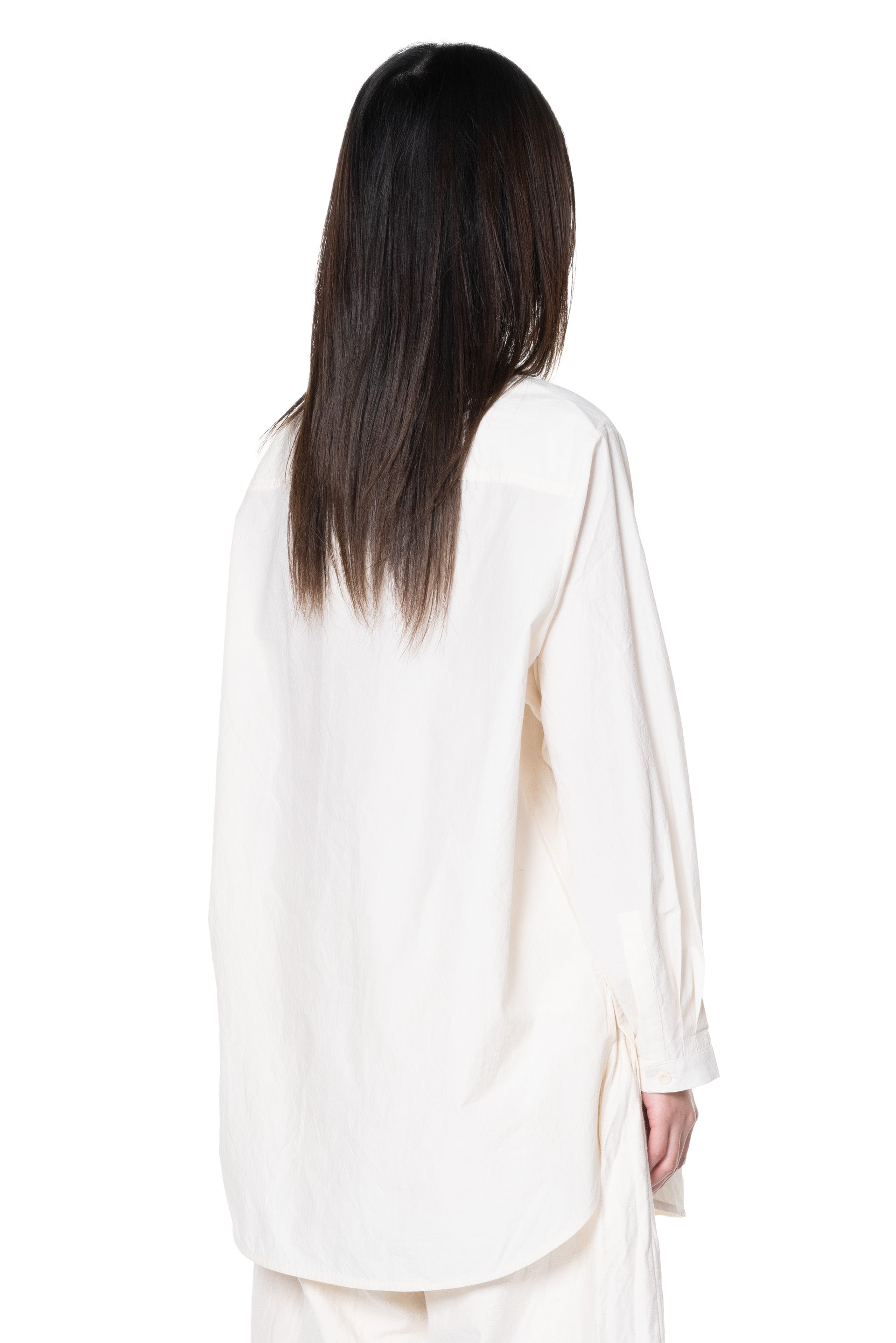Shirt made in fading stripe, a soft lightly textured cotton with an irregular pinstripe gently fading in and out of the weave. Long-line, easy fitting collared shirt. Soft shoulders. Generous side split openings. Deep curved hems. Raw deconstructed pocket and placket detailing, representing the work of the Tailor's trade.