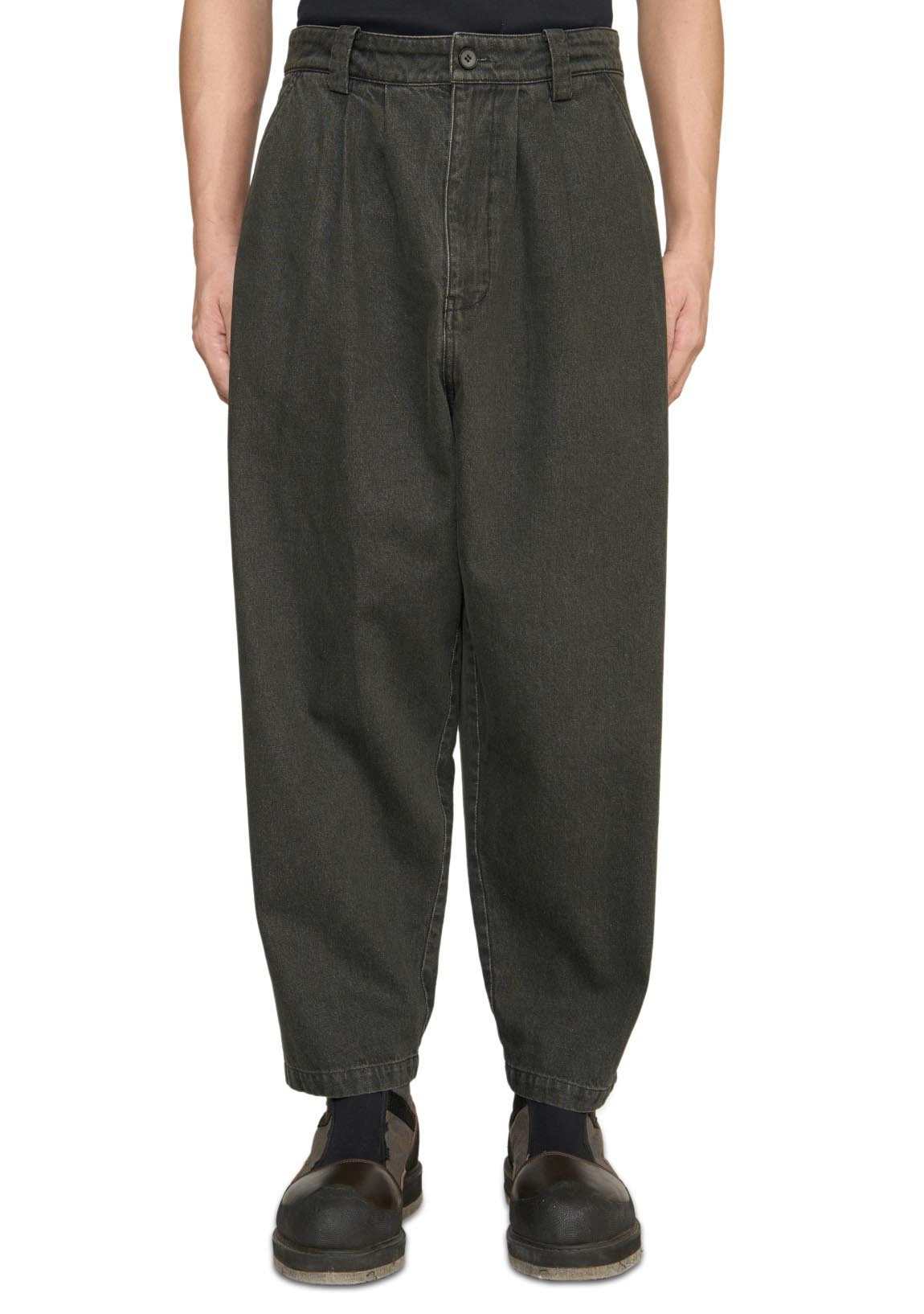 Curved silhouette long pants in stone wash denim. Four pockets. Low inseam. Zip-fly.