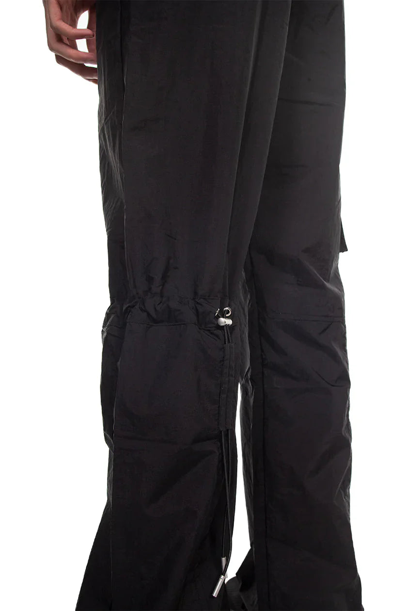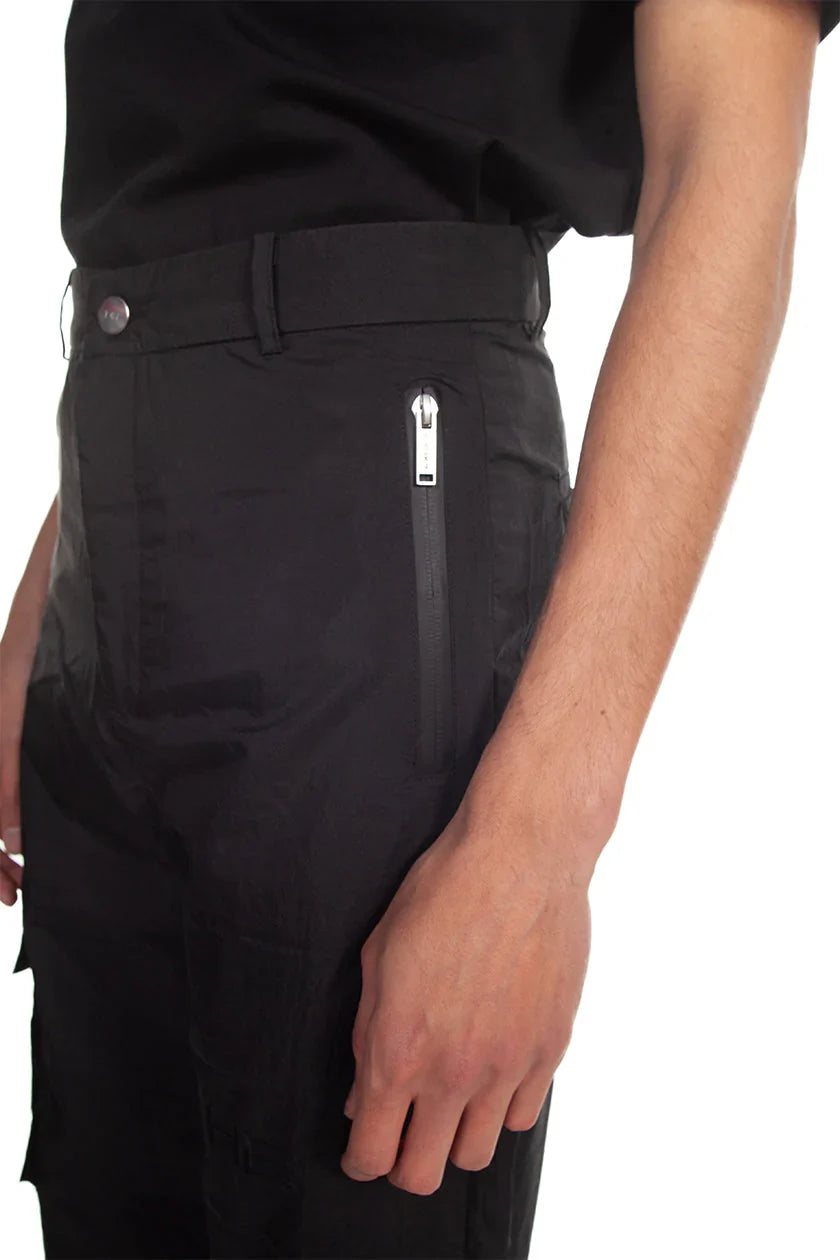 Custom hardware trimmings. Light technical material. Straight fit. Drawstring detail on back left leg. Structured pocket on right leg. Rubberised logo on front left leg. Zipper pockets on front. Pocket on leg.