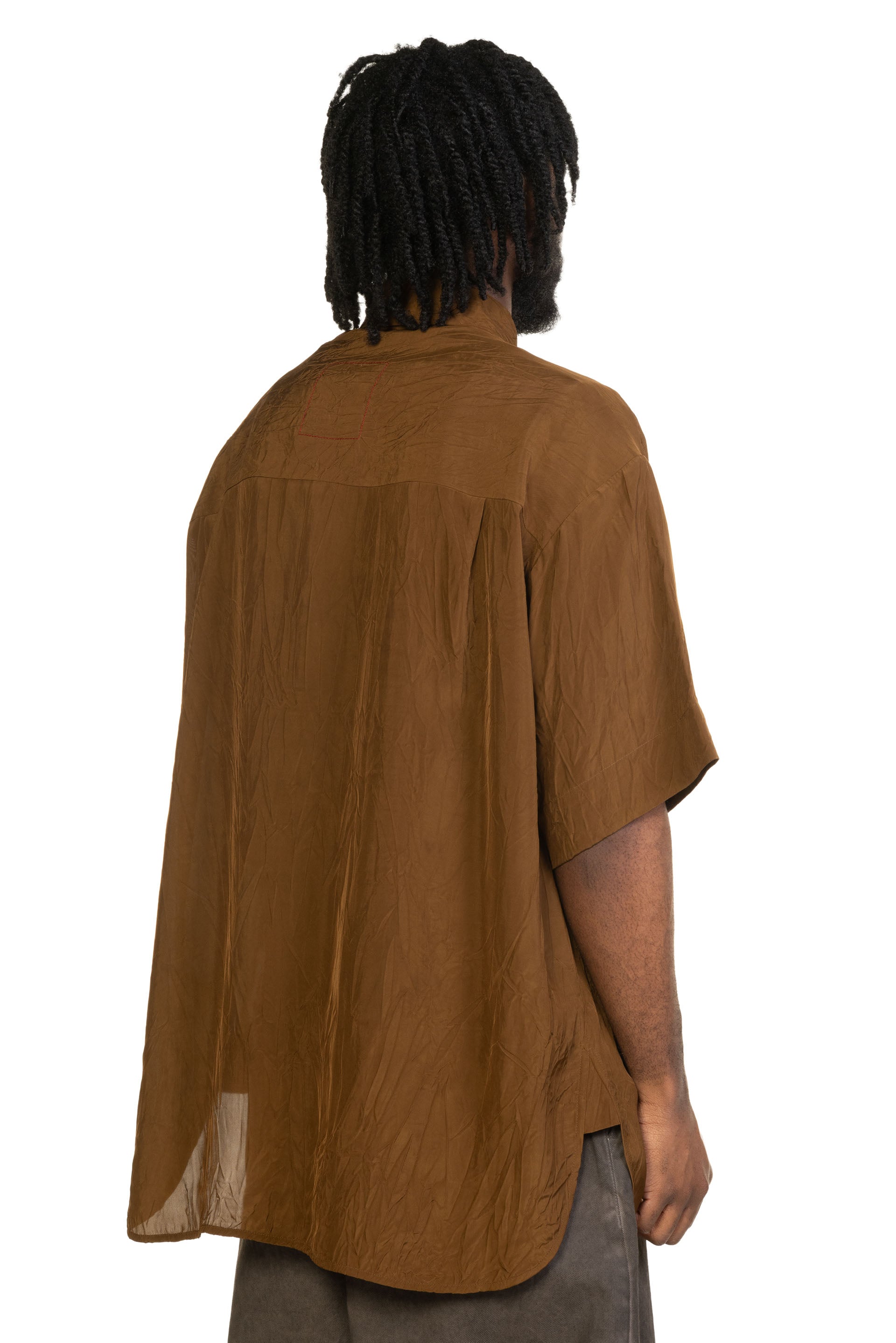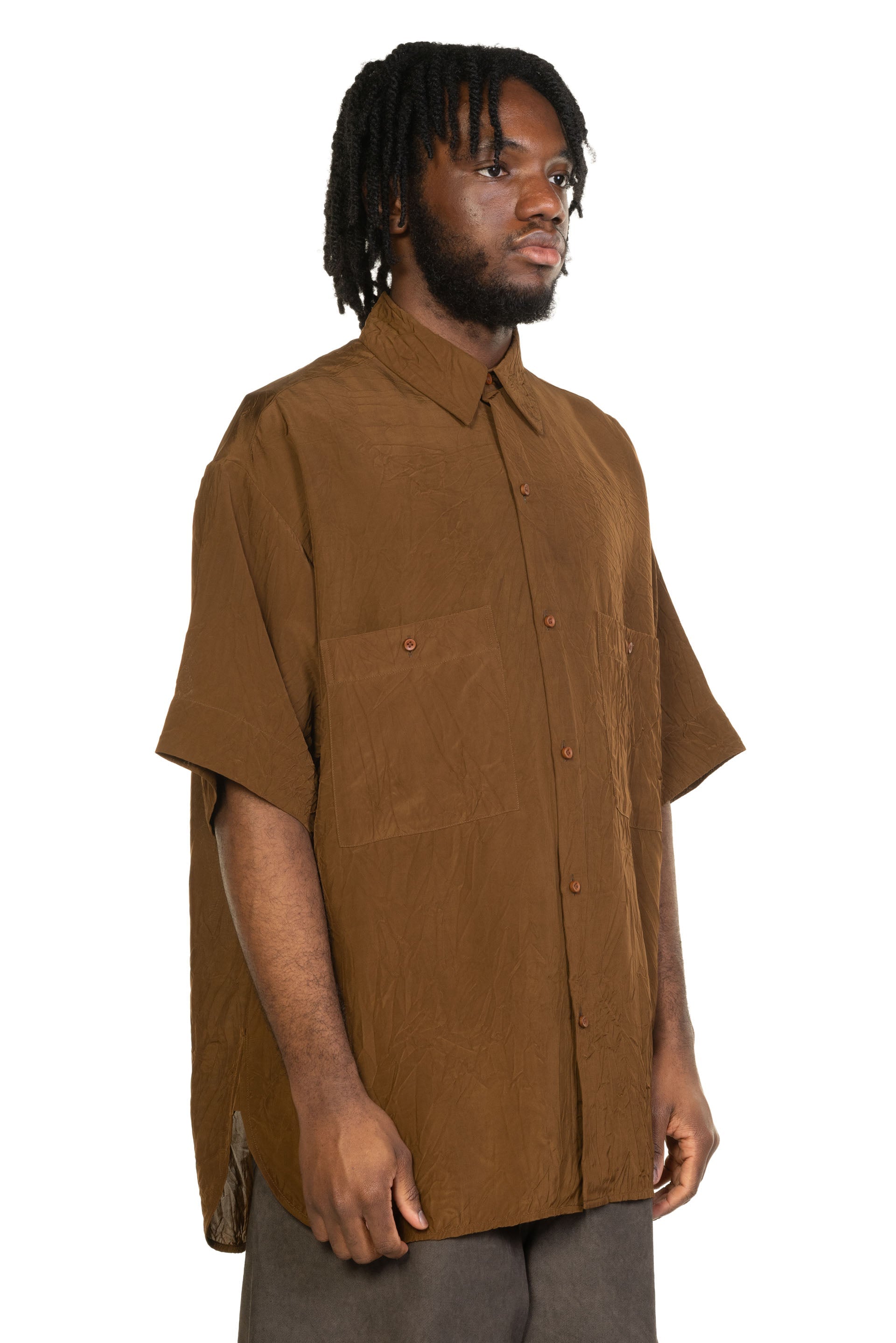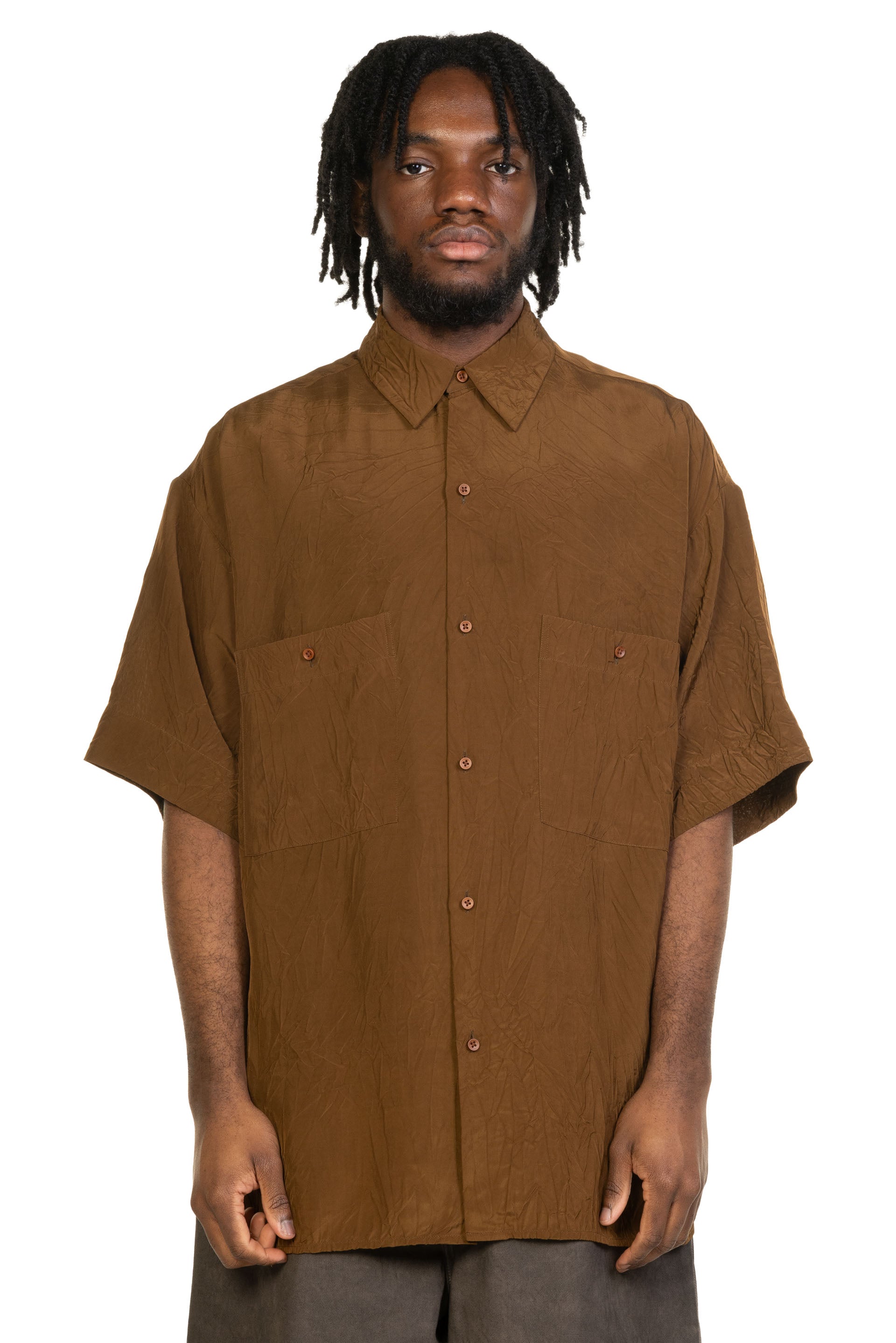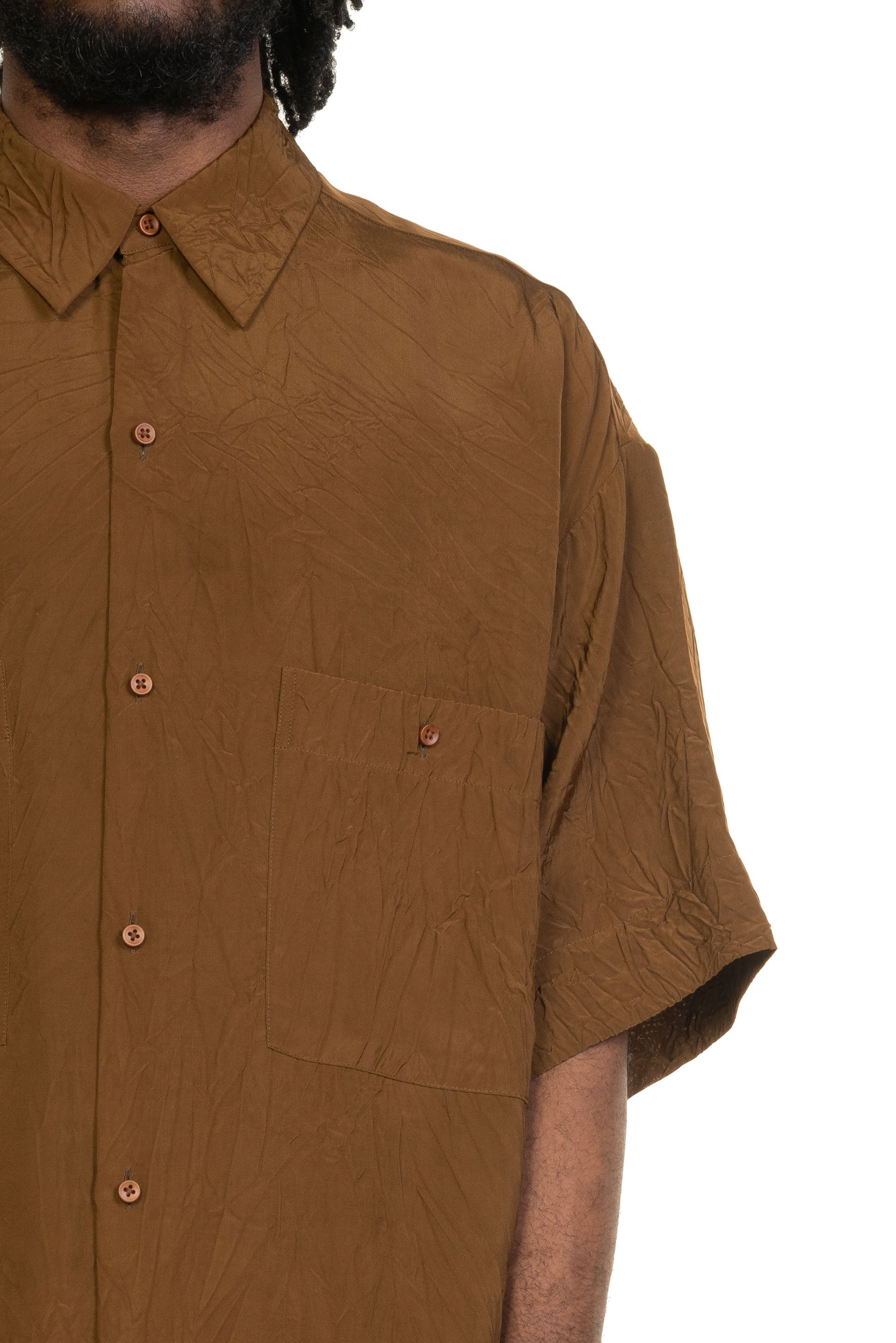 The Teorya Top balances simplicity with texture, featuring a relaxed silhouette and considered detailing. Designed for everyday wear, it reflects Uma Wang’s understated approach to modern menswear. Short sleeves. Button closure at front. oversized fit. Soft and creased viscose fabric. Pocket at front with button closure..