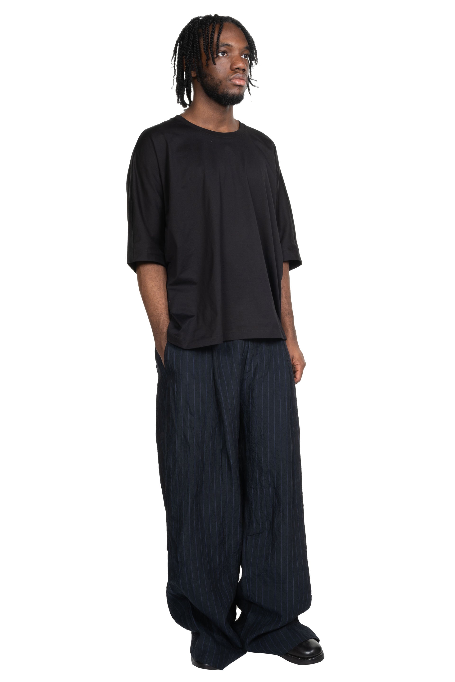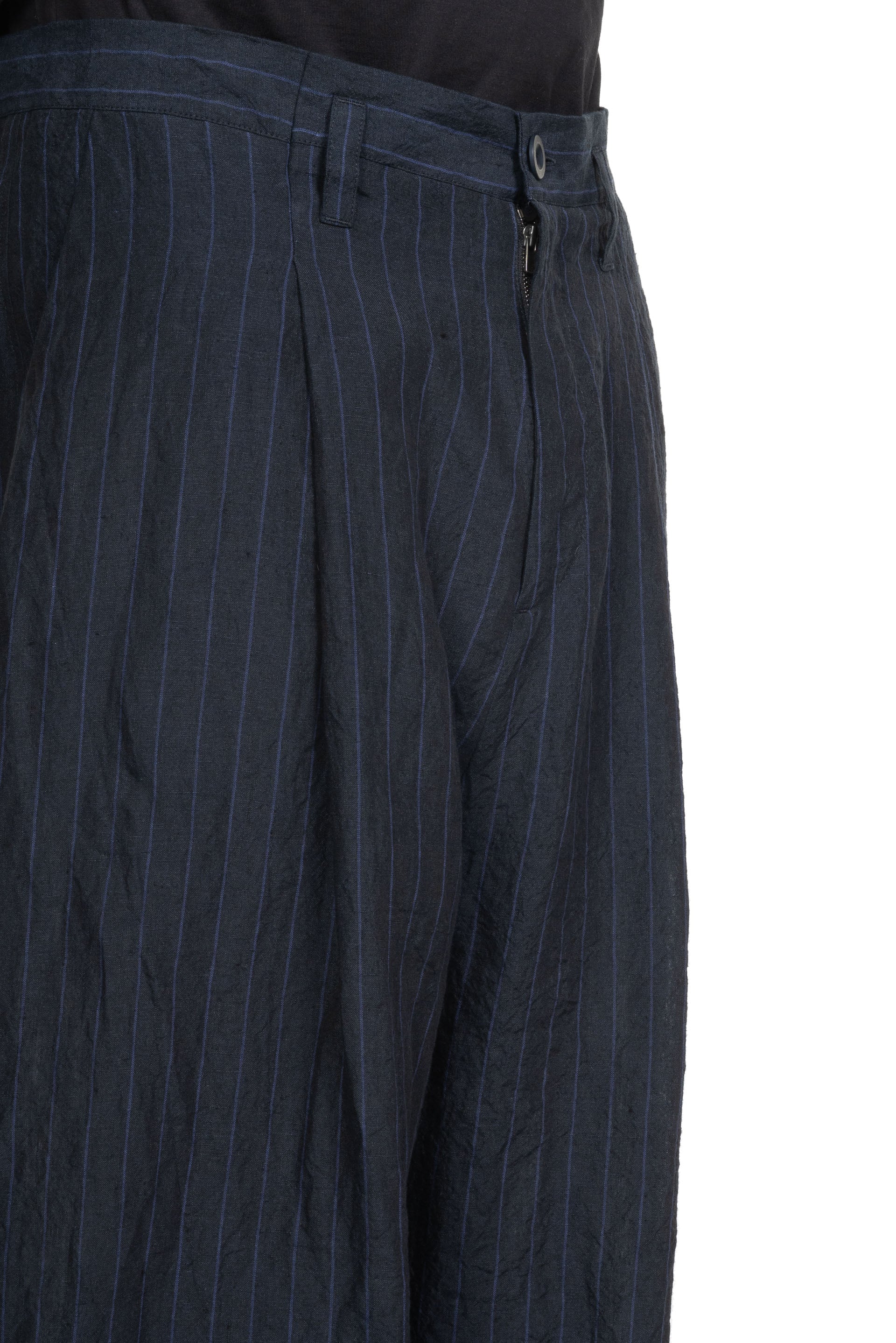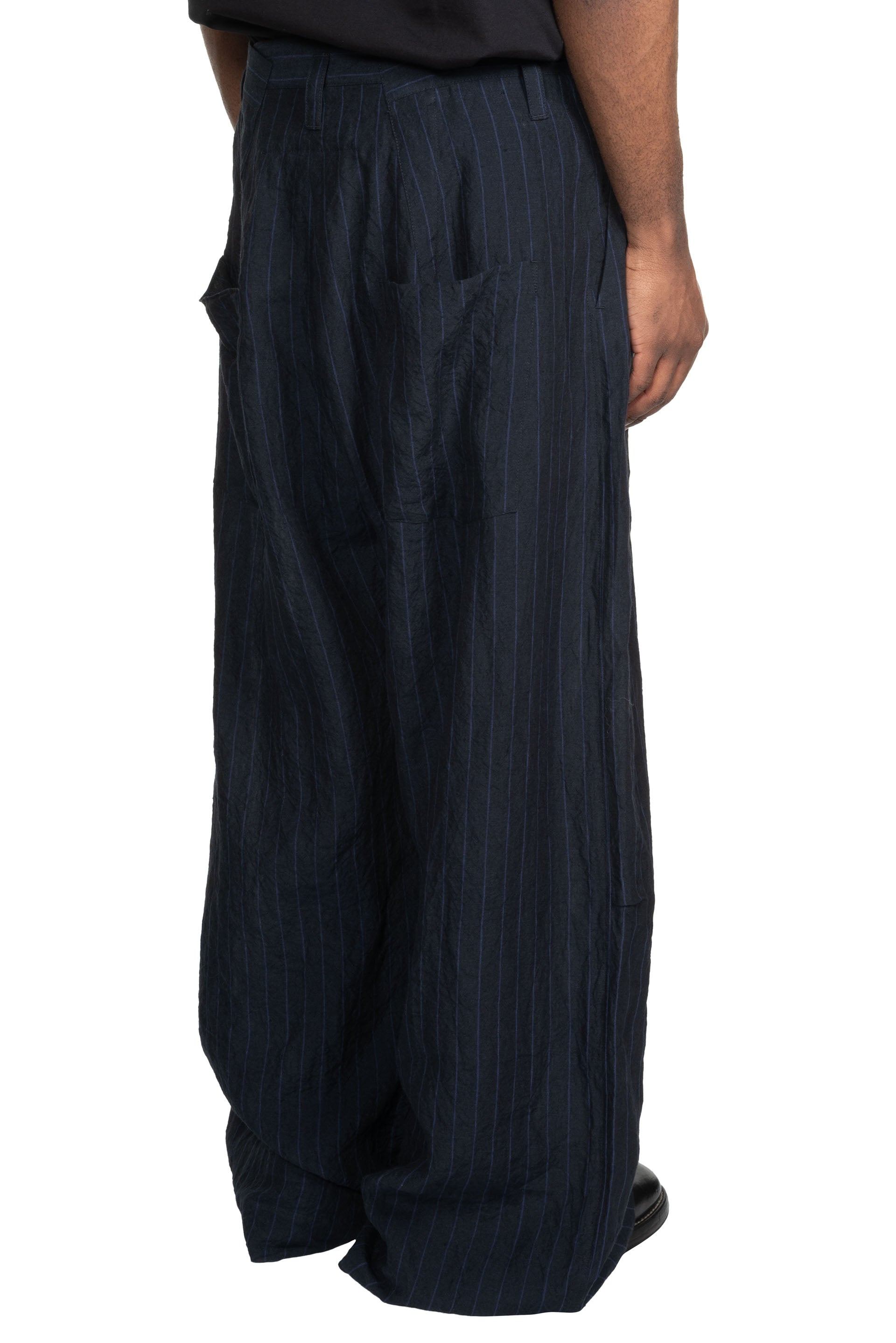 Toogood Potter Trousers in Ink. Crafted from a deep blue Butcher Stripe Linen. Characterful striped linen inspired by the traditional striped aprons of the Butcher's trade. The Potter is a wide full-length volume trouser, with a fitted waistband. The folded pleat detail through the waist creates a generous pleat down the leg and small pinch pleats at the knee creating further sculptural shaping.