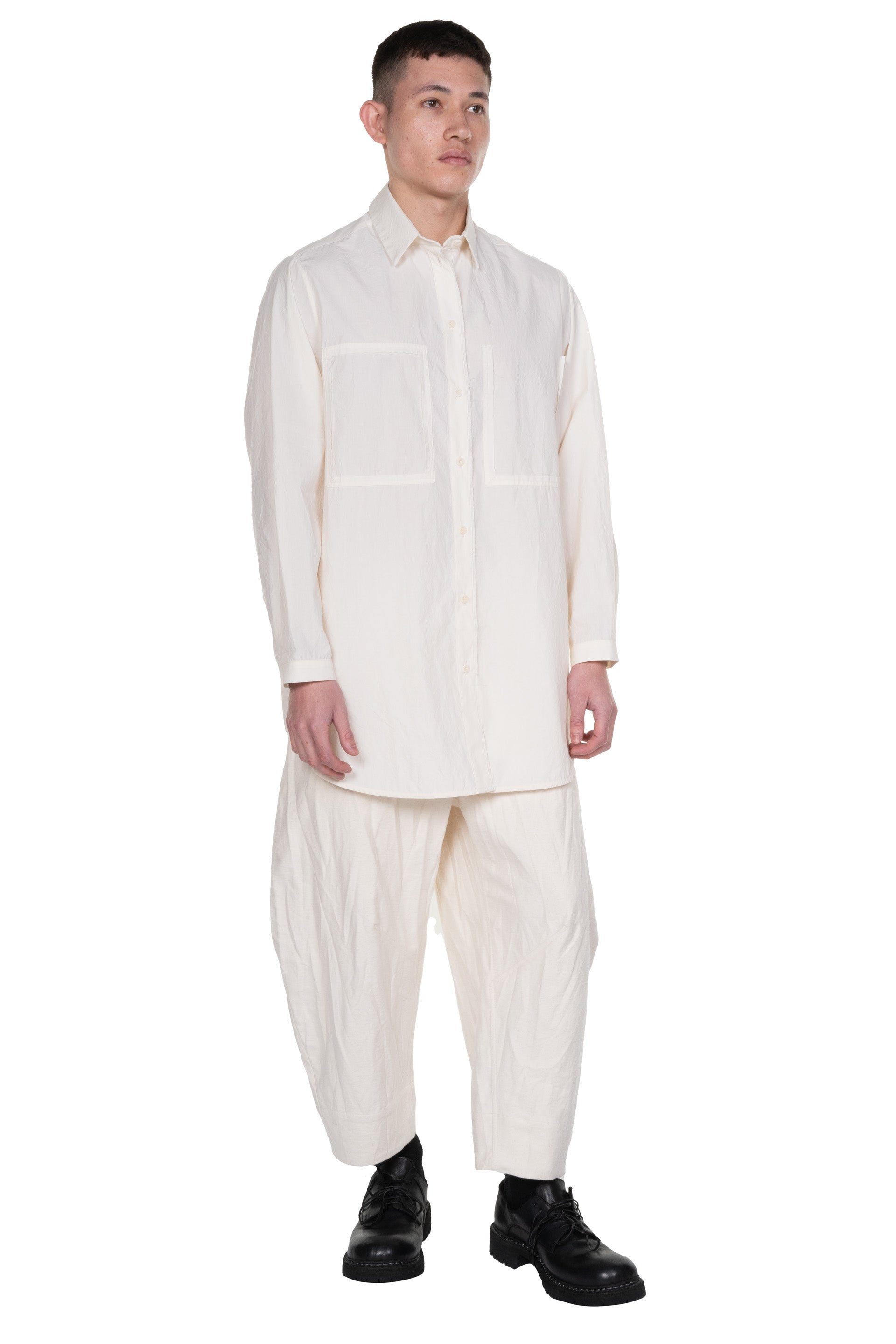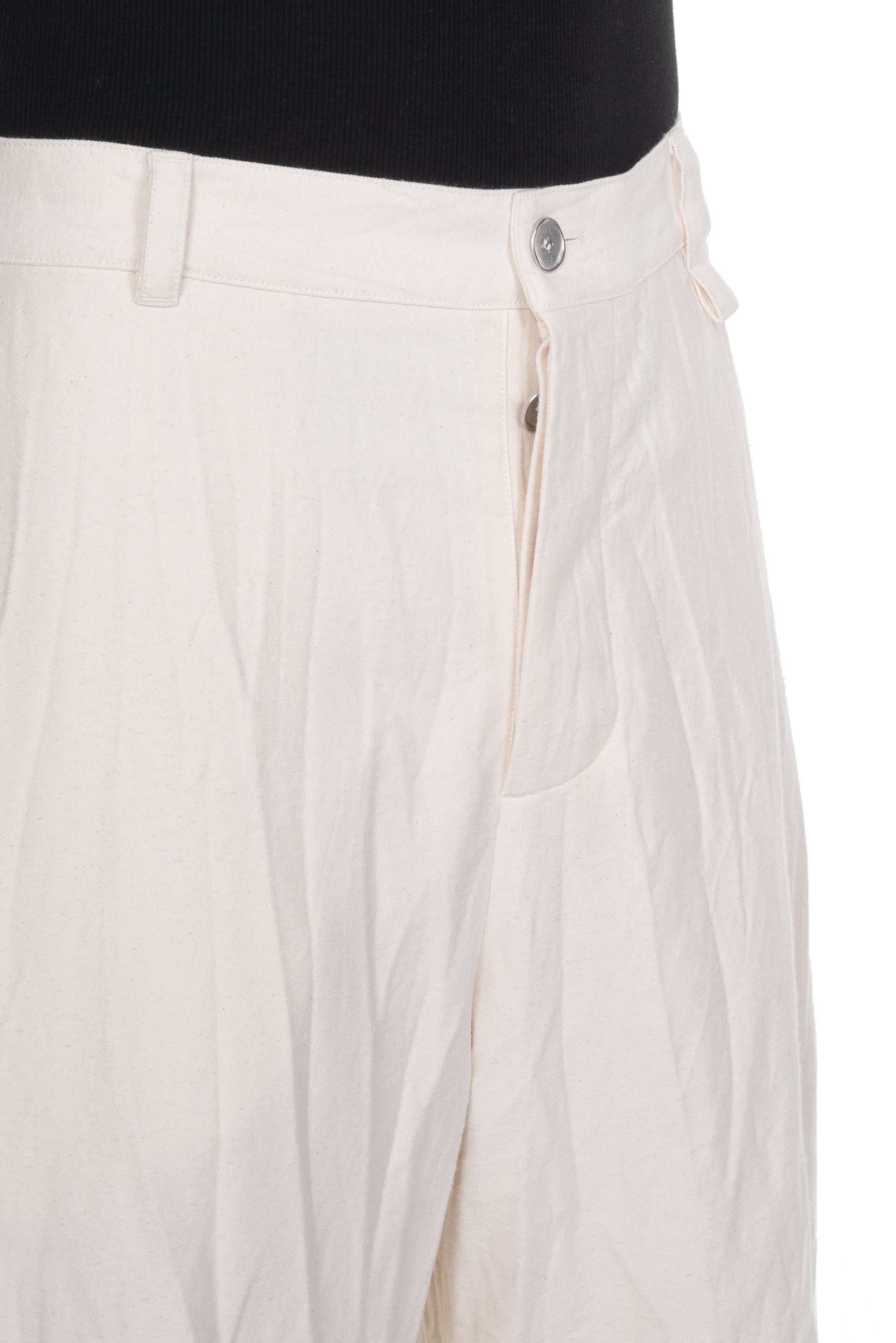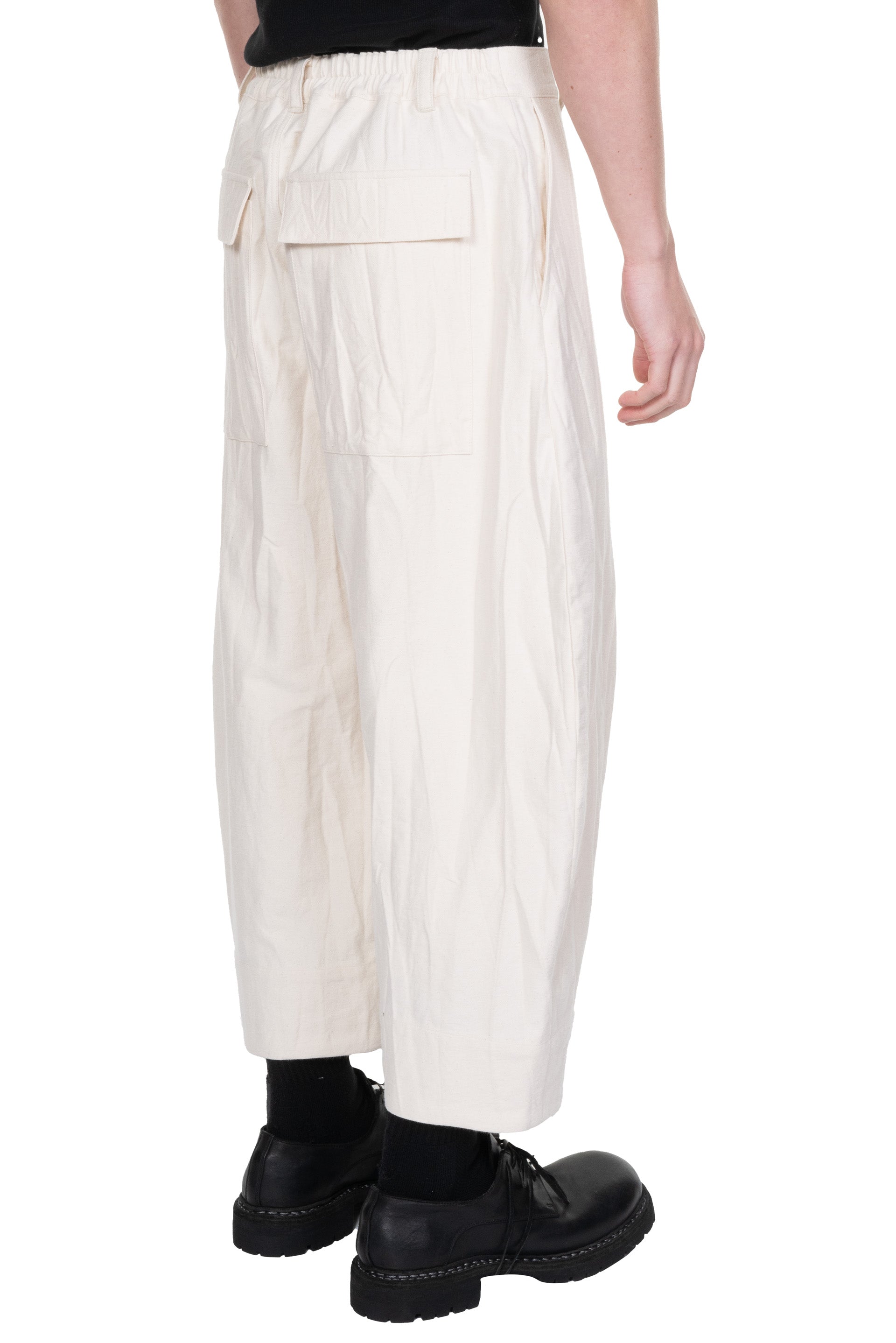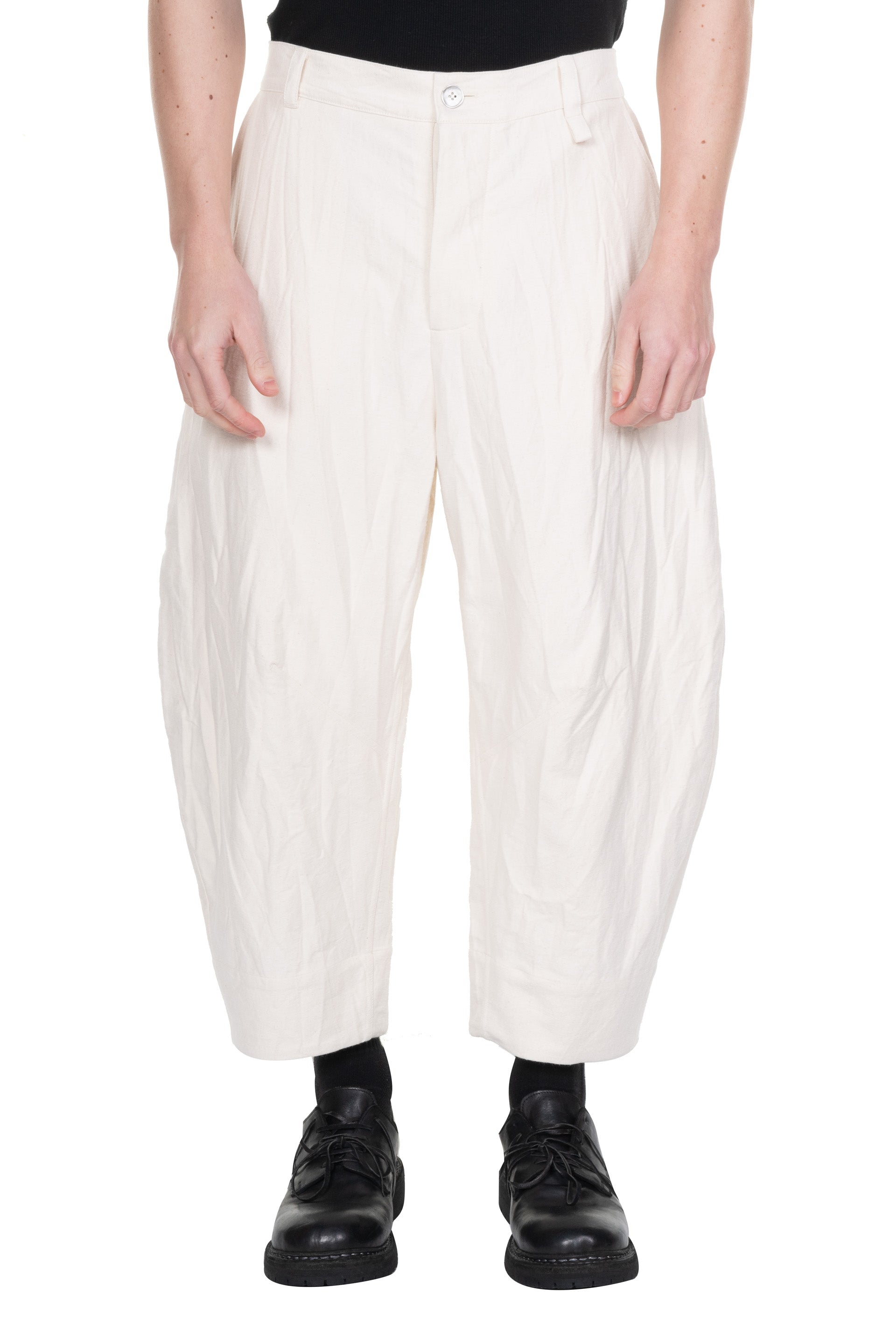Trouser is made of creased cotton twill, a robust yet soft utilitarian fabric with intentional creases engineered into the construction of the fabric, giving a lived-in feel.