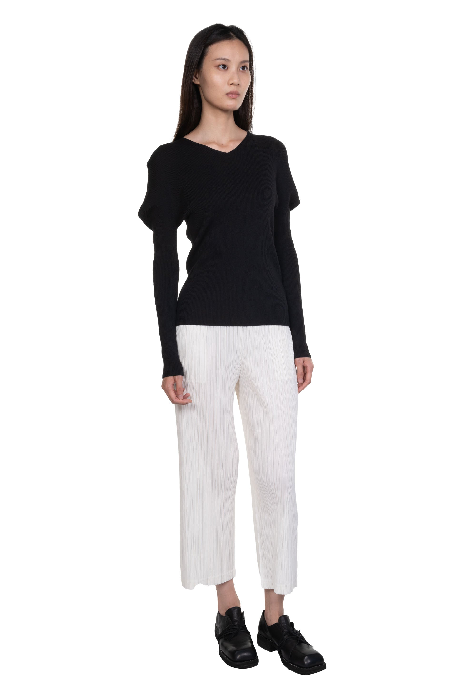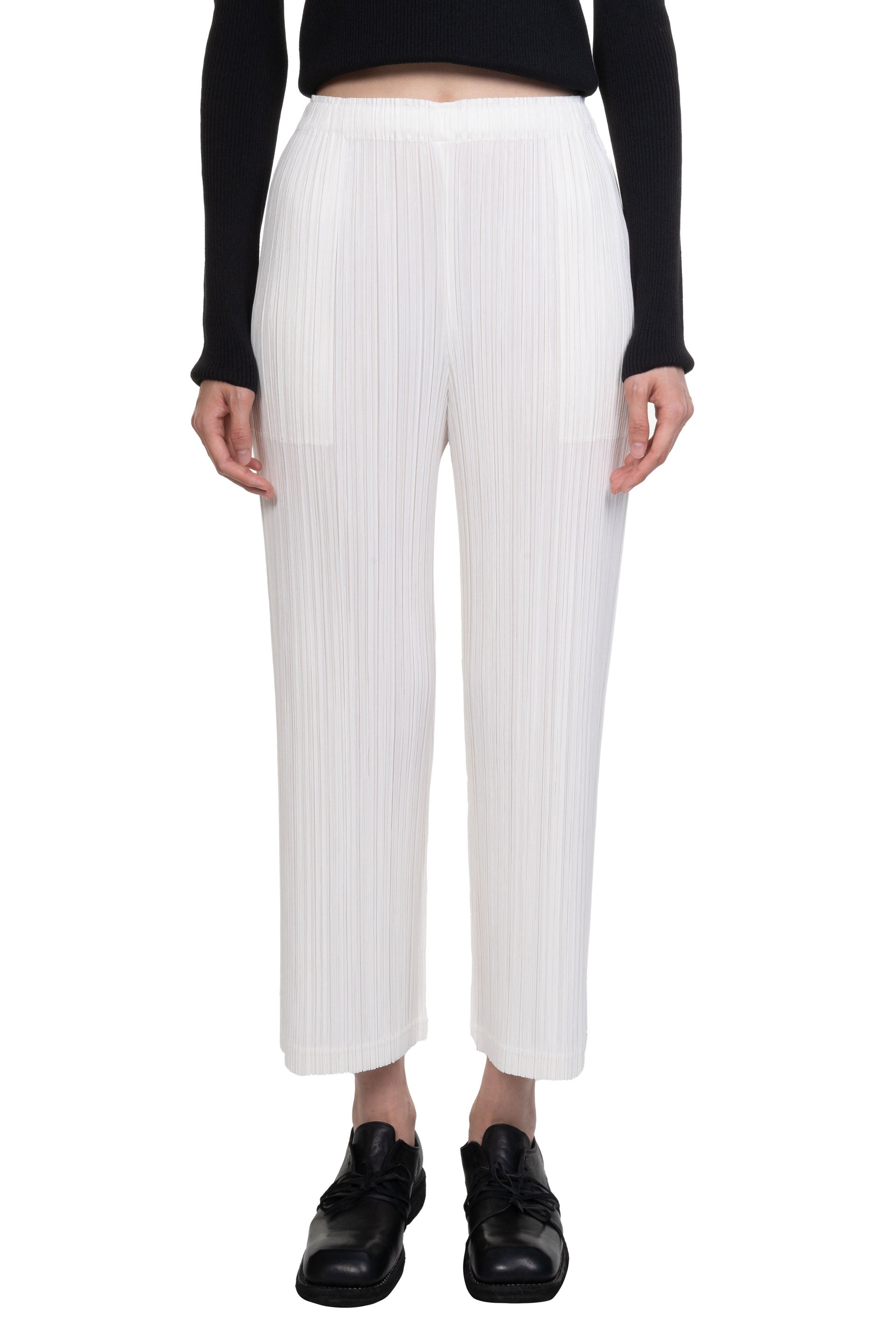 Pleats Please is crafted from a single thread, then creases are added after the clothes have been sewn into shape offering a combination of convenience, comfort and coolness. Pleats Please designs are simple with a strong silhouette as seen with the Thicker Bottoms 1 Off White.