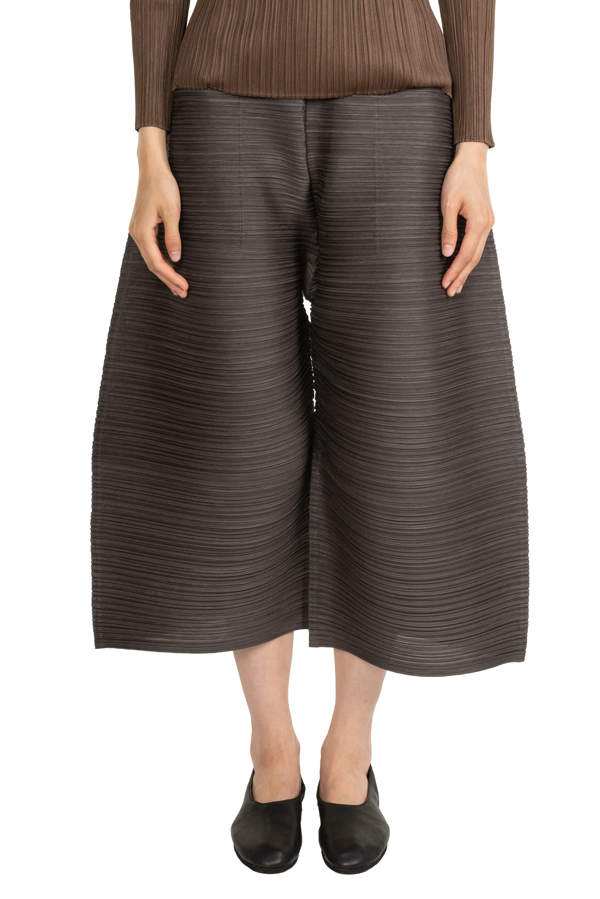 Pleats Please cropped, horizontally pleated trousers in steel grey have a voluminous silhouette, an elasticated waistband and side pockets.