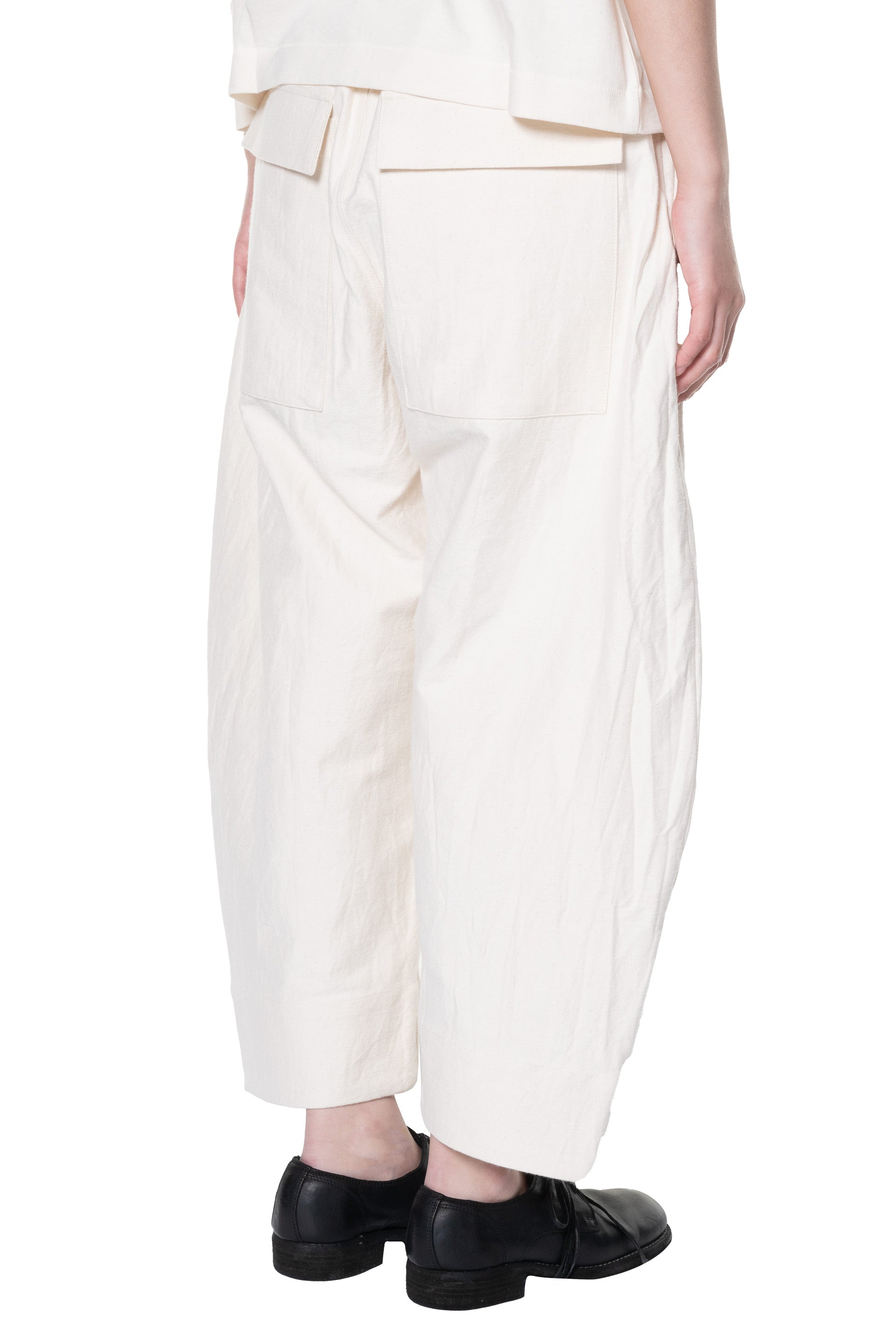 Cropped trouser. Sculptural curving shape tapering from the knee. Flat waistline at the front. Elasticated at the back for ease and comfort. Two large patch pockets on the back and hammered metal buttons to close.