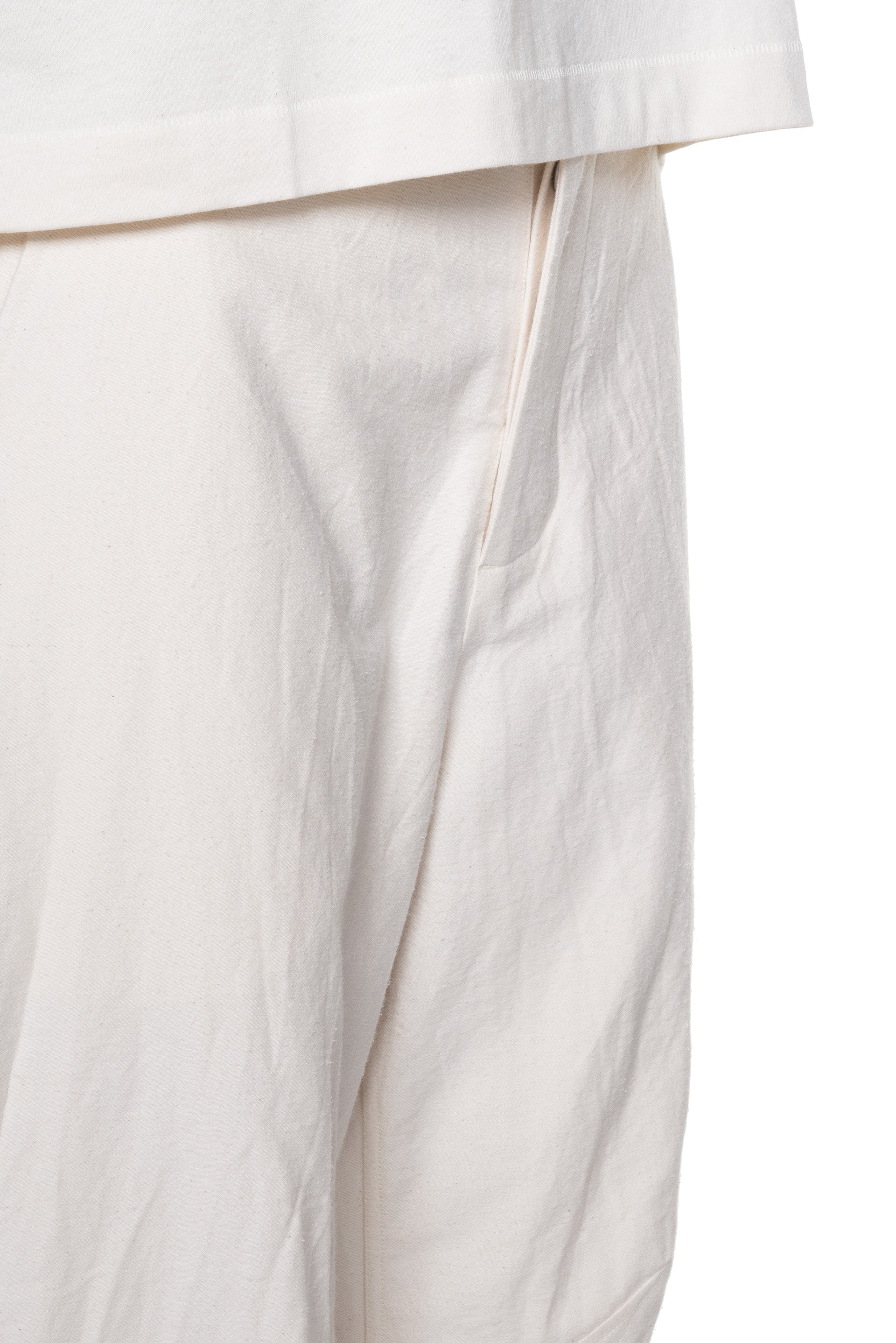 Trouser is made of creased cotton twill, a robust yet soft utilitarian fabric with intentional creases engineered into the construction of the fabric, giving a lived-in feel.