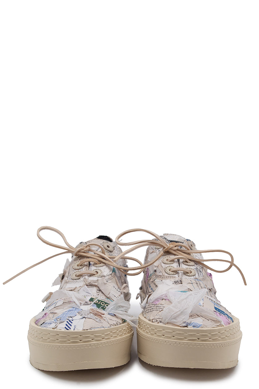 Oxford design with all over trash collage. Suede upper. Japanese plonge leather lining. Sewn on/ hand painted vegetable tanned eyelets. 3.4mm hand stitched/hand painted vegetable tanned leather sidewall. Eva midsole. Poron insole. Svig brand Italian outsole.