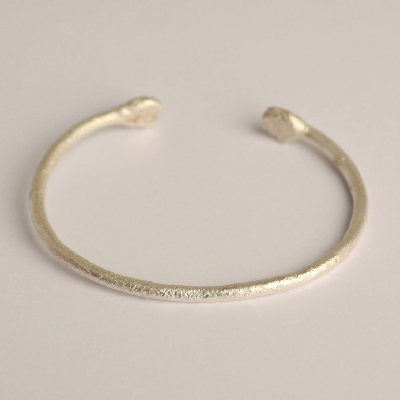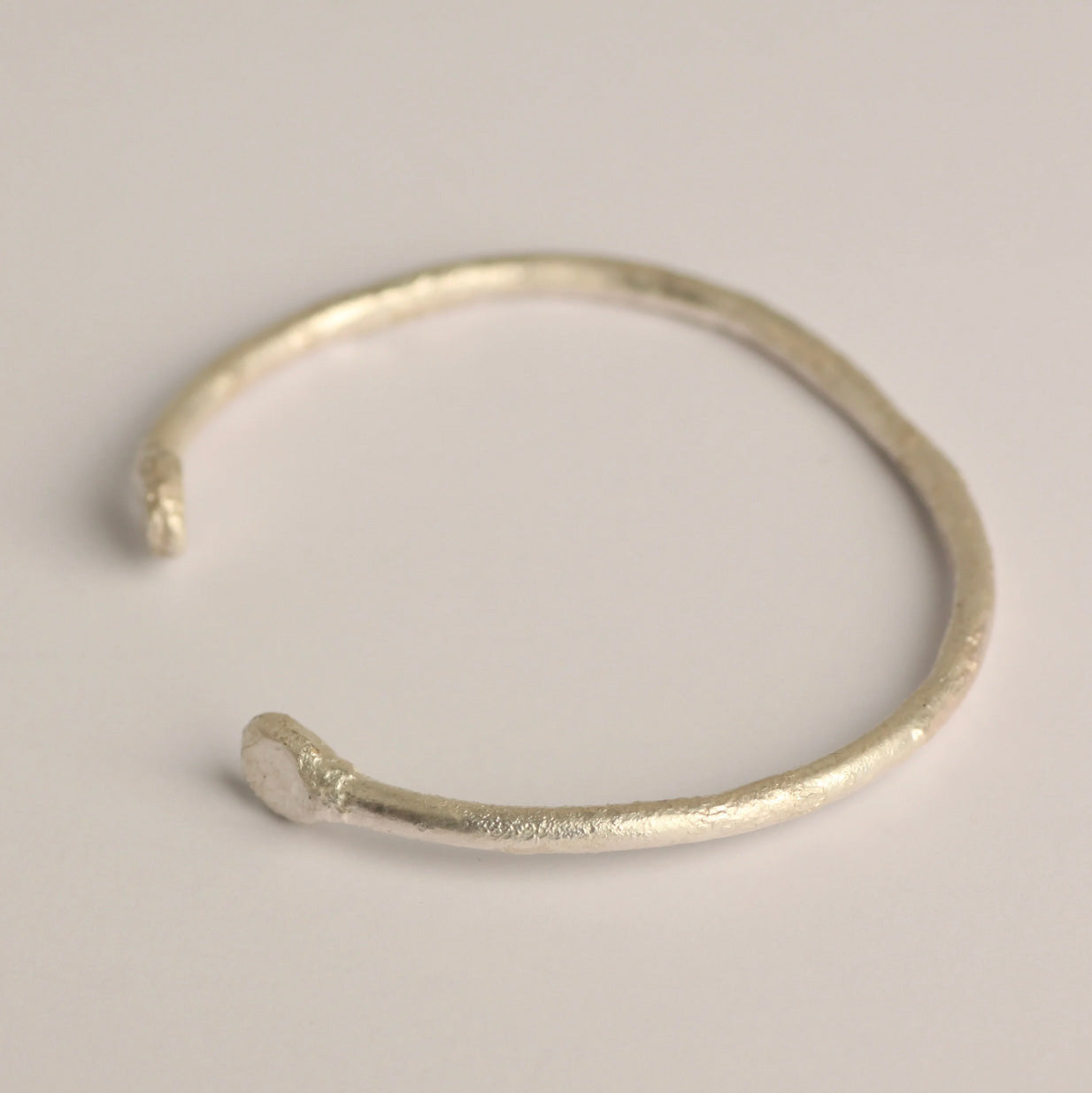 The iolom Tree Branch Bangle reflects the organic irregularity of natural forms. Shaped using traditional metalworking techniques, its sculptural profile and mat white finish emphasise texture, imperfection, and material honesty.