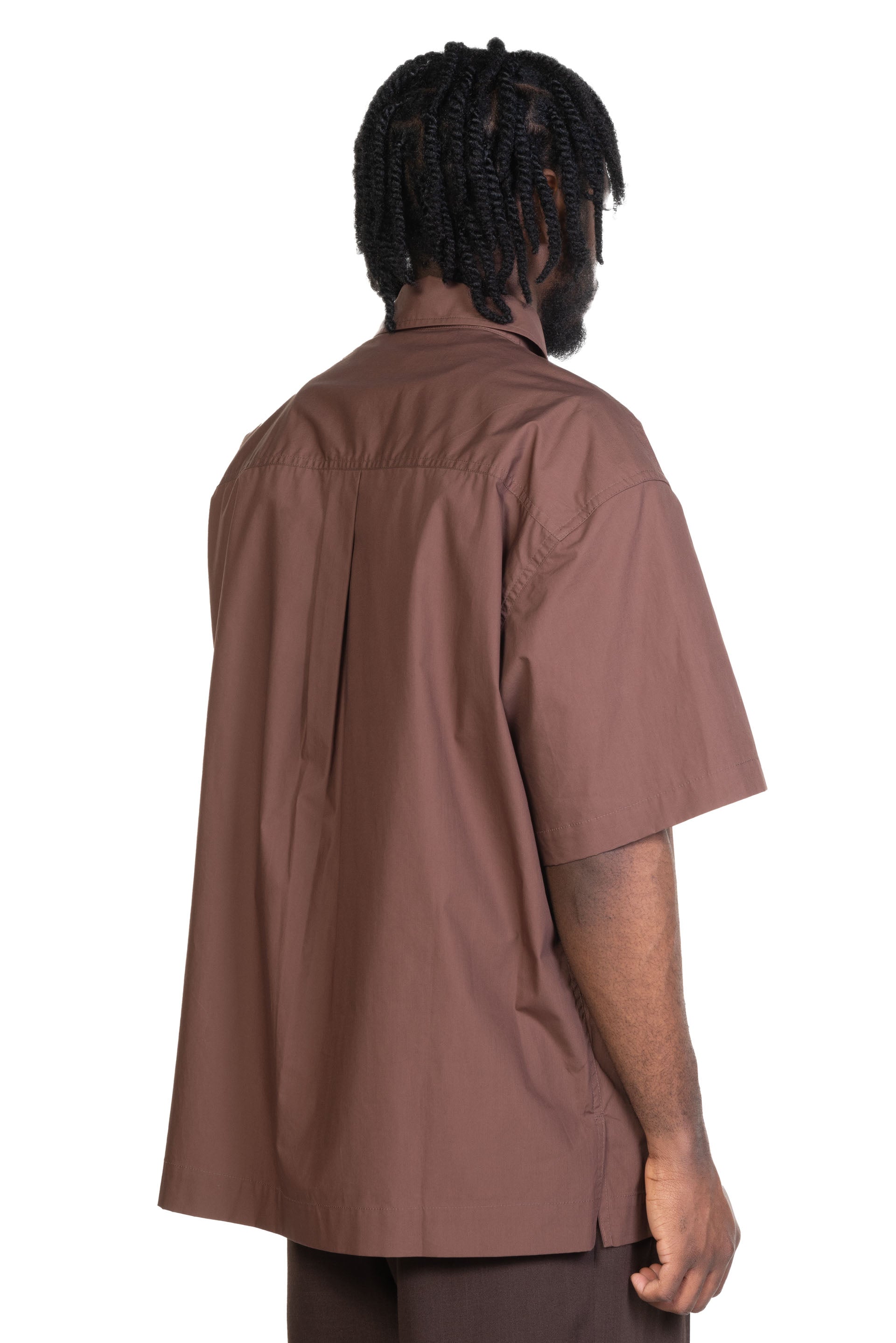 Feng Chen Wang Short sleeve shirt in Brown. Short sleeves. Button closure at front. Triple cut details at collar and sleeves. Slit at side. Pleat at back. Boxy cut.