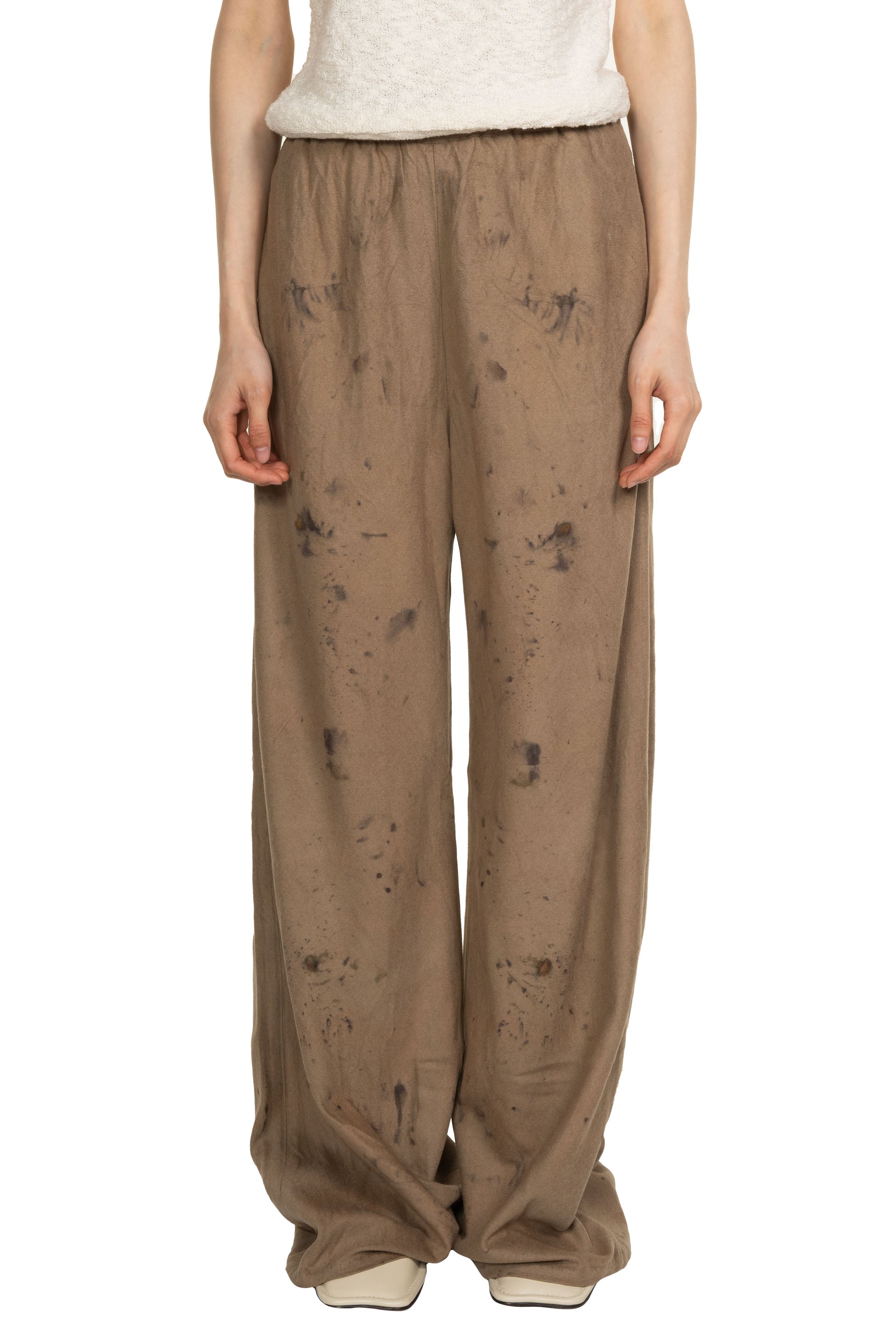 Yu Qun believes that everyone's character is multi-faceted and expressing spiritual independence. Fine hand-stitched threads, old mottled colours and patterns, and unconventional cuts are what Mute Dance has been exploring. The leaves and stems of fresh plants and berries, dried medicinal materials, old metals and so on are combined with the ancient and traditional dyeing technology to dye fabrics and paper as seen with the Trousers Celadon.