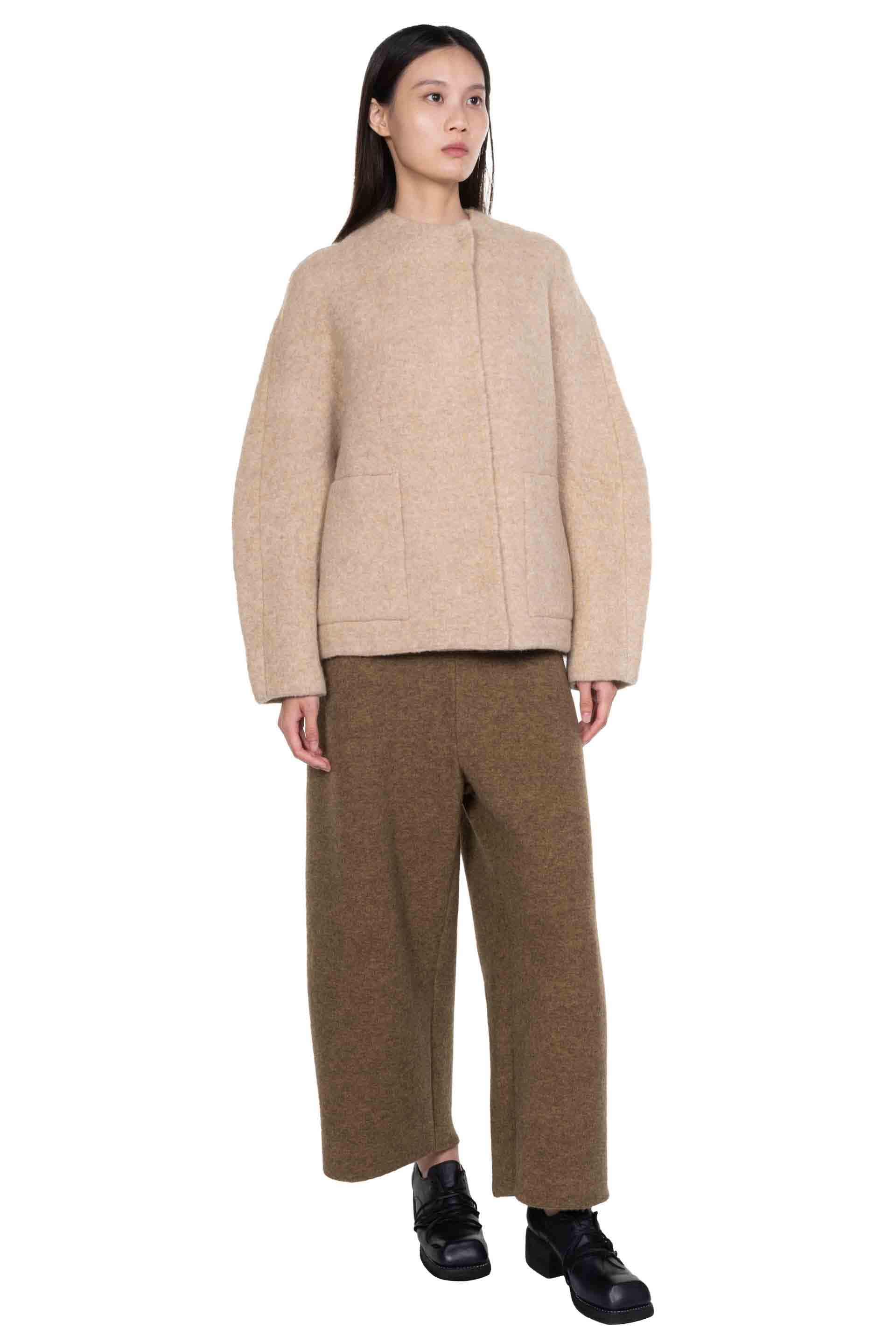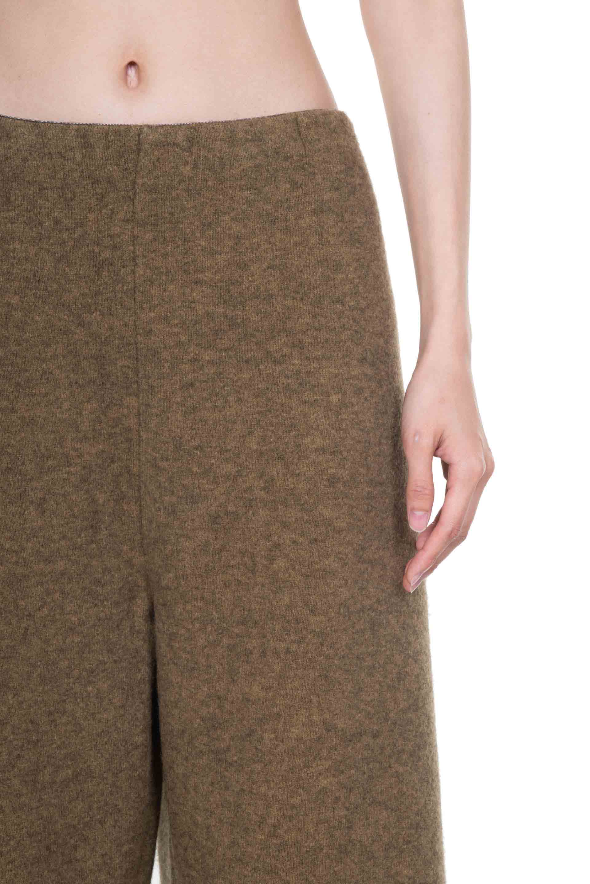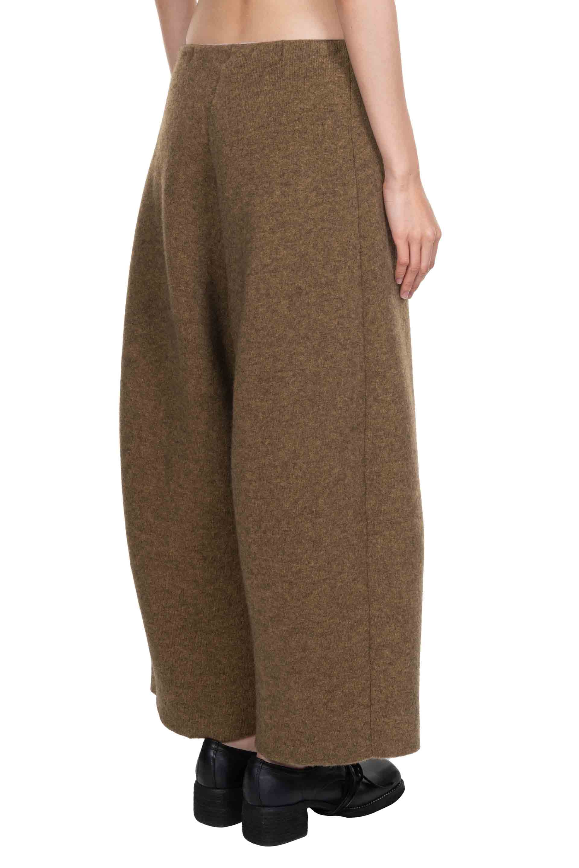 Olive Yak wool Trousers from Boboutic. Elastic waist. Wide fit. Signature Yak mix. Soft textural fabric. Lightweight.