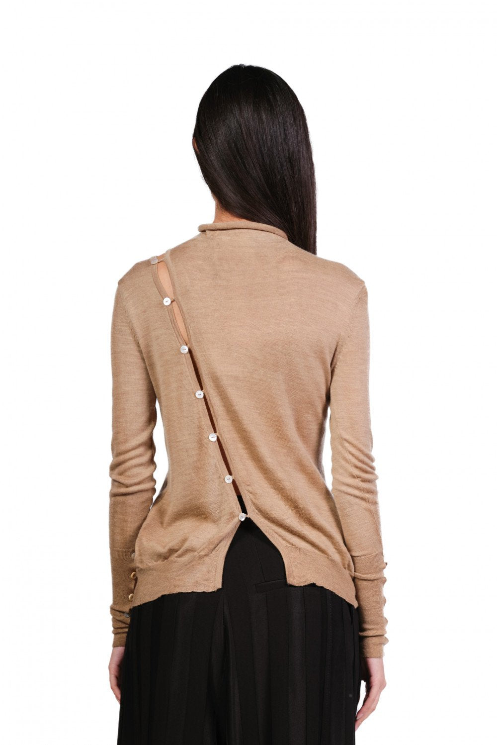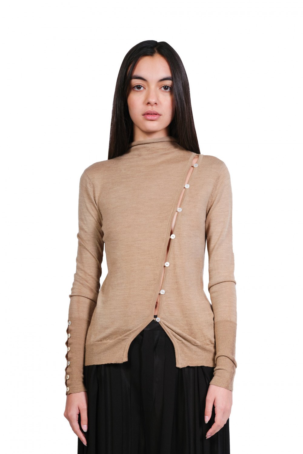 A Tentative Atelier focuses on crafting idiosyncratic collections where each piece of clothing has its own identity, creating a timeless and romantic look as seen in the Turtleneck Buttoned Sweater.
