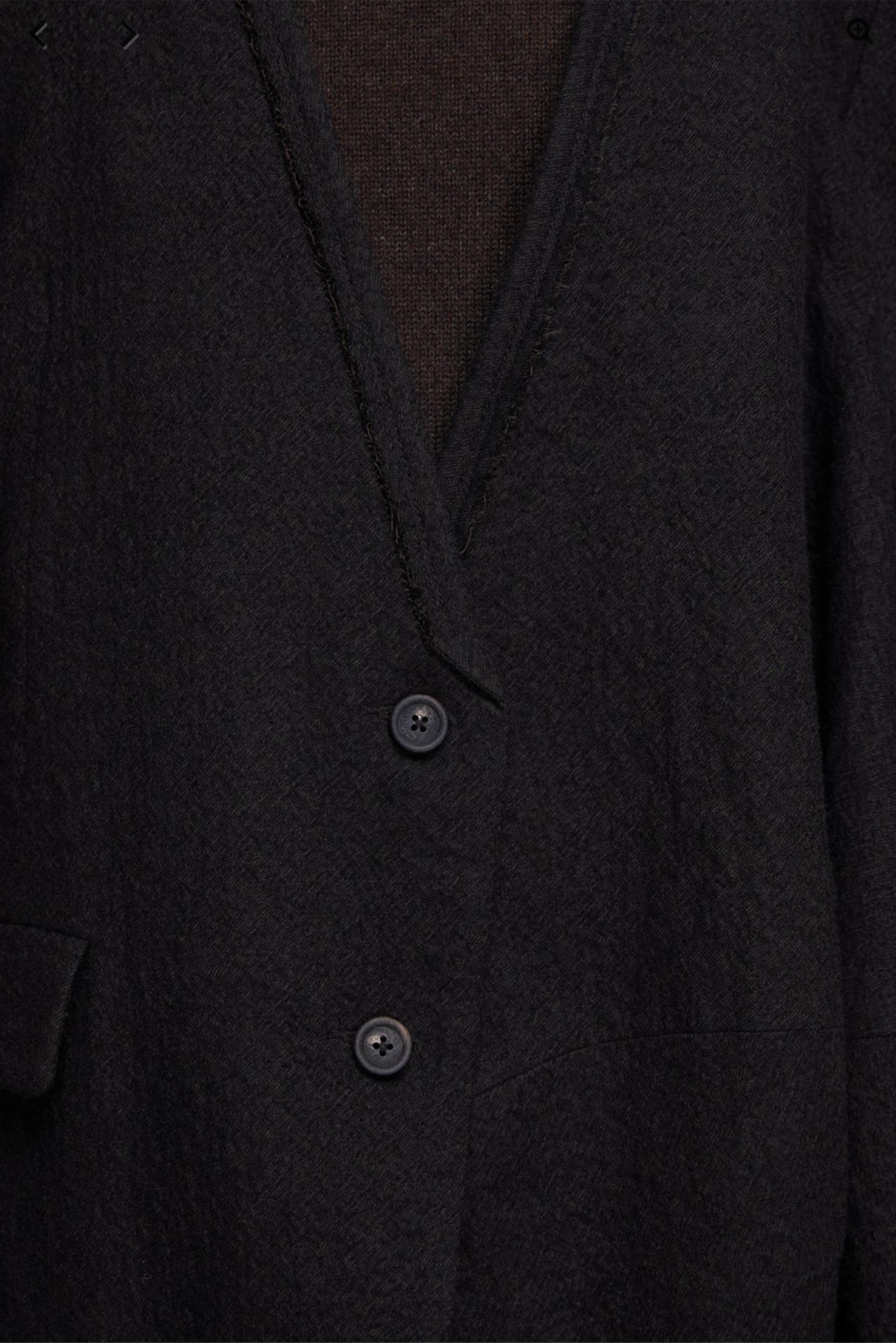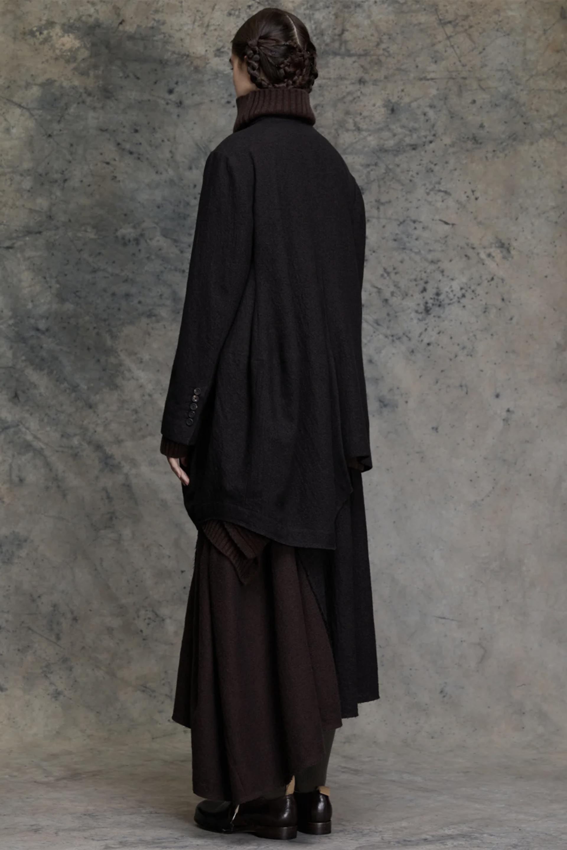 Regular fit. Below hip length. Slim tuxedo collar. Asymmetrical lower hem. Single front pocket. Two button closure. Fully lined.