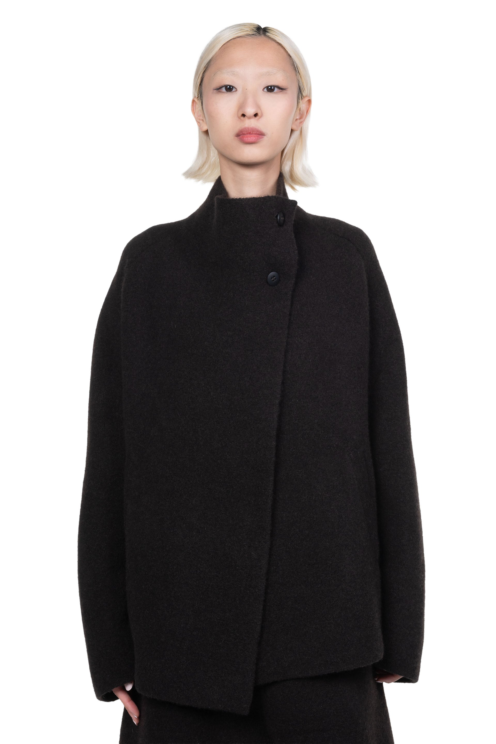 Boboutic consider knits an ideal medium, since its versatility allows conceiving unique surfaces and unexpected shapes. The approach to knitwear is unpredictable, aiming at creating a product where materials and structures compensate each other as seen with the Two Button Jacket Moro.