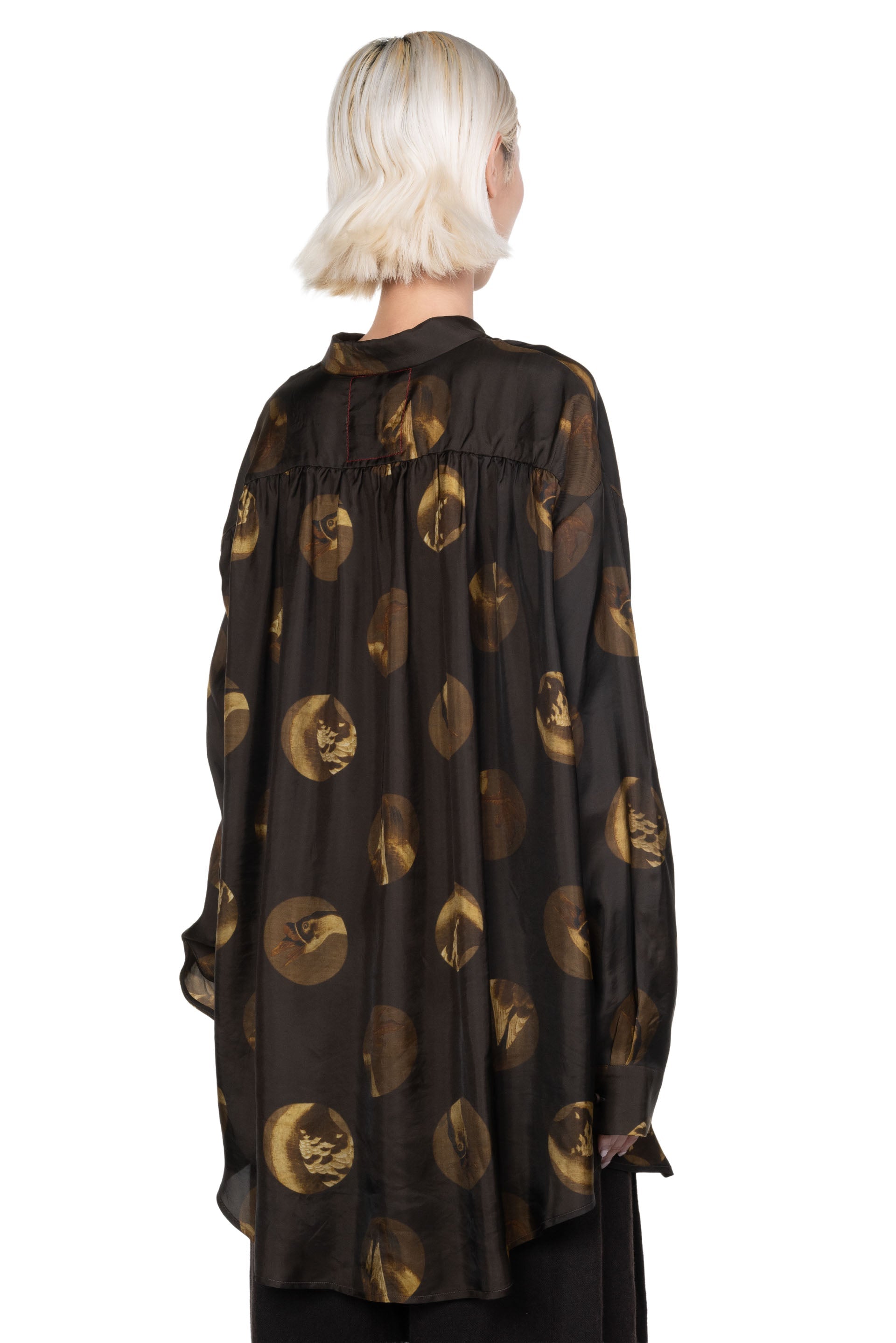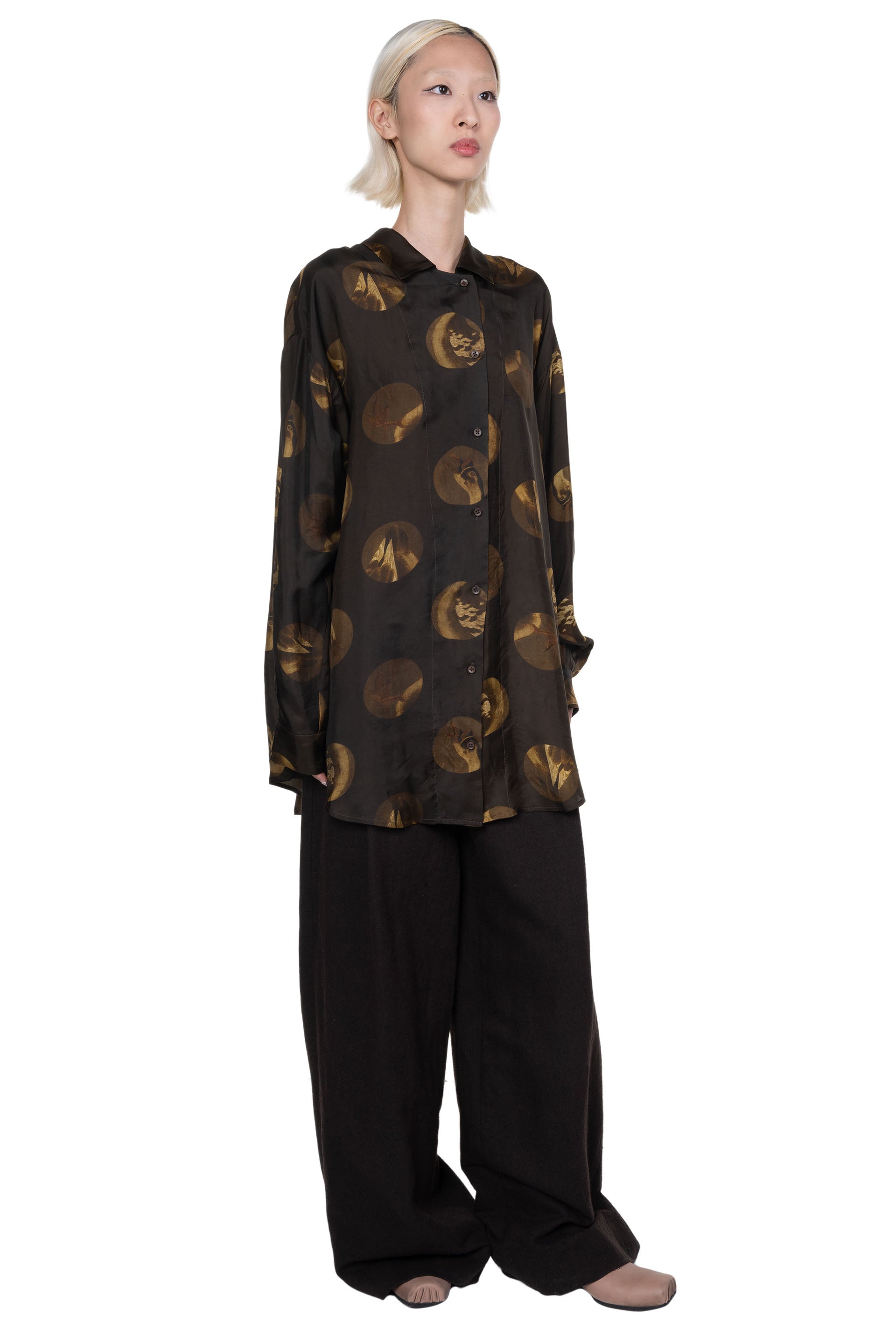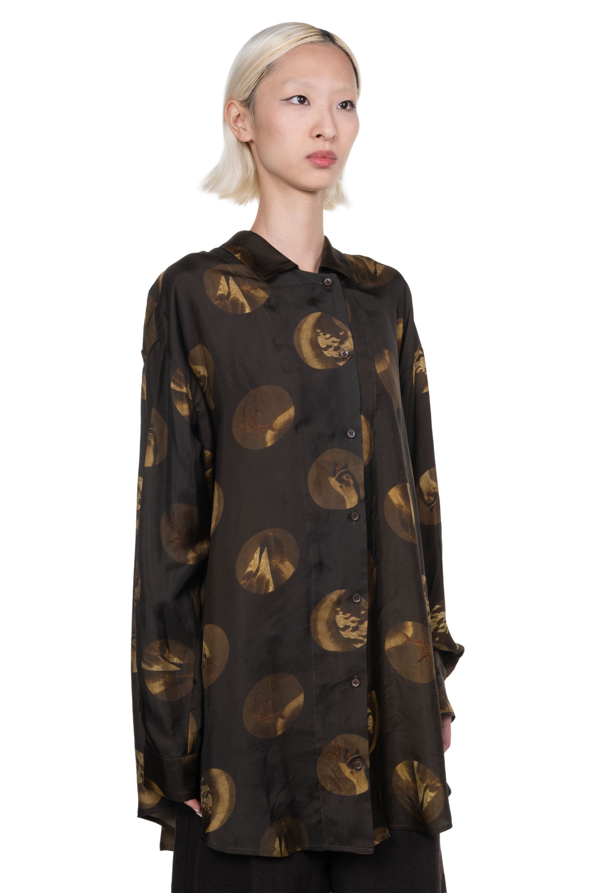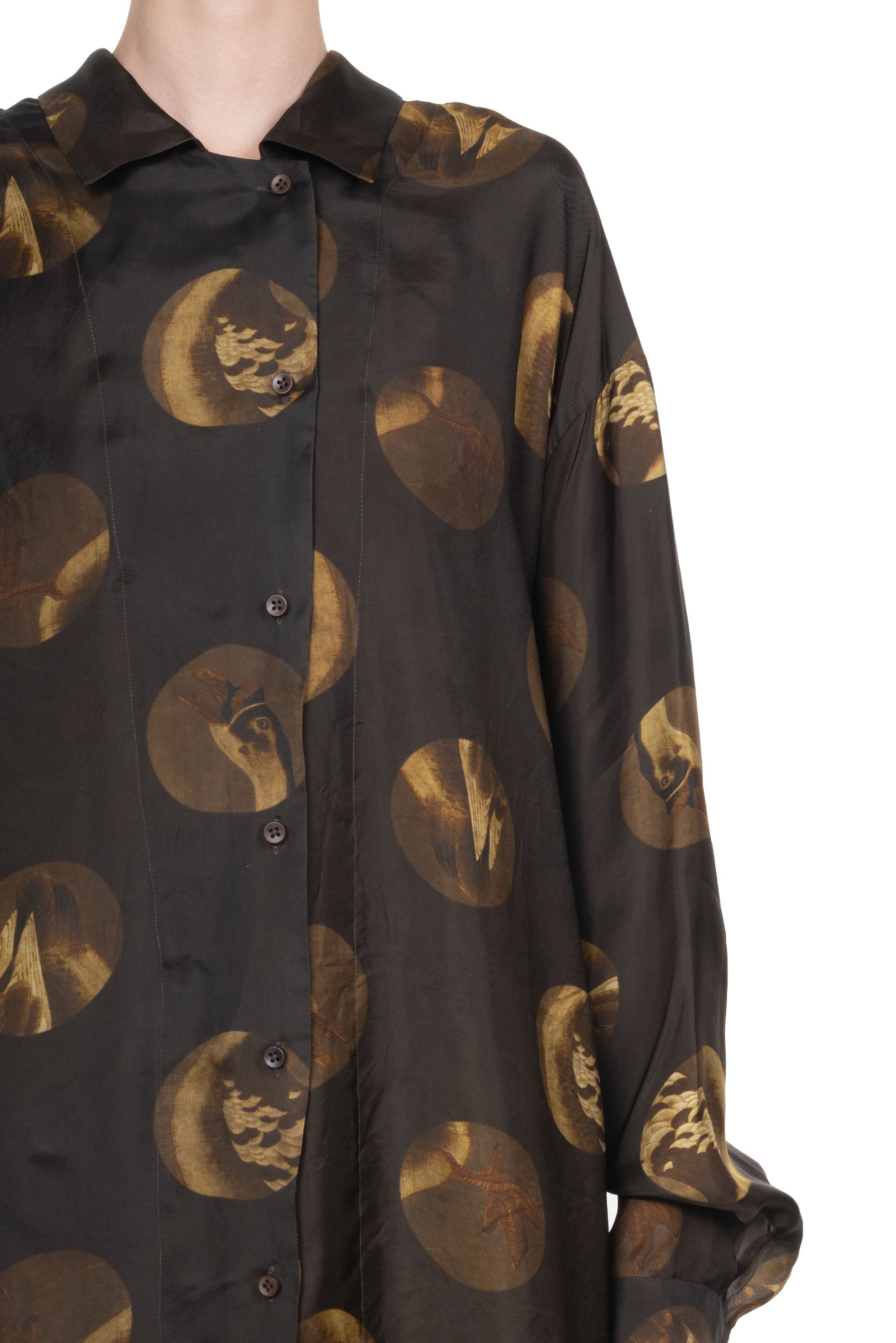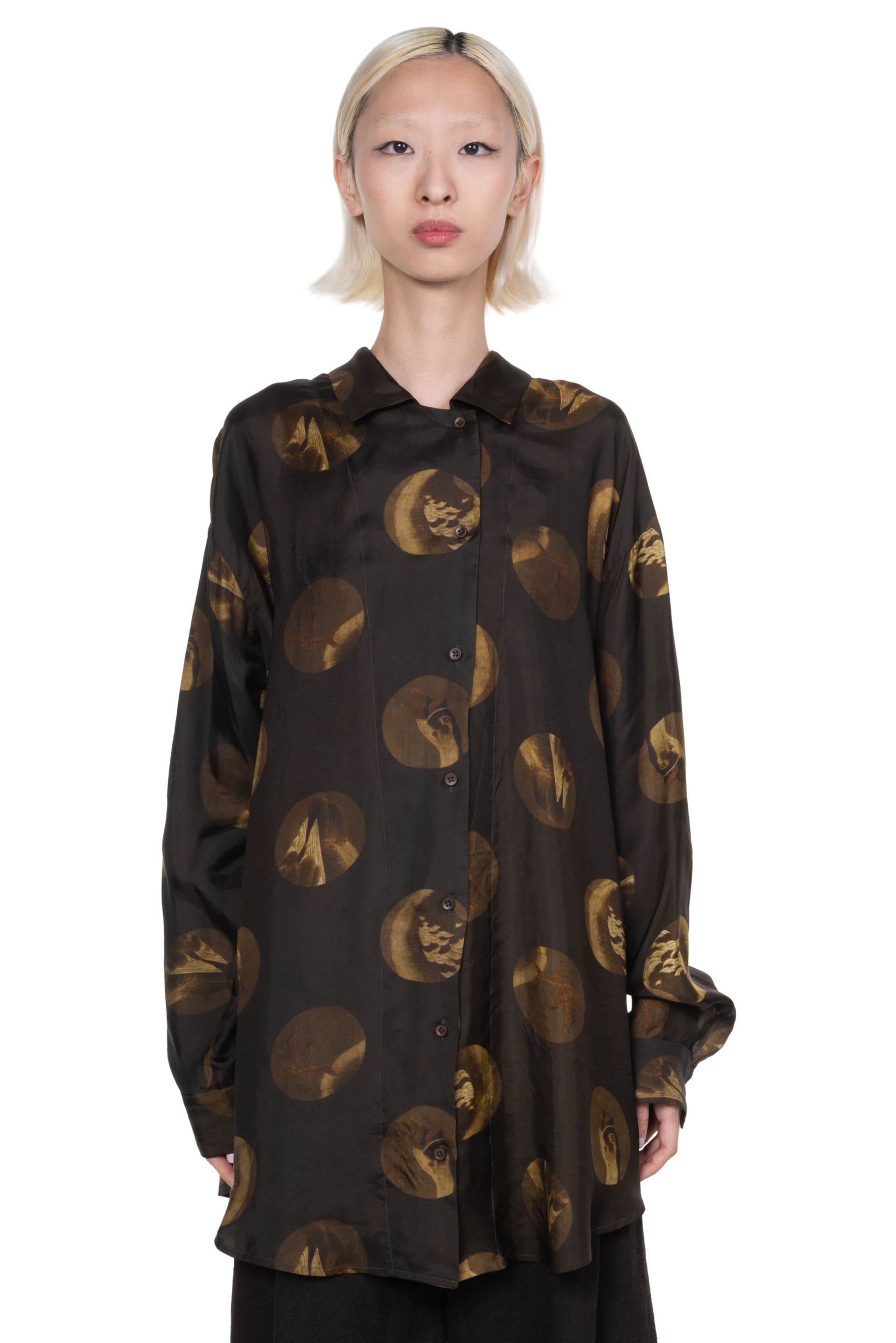 UMA WANG printed shirt. Long sleeves. Button closure at front. Button closure at cuffs. Regular collar. Seasonal print throughout. Soft silk and elastane fabric.
