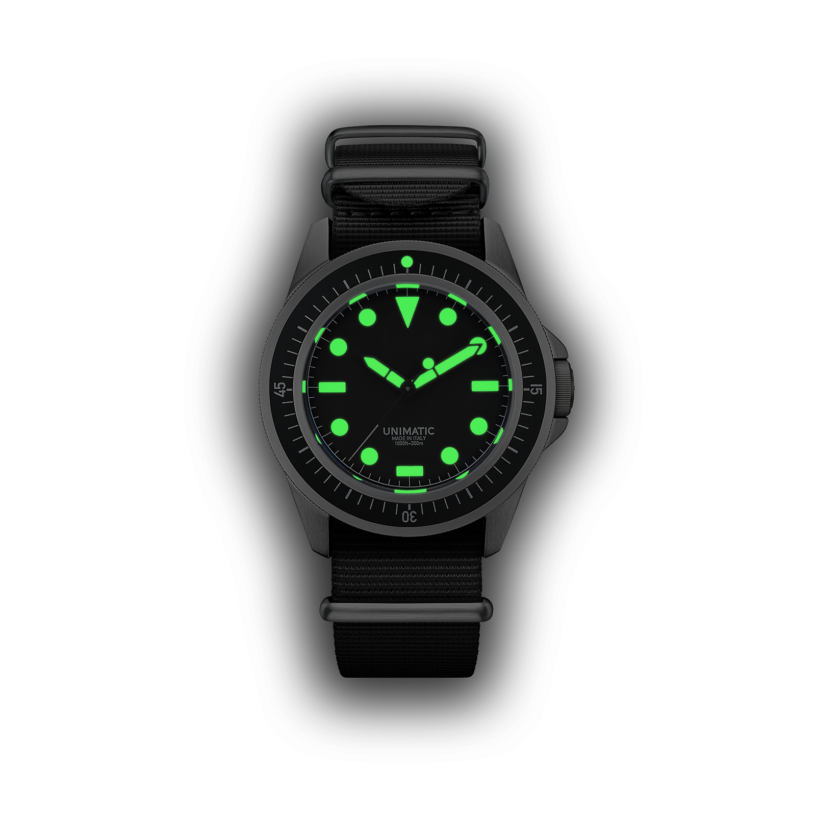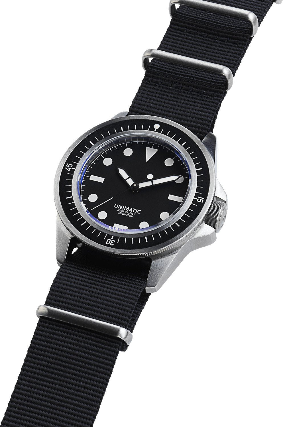 The Made in Italy professional diving watch, featuring black aluminium professional diver insert with raised lume dot matching with Super-LumiNova® C1 white markers on the black matte diver dial. Comes on a black heavy-duty Unimatic nylon nato strap with stainless steel brushed hardware signed Unimatic.