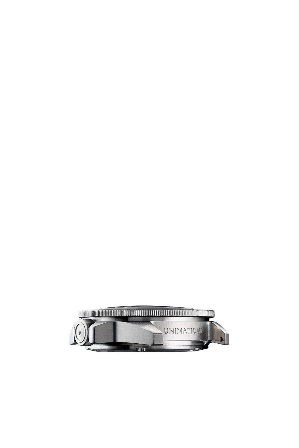 300m = 1000ft = 30atm WR. Diameter 40mm case with 41,5mm bezel. 120 clicks mono-directional security bezel. 2.5mm thick double domed sapphire. Anti-reflective coating on lens inner-side. Black aluminium professional diver insert with raised lume dot. 316 stainless steel case brushed finish. Black matte dive dial. Super-LumiNova® C1 white. Silver closed second rail and dial trims. Automatic calibre Seiko NH35A 21600bph. Hacking seconds hand bi-directional winding. Accuracy -20/+40 s/day – 41h power reserve. Antimagnetic ?4800 A / m. Black heavy-duty Unimatic nylon nato strap. Stainless steel brushed hardware signed Unimatic. Unimatic conversion scale screw-down caseback. Unimatic tough case, warranty card with unique ID seal