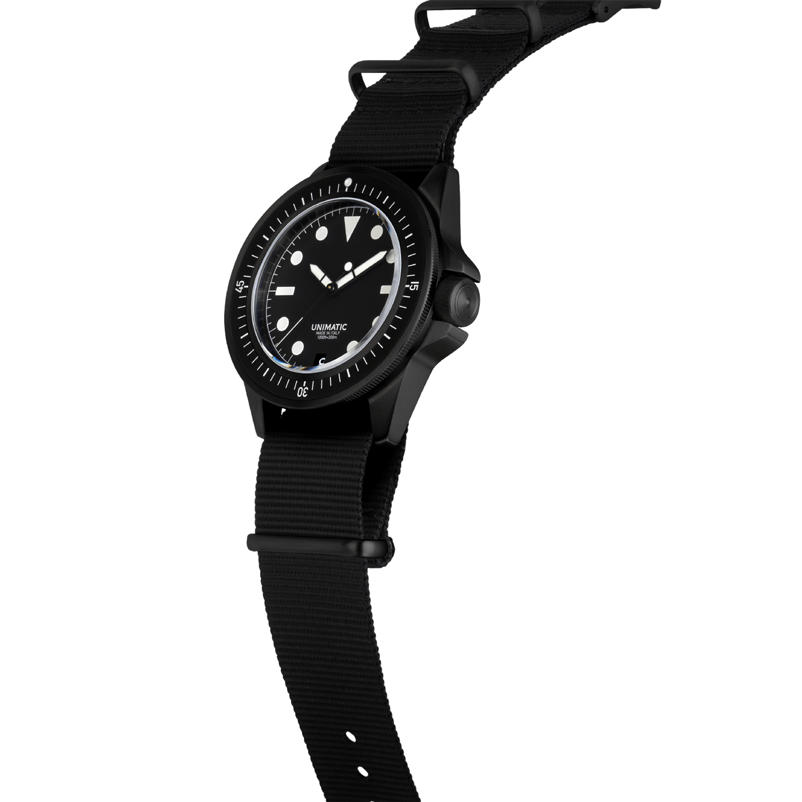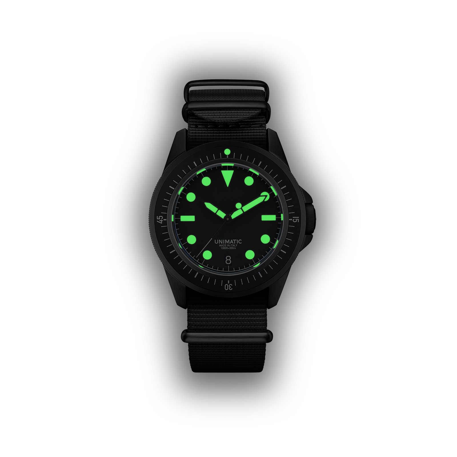 The Made in Italy professional diving watch, featuring black aluminium professional diver insert with raised lume dot matching with Super-LumiNova® C1 white markers on the black matte diver dial. Comes on a black heavy-duty Unimatic nylon nato strap with stainless steel brushed hardware signed Unimatic.