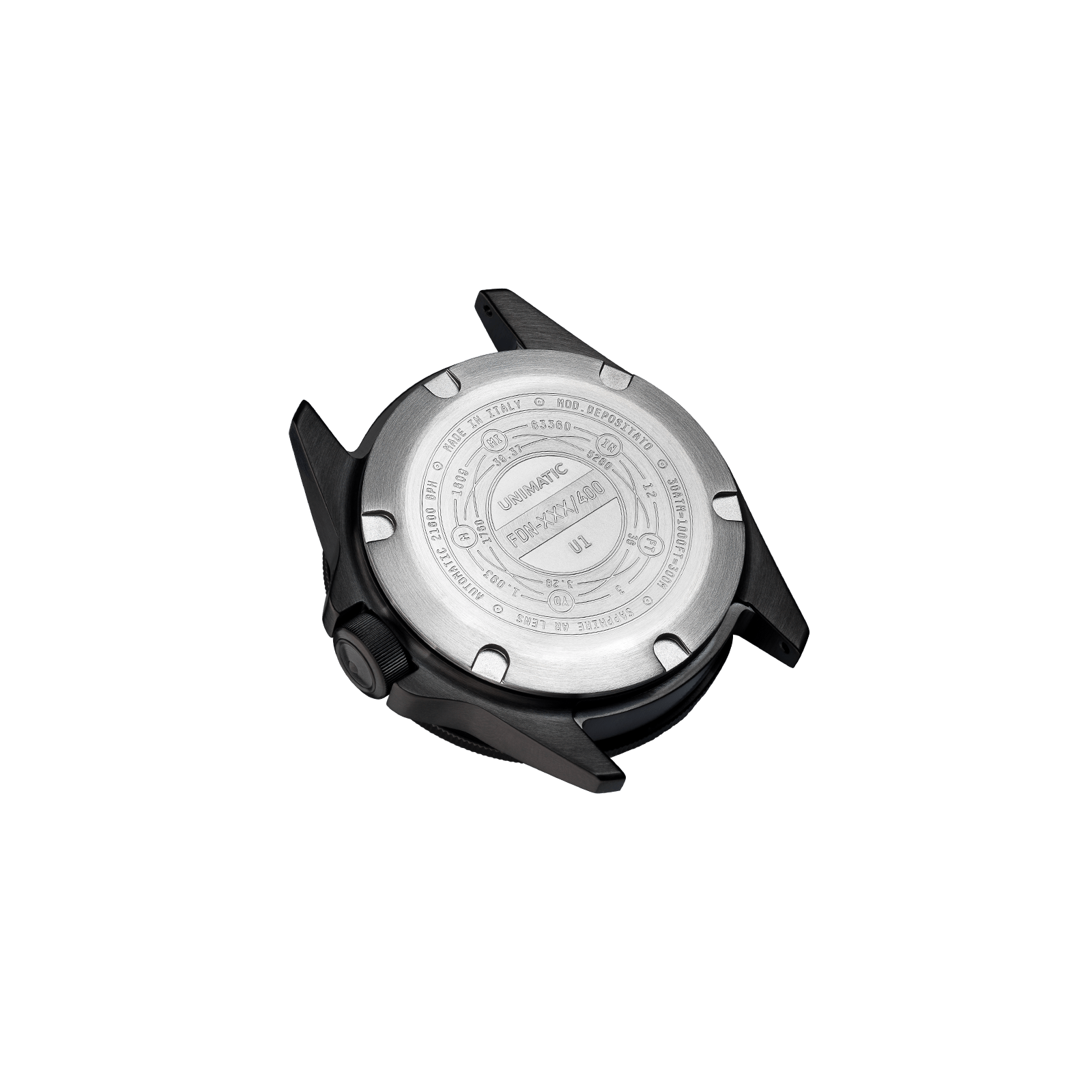300m = 1000ft = 30atm WR. Diameter 40mm case with 41,5mm bezel. 120 clicks mono-directional security bezel. 2.5mm thick double domed sapphire. Anti-reflective coating on lens inner-side. Black aluminium professional diver insert with raised lume dot. 316 stainless steel case brushed finish. Black matte dive dial. Super-LumiNova® C1 white. Silver closed second rail and dial trims. Automatic calibre Seiko NH35A 21600bph. Hacking seconds hand bi-directional winding. Accuracy -20/+40 s/day – 41h power reserve. Antimagnetic ?4800 A / m. Black heavy-duty Unimatic nylon nato strap. Stainless steel brushed hardware signed Unimatic. Unimatic conversion scale screw-down caseback. Unimatic tough case, warranty card with unique ID seal