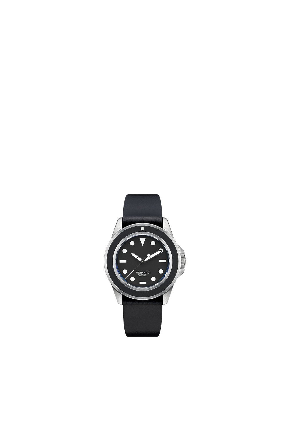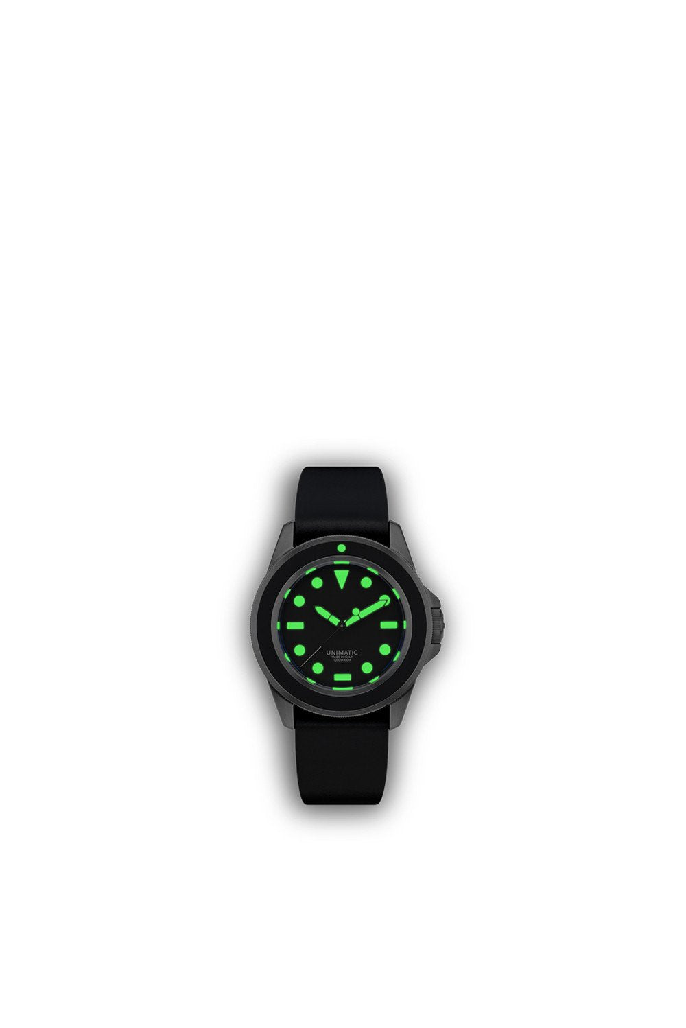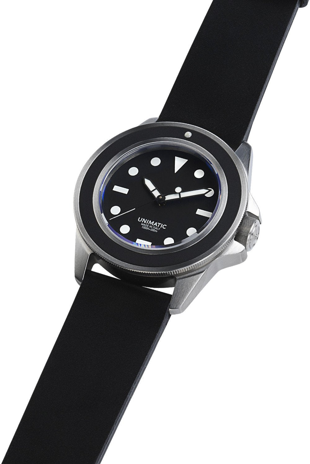 The Made in Italy minimal diving watch, featuring our signature black aluminium minimal bezel with a raised lume dot matching with Super-LumiNova® C1 white markers on the black matte minimal dial. Comes with a luxurious Made in Italy Horween Cordovan Shell strap with stainless steel brushed hardware signed Unimatic, characterised by the seamless Unimatic two-piece design.