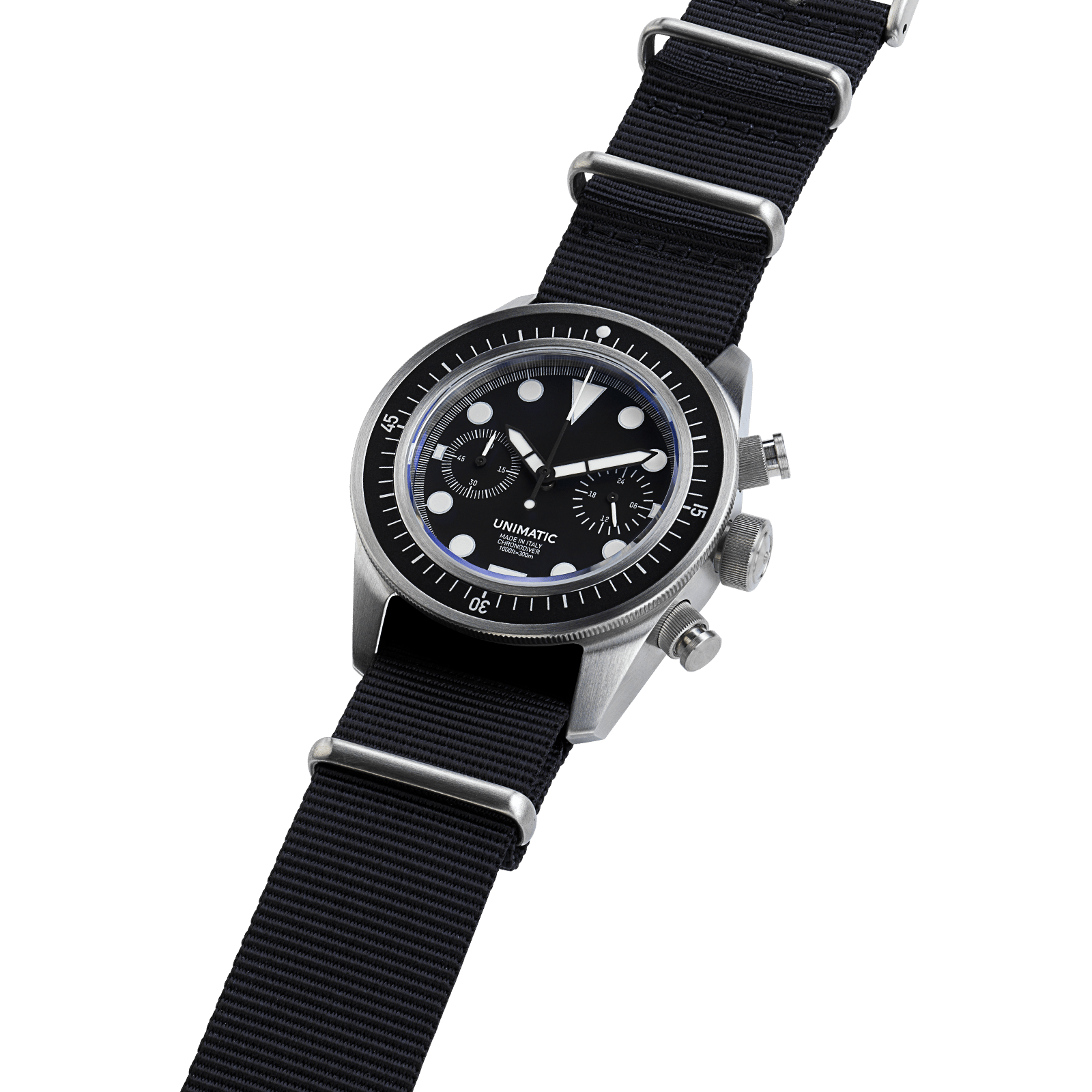 300m = 1000ft = 30atm WR. Diameter 40mm case with 41,5mm bezel. 120 clicks mono-directional security bezel. 2.5mm thick double domed sapphire. Anti-reflective coating on lens inner-side. Black aluminium professional diver insert with raised lume dot . 316 stainless steel case brushed finish. Fat screw-down chrono pushers. Black matte, two sub-dial. Super-LumiNova® C1 white . Silver open second rail and dial trims . Meca-quartz calibre Seiko VK64 . 1/5 second sweep second hand with mechanical reset. Accuracy -20/+20 s/month . Antimagnetic ≥1600 A / m . Black heavy-duty Unimatic nylon nato strap. Stainless steel brushed hardware signed Unimatic. Unimatic world timer screwdown caseback. Unimatic tough case, warranty card with unique ID seal.