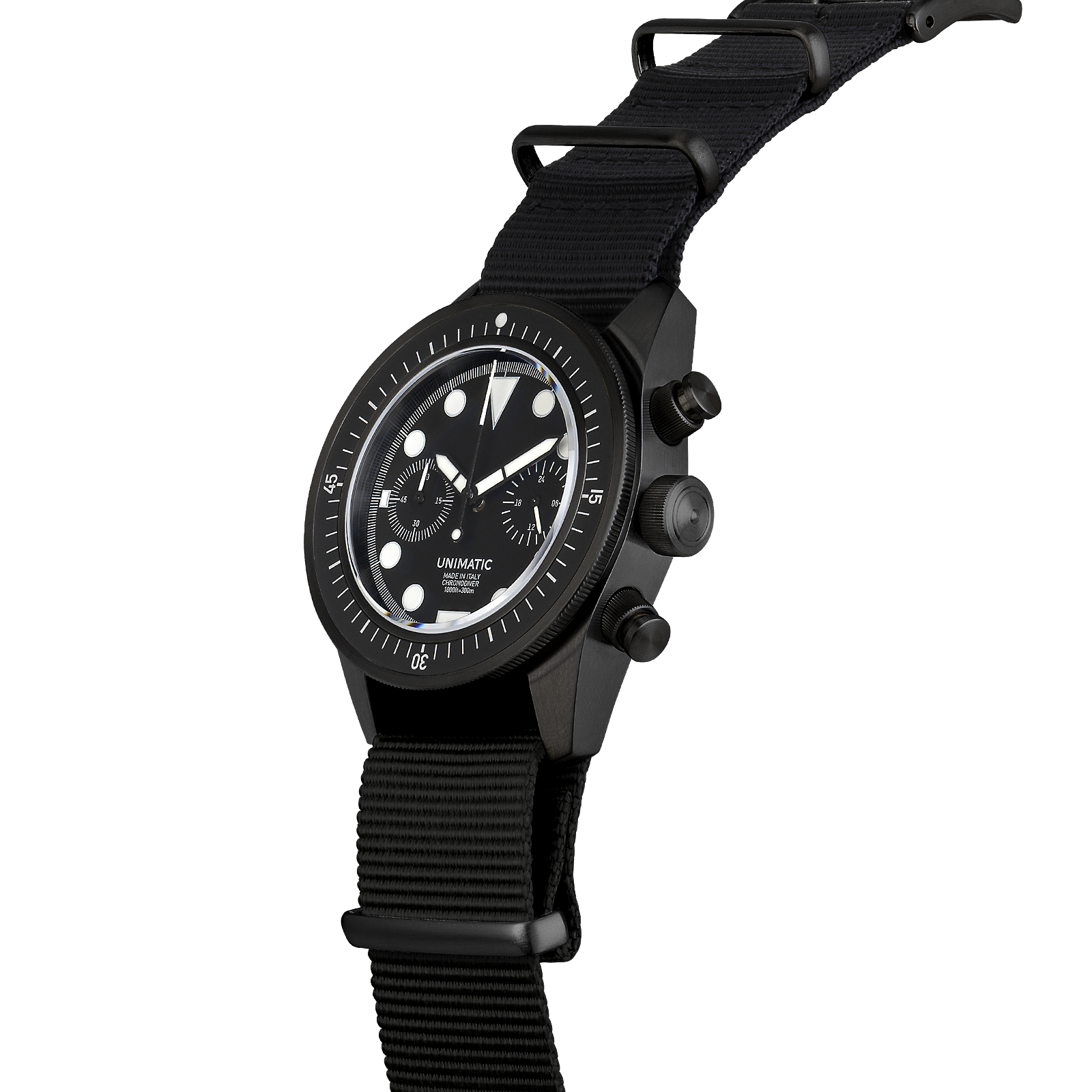 300m = 1000ft = 30atm WR. Diameter 40mm case with 41,5mm bezel. 120 clicks mono-directional security bezel. 2.5mm thick double domed sapphire. Anti-reflective coating on lens inner-side. Black aluminium professional diver insert with raised lume dot . 316 stainless steel case. DLC black brushed finish . Fat screw-down chrono pushers. Black matte, two sub-dial. Super-LumiNova® C1 white . Silver open second rail and dial trims . Meca-quartz calibre Seiko VK64 . 1/5 second sweep second hand with mechanical reset. Accuracy -20/+20 s/month . Antimagnetic ≥1600 A / m . Black heavy-duty Unimatic nylon nato strap. Black DLC brushed hardware signed Unimatic. Unimatic world timer screwdown caseback. Unimatic tough case, warranty card with unique ID seal.