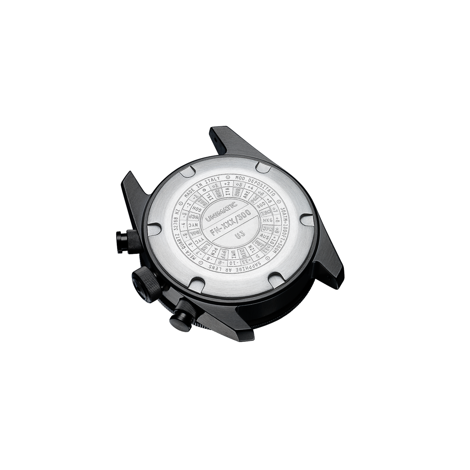 Modello Tre ref. U3-FN is the latest addition to our product range, a Made in Italy chrono-diver. It features a two-eyes black matte dial with retro sized marker in Super-LumiNova® C1 white matching the pearl on the black aluminium professional diver insert, silver second rail and graphic trims. The caseback features the Unimatic world timer engraving and the individual progressive number. The watch is covered by a 24 months worldwide warranty and is part of a unique edition of 600 pieces.