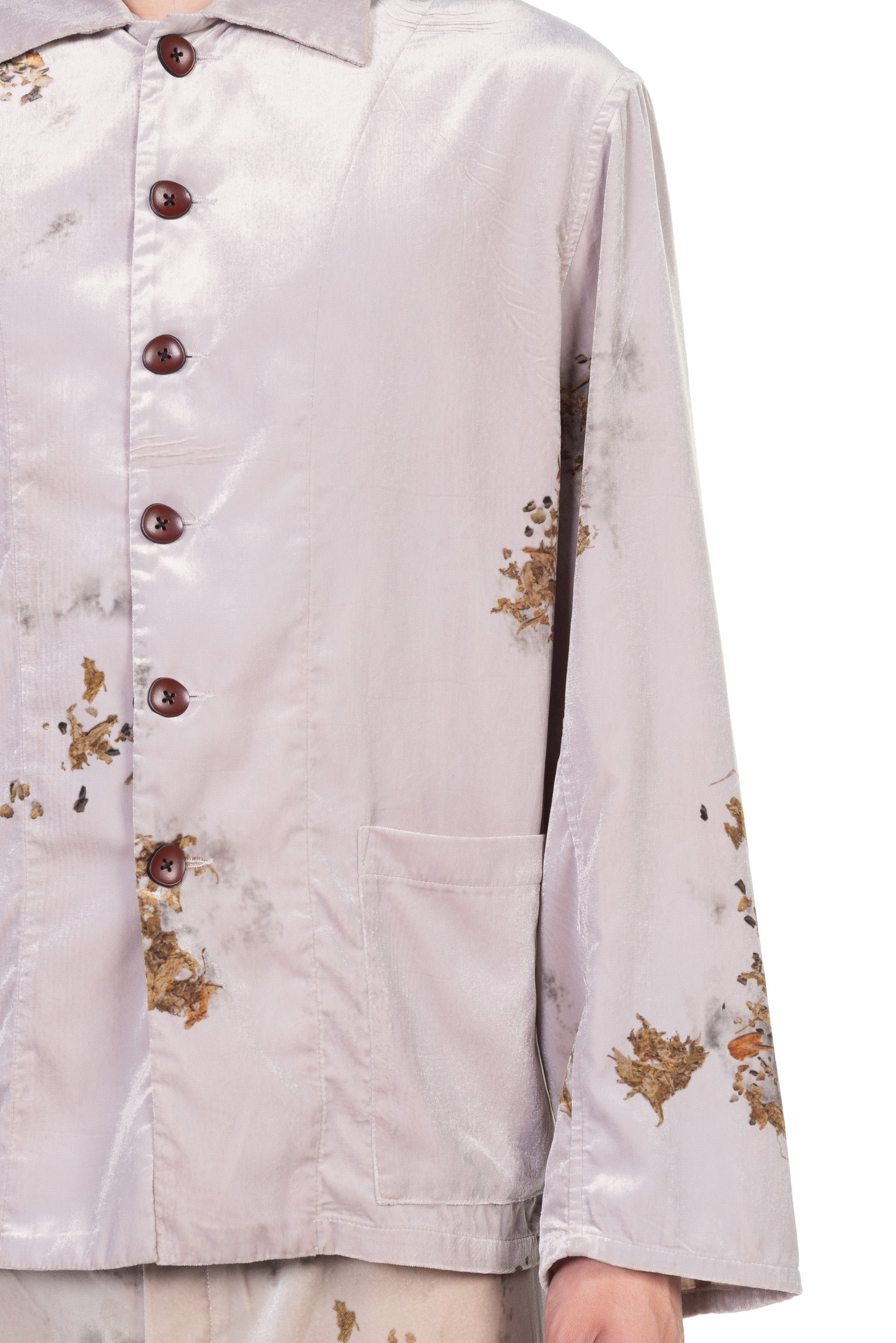 Long sleeves. Button closure at front. Two side pockets. Soft velvet fabric. Medicinal print throughout. Leather buttons details throughout.