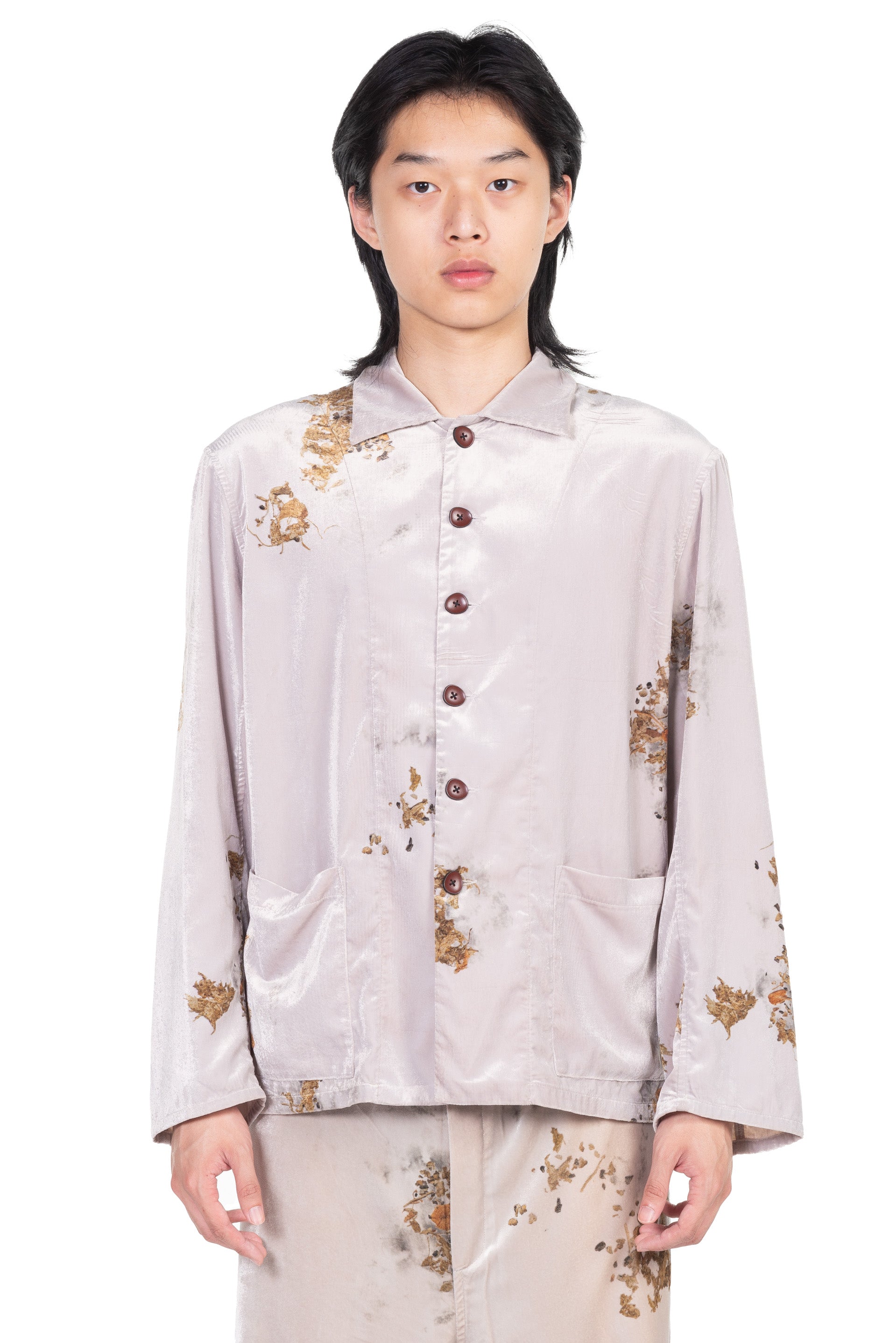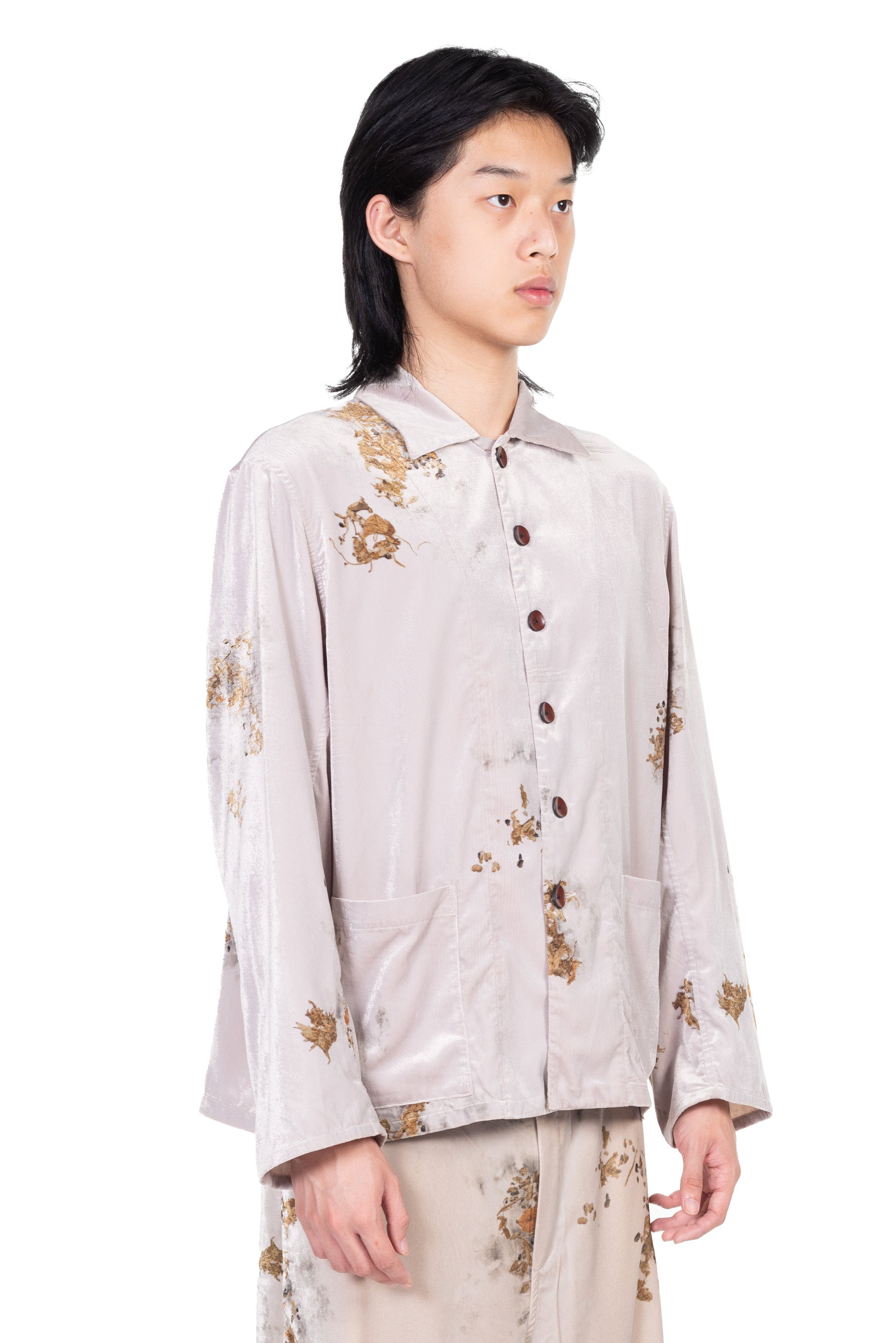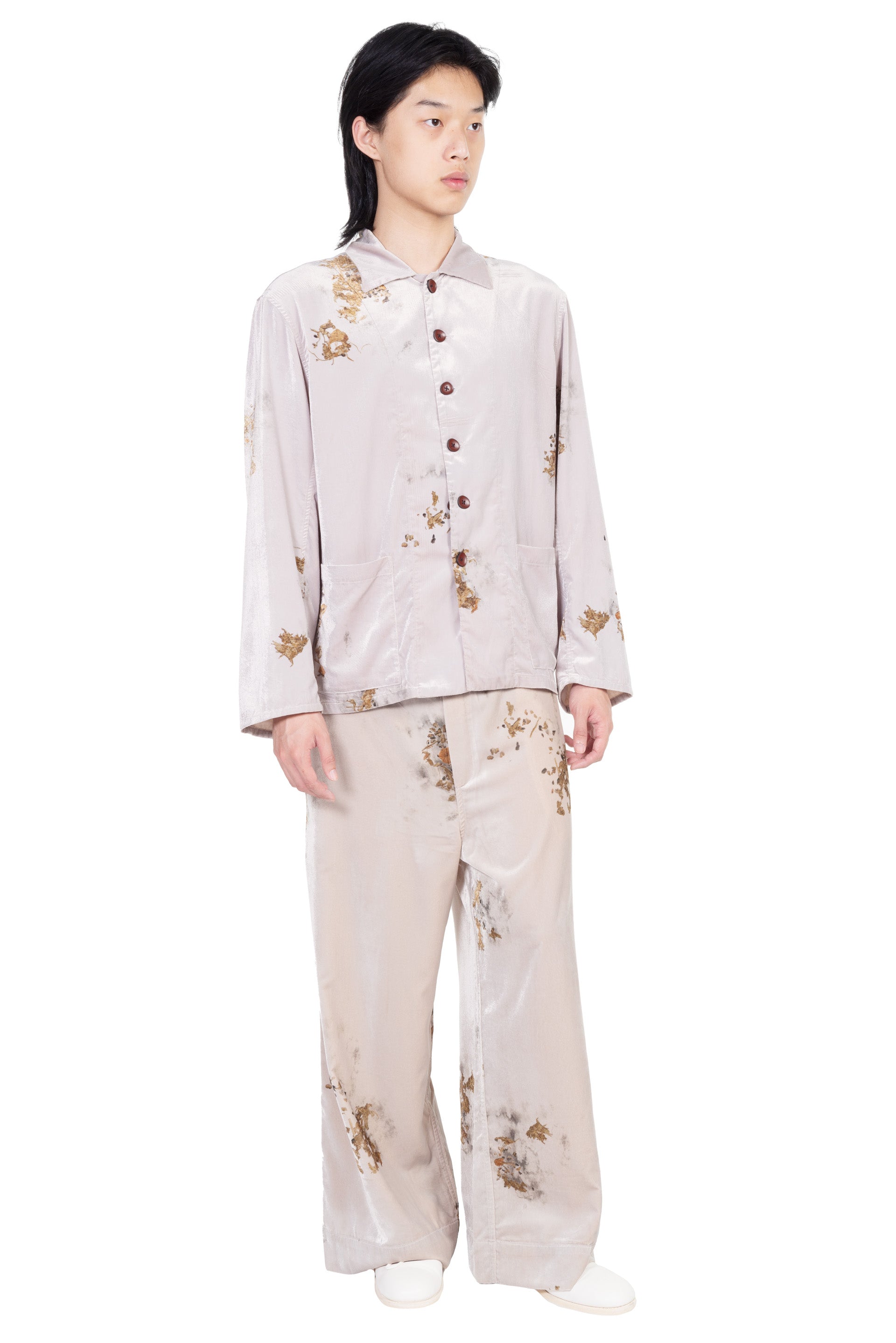 Peng Tai creates modern silhouette with traditional chinese philosophy. Inspired by how Chinese herbal medicine regulates the body from the inside out, Peng Tai aims to research and develop a way to boil Chinese herbal medicine with fabrics, to create clothes that feel like a second skin as seen with the Velvet Chinese Medicine Print Pyjama Jacket.