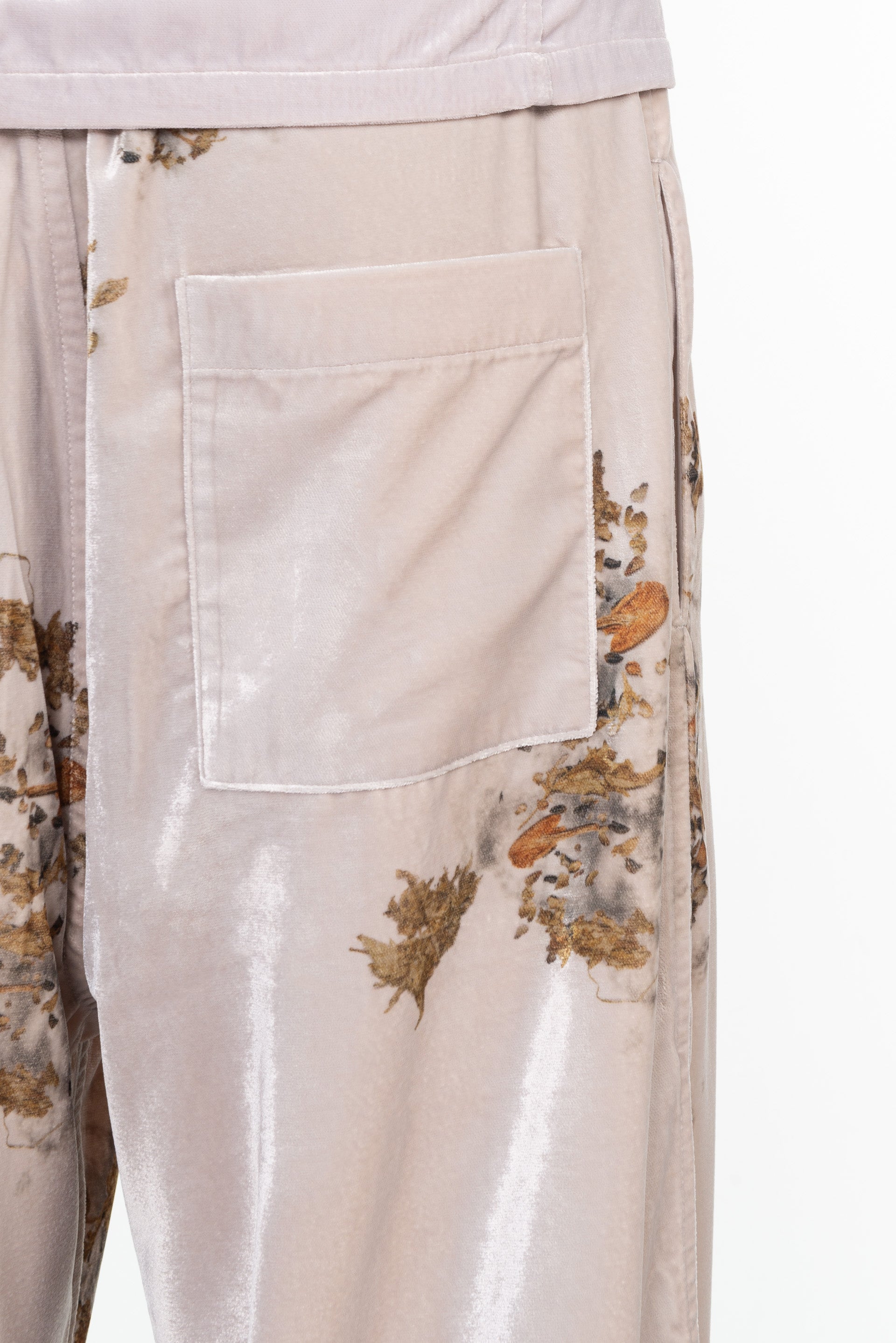 Drawstring closure at waist. Two side pockets. Two back pockets. Soft velvet fabric with medicinal print throughout.