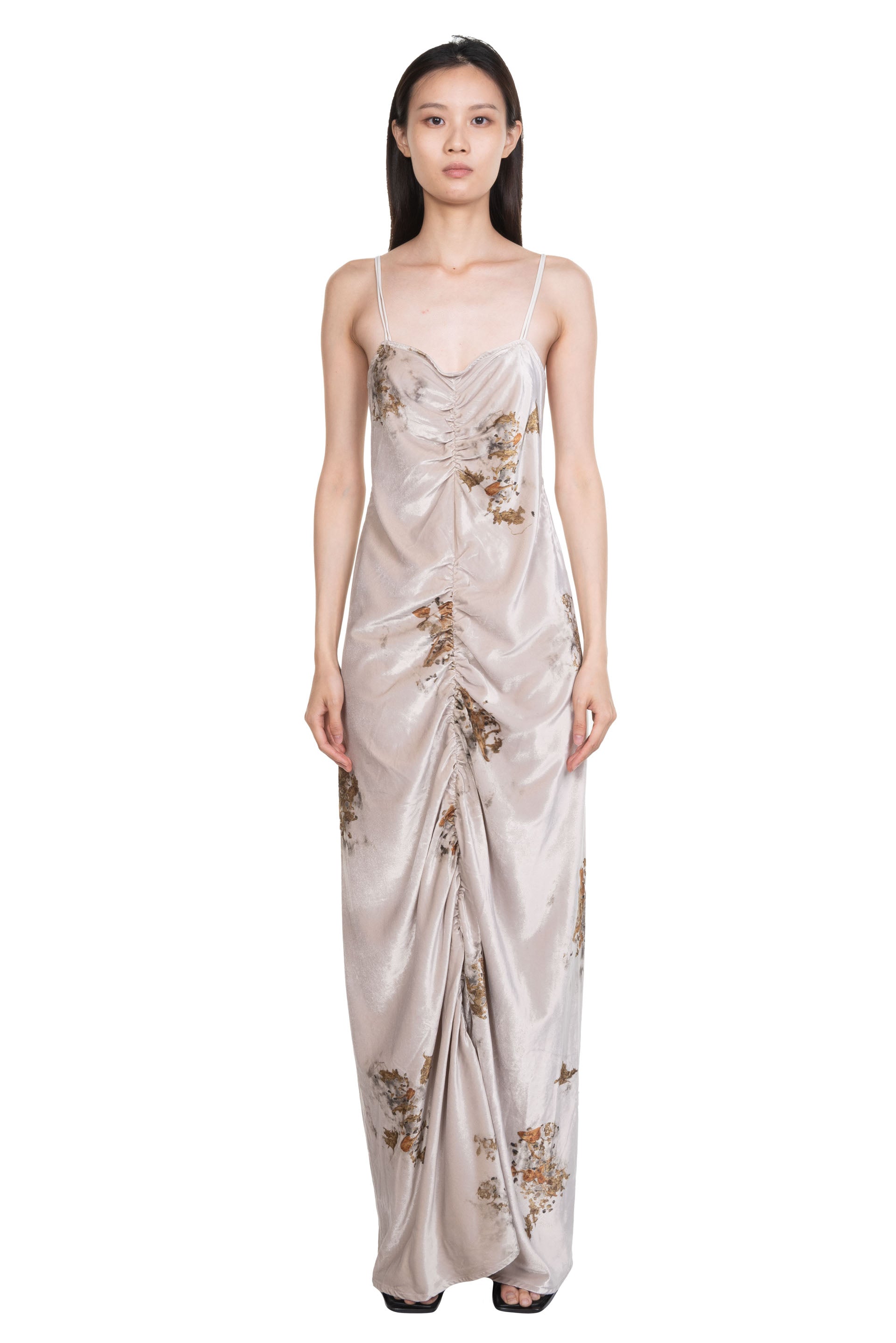 Peng Tai creates modern silhouette with traditional chinese philosophy. Inspired by how Chinese herbal medicine regulates the body from the inside out, Peng Tai aims to research and develop a way to boil Chinese herbal medicine with fabrics, to create clothes that feel like a second skin as seen with the Velvet Chinese Medicine Print Volume Midi Dress.