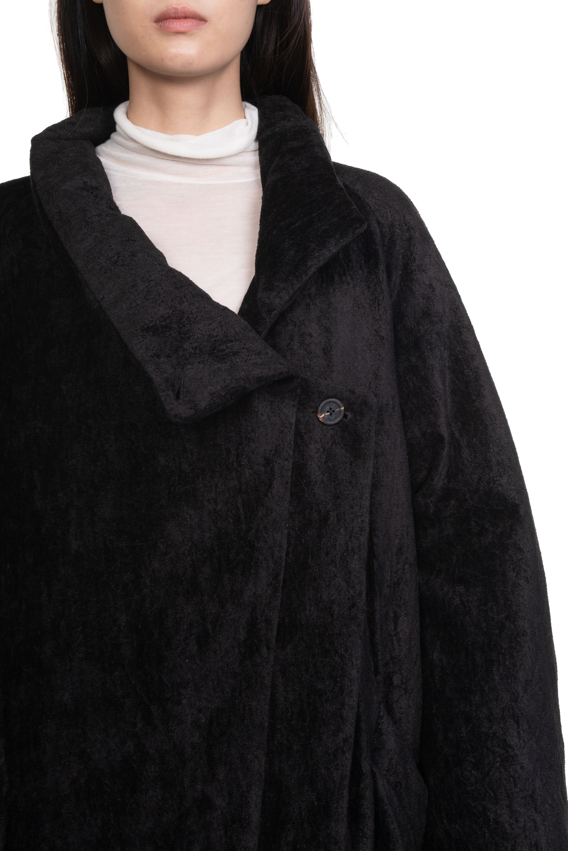 Velvet Jacquard duvet coat in black. Long sleeves. Raglan sleeves. Button closure at front. Two side pockets. Lightweight. Fully lined. Versatile collar.