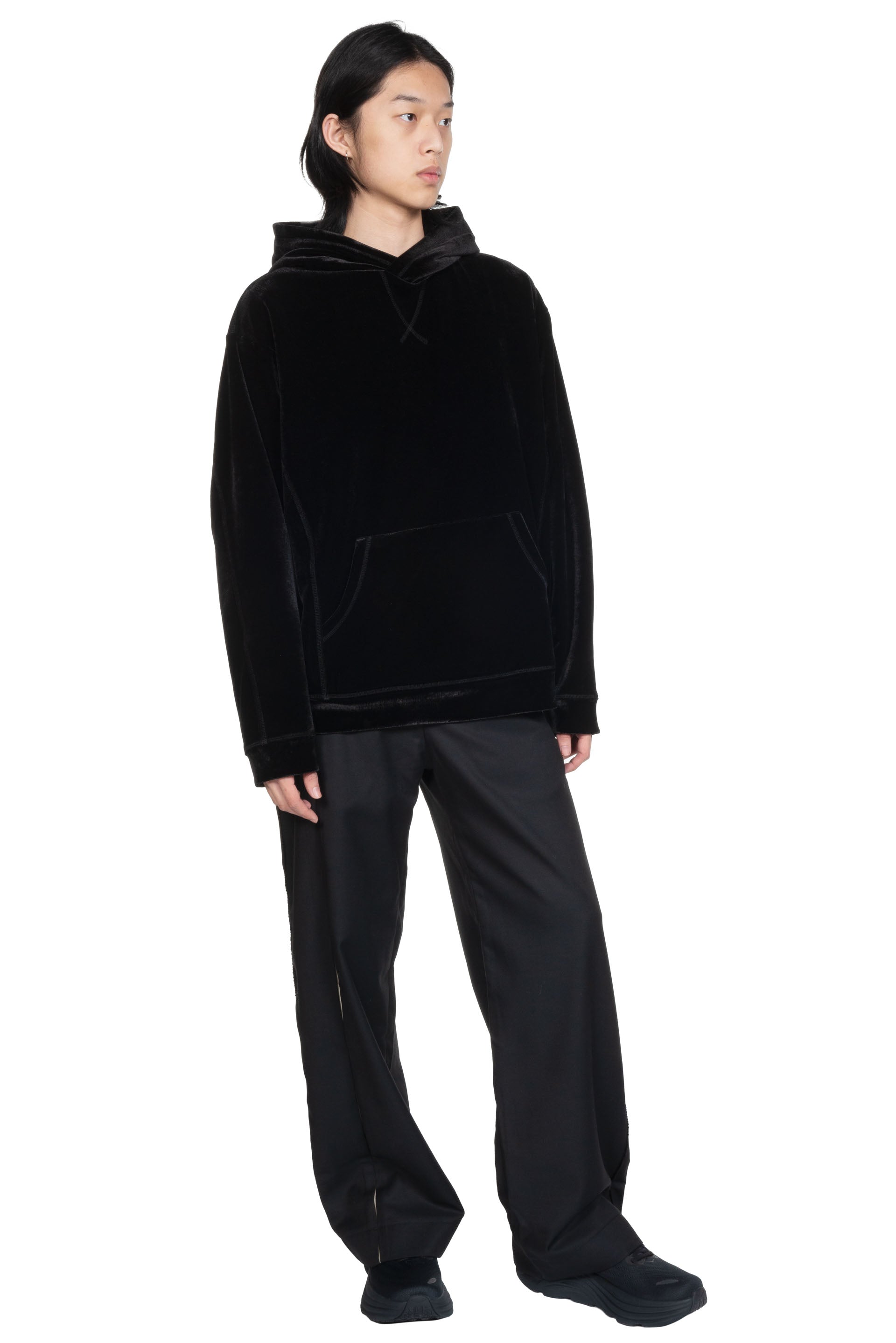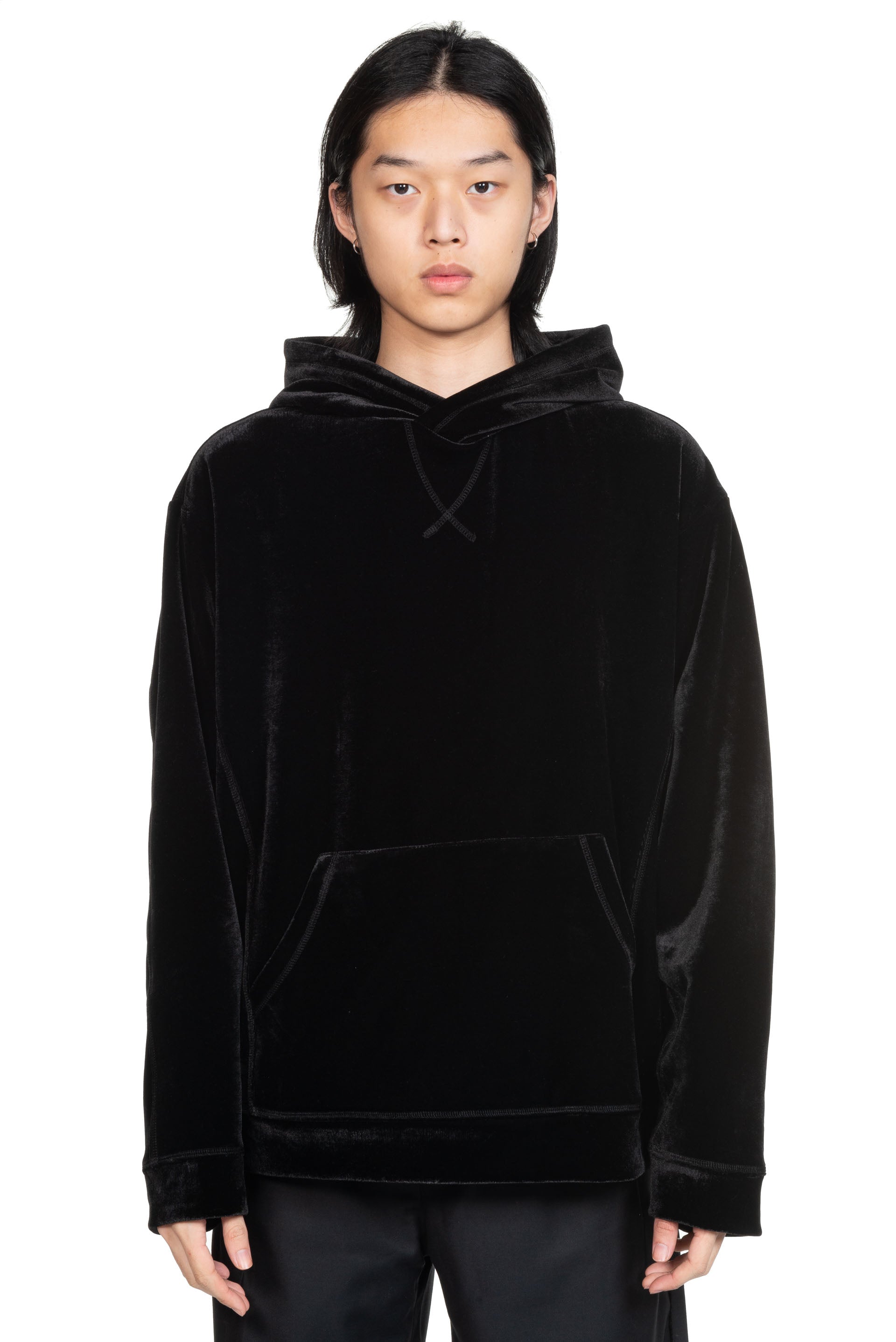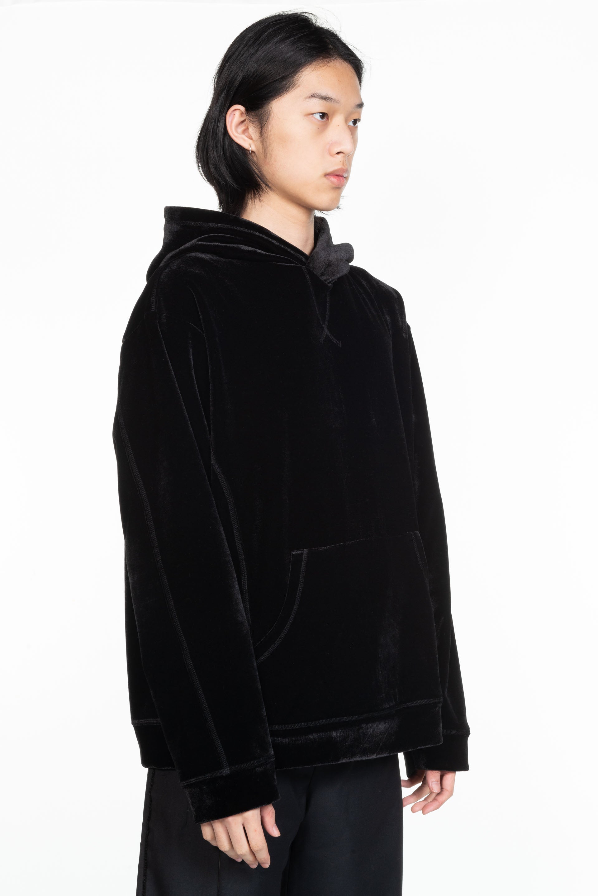 Professor. E velvet Hoodie. Soft Deep black heavy velvet fabric hoodie. Two side kangaroo pockets. Relaxed fit. Professor E detailing at seams.