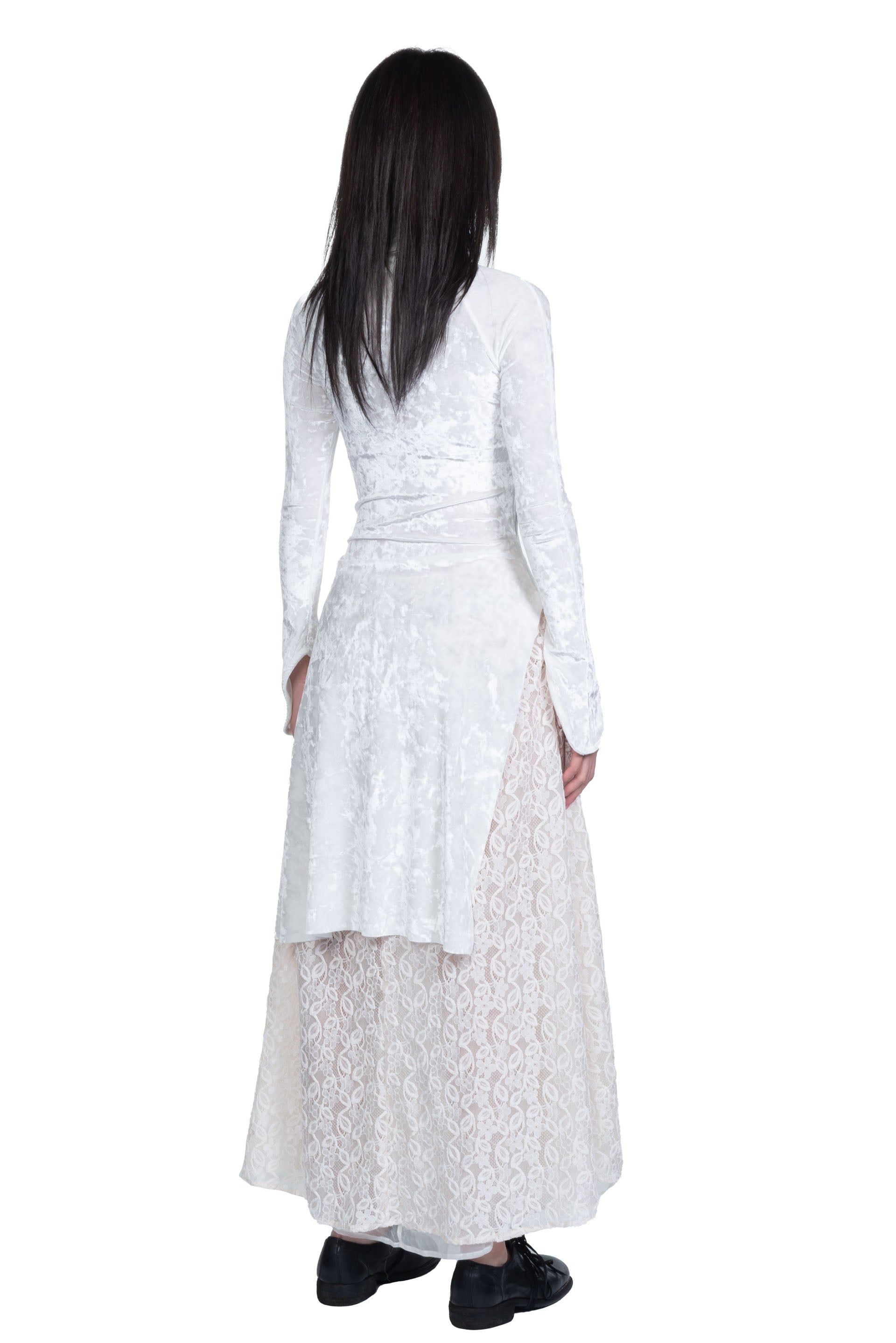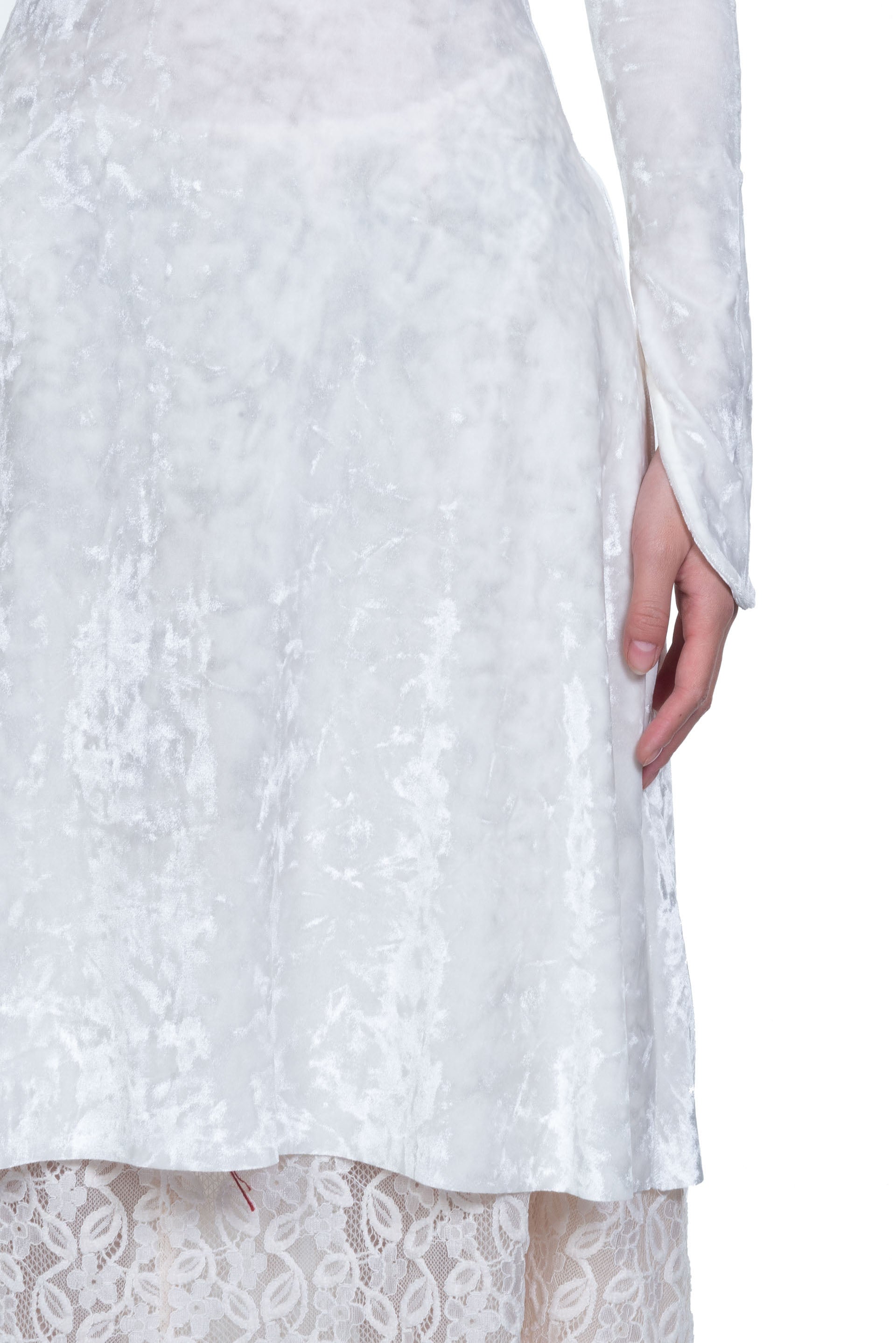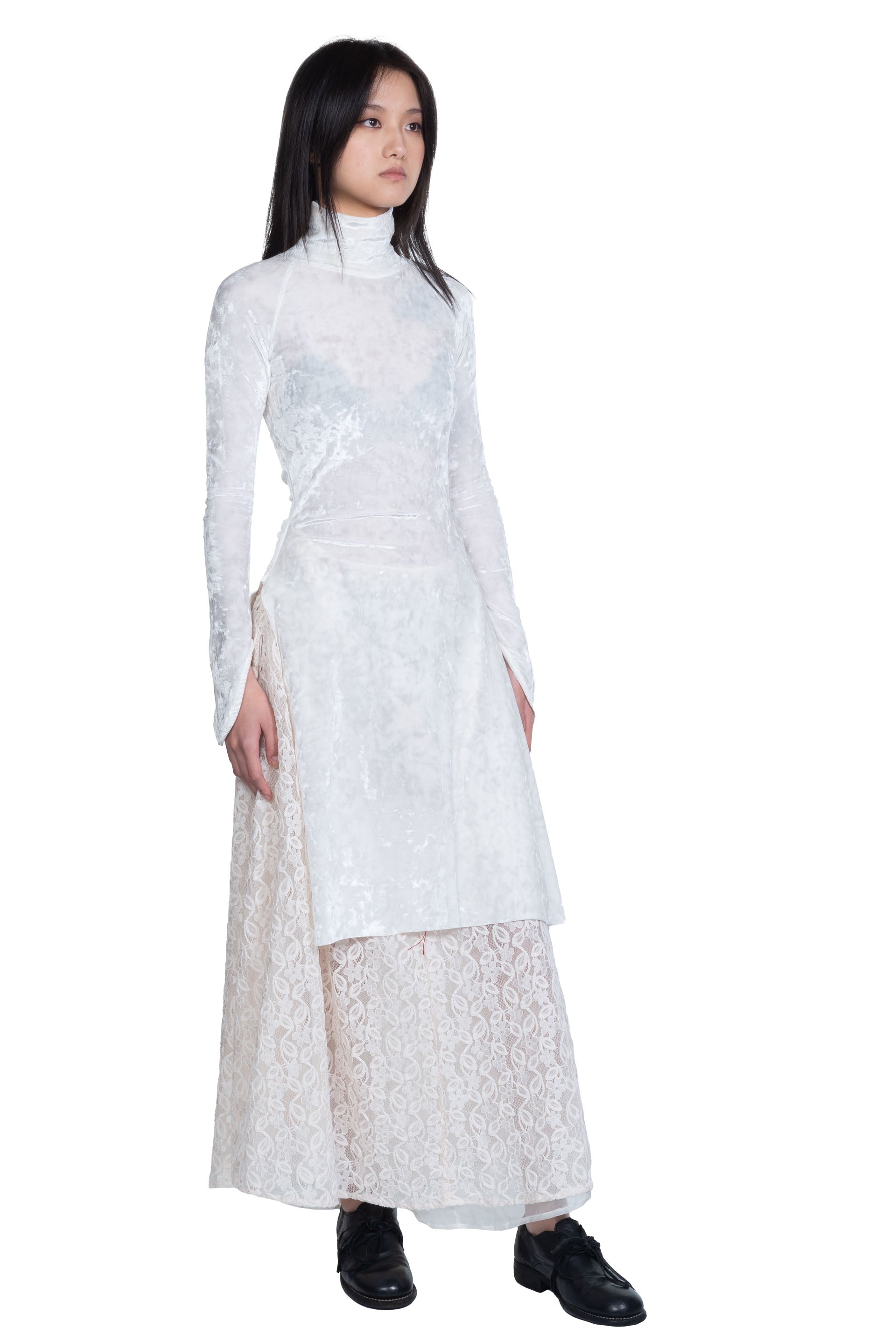 Peng Tai creates modern silhouette with traditional chinese philosophy. Inspired by how Chinese herbal medicine regulates the body from the inside out, Peng Tai aims to research and develop a way to boil Chinese herbal medicine with fabrics, to create clothes that feel like a second skin as seen with the Velvet Jersey High Neck Dress. Long Sleeves. High neck. Slit on side. Layered with lace.
