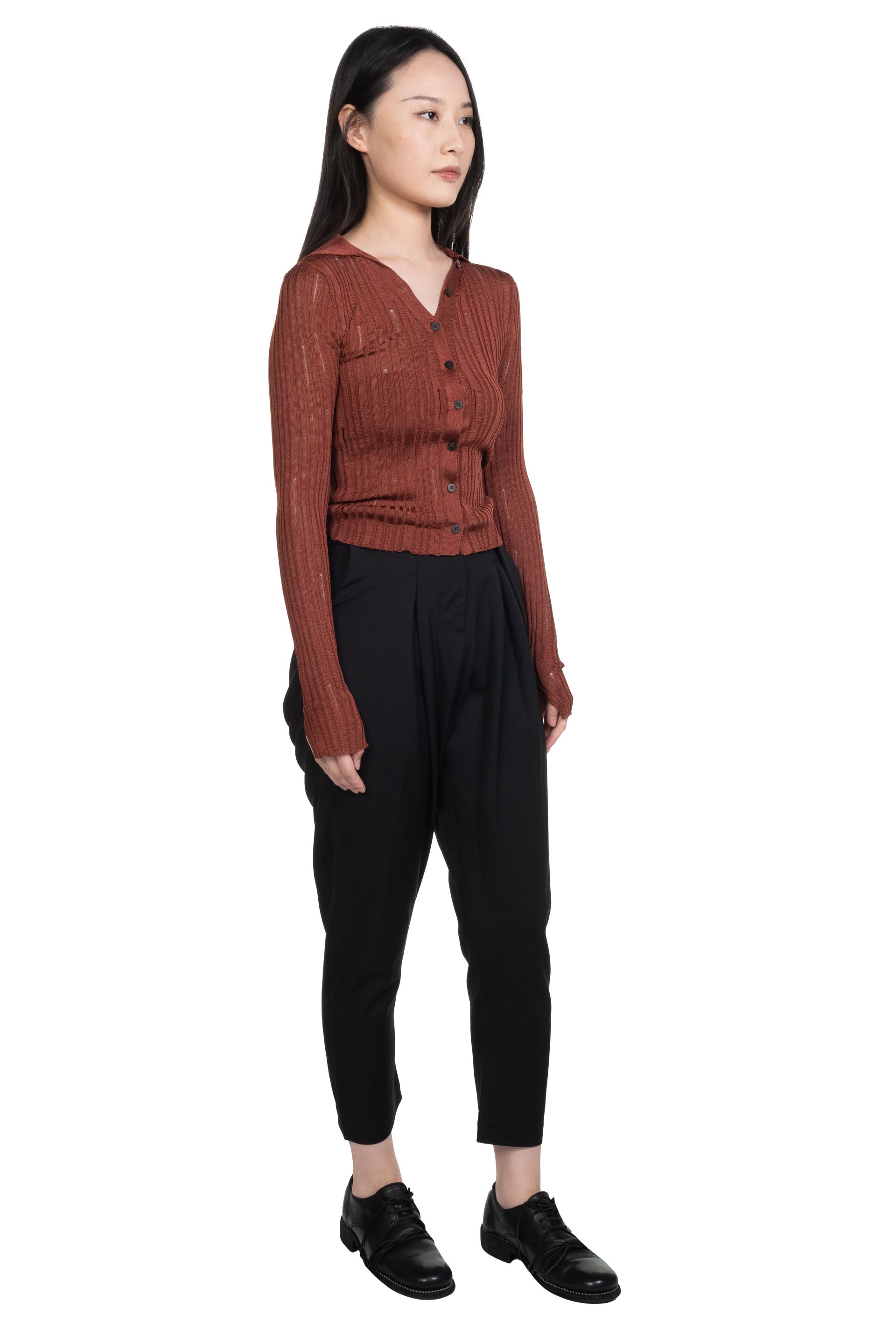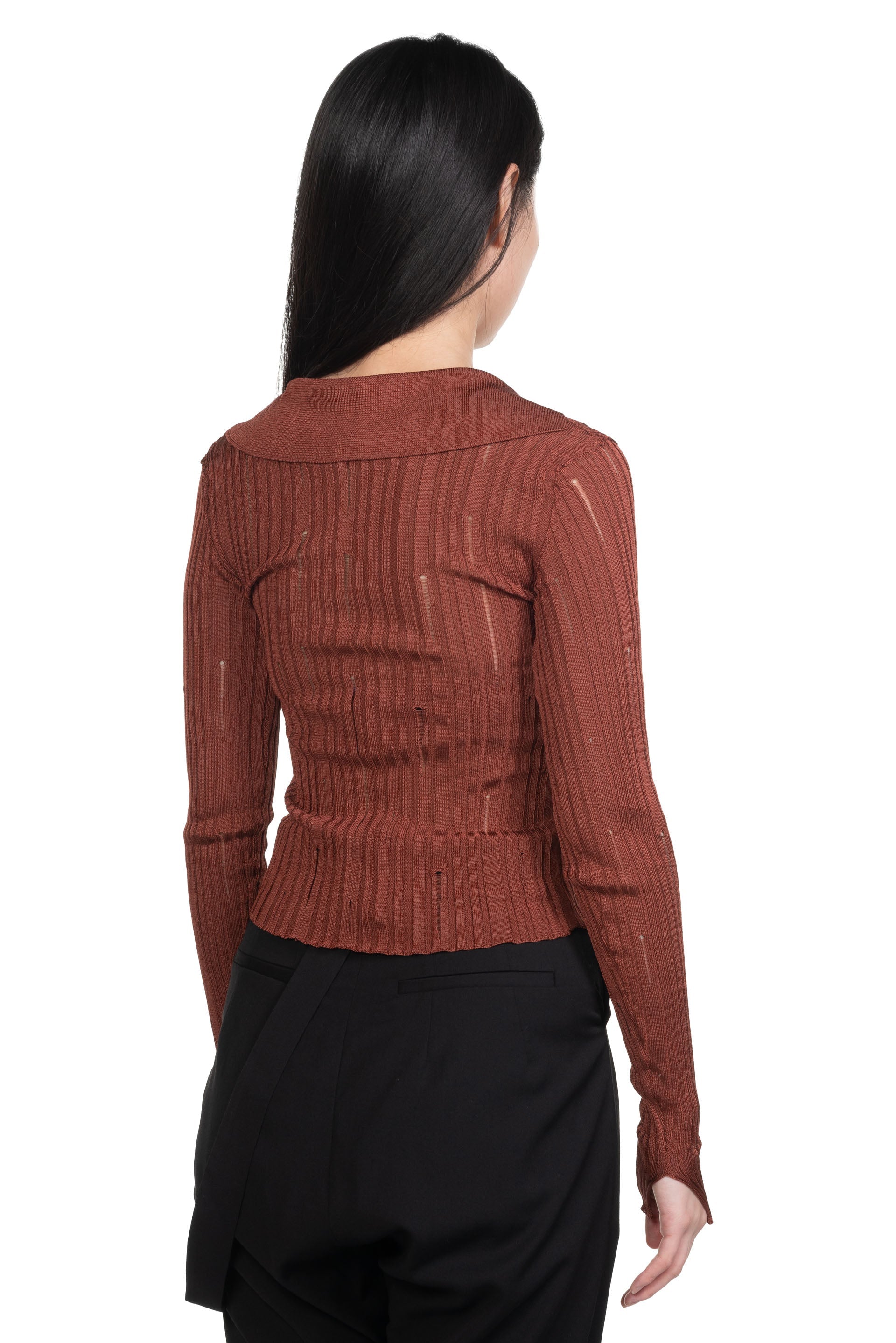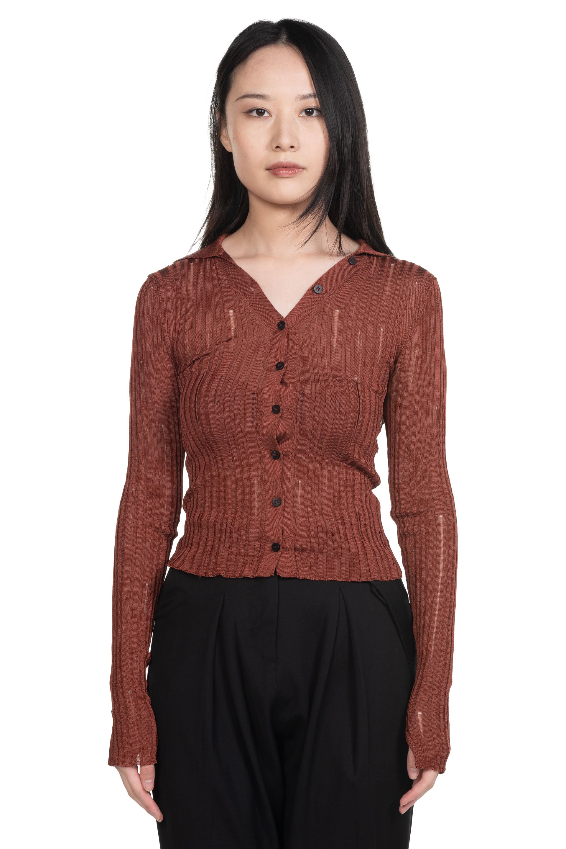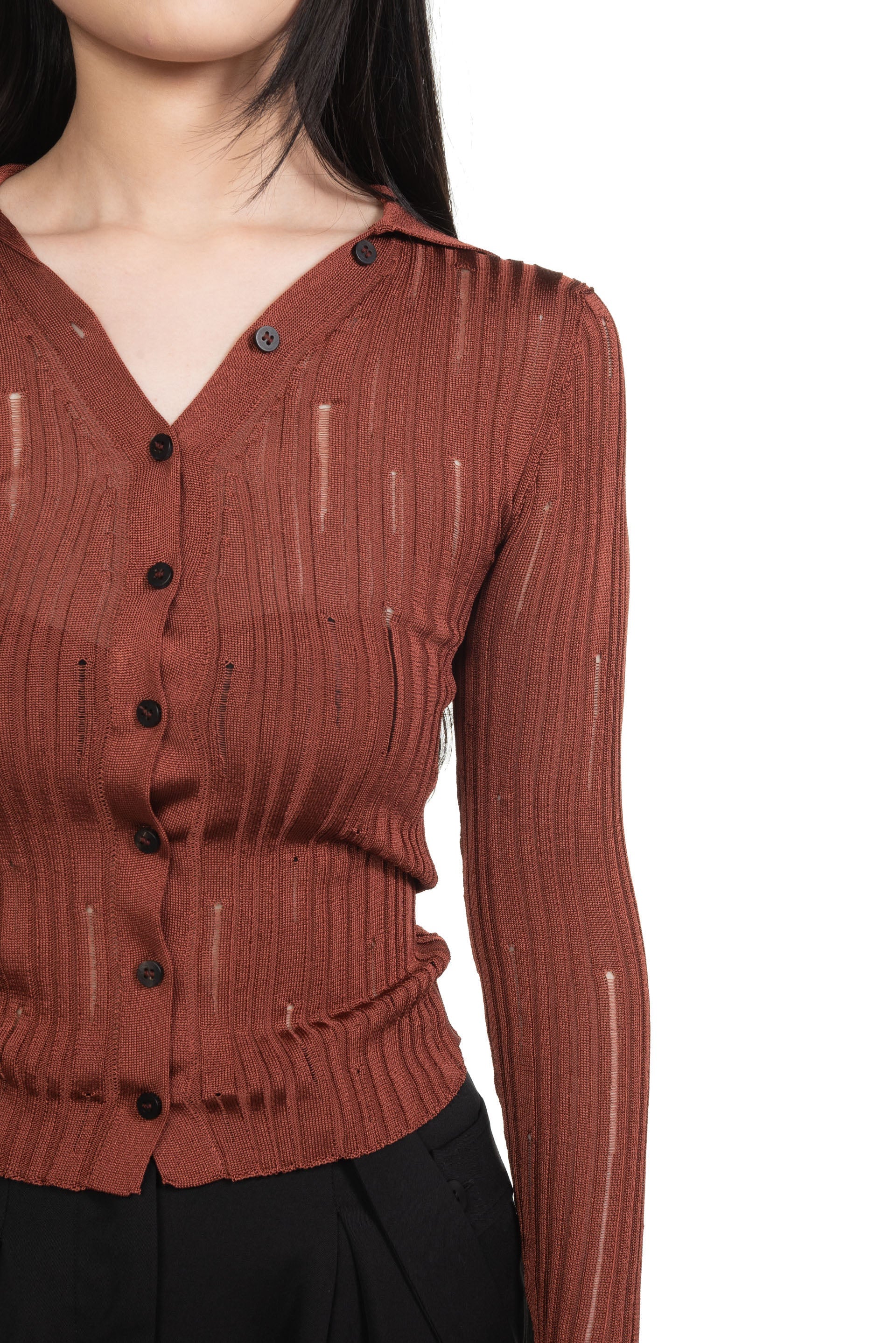 Viscose shiny fitted cardigan knit with V-neck. Buttons closure at front. Cut out and distressed details throughout. Regular fit.