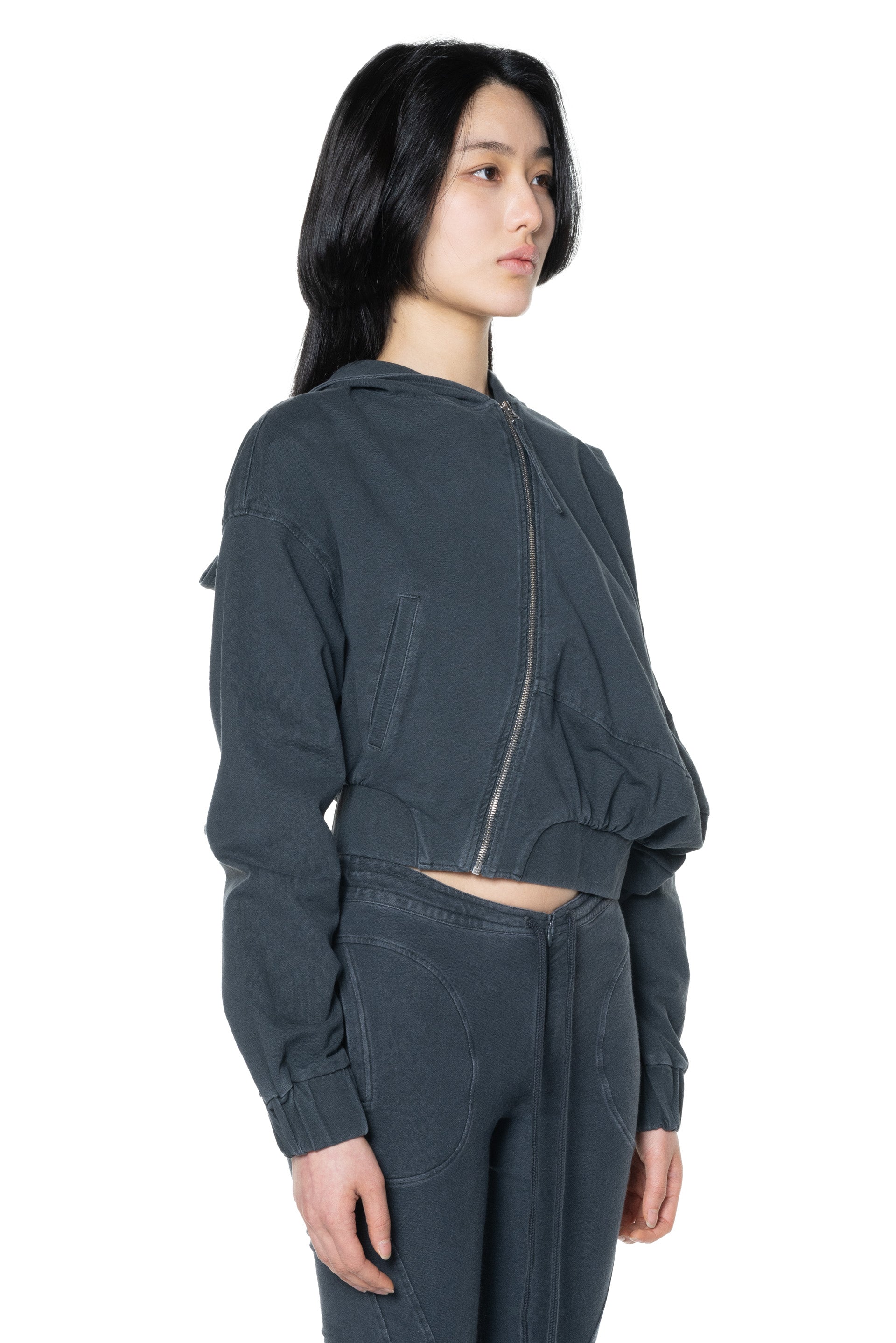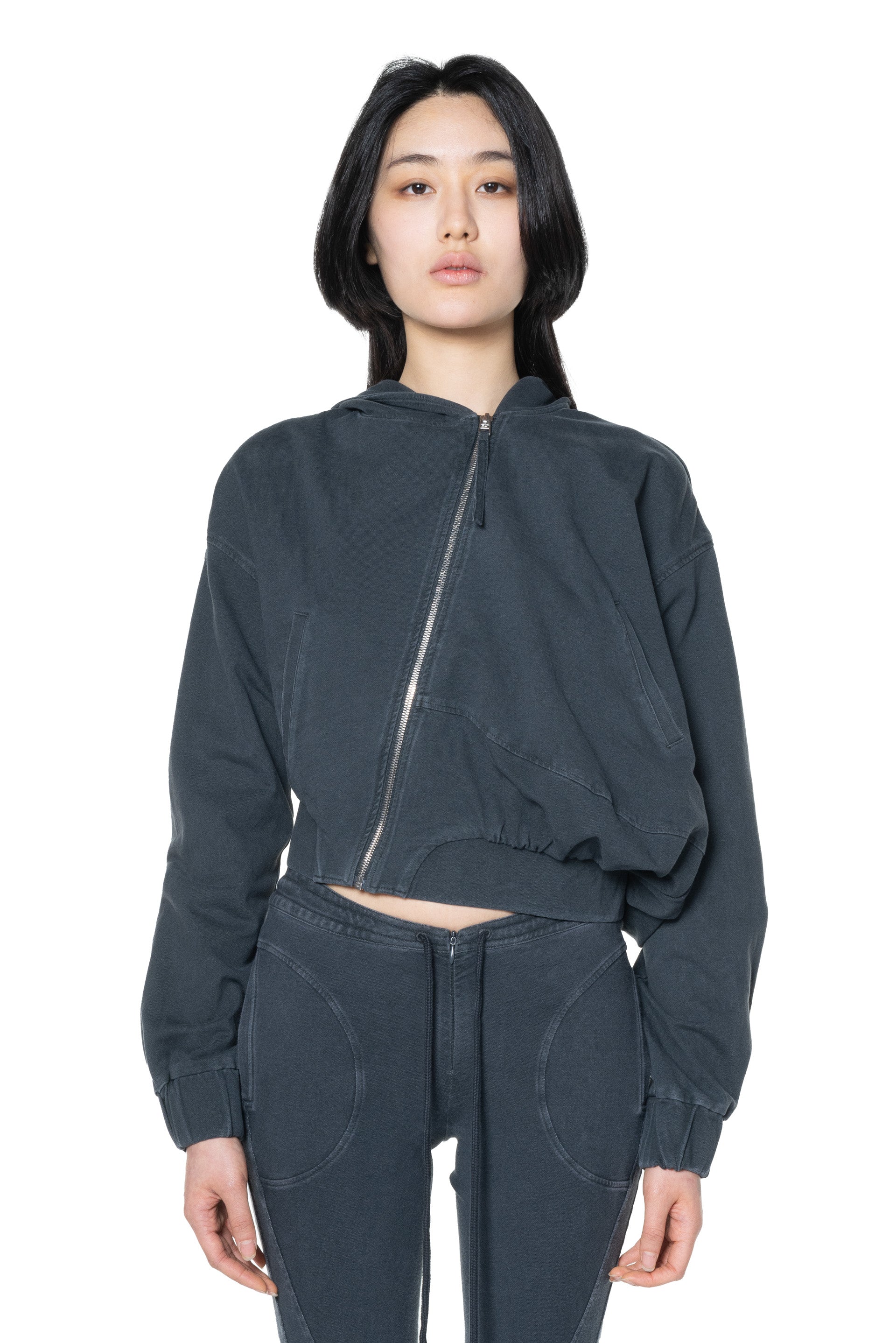 Long sleeves. Cropped. ZIp closure at front. Asymmetric construction. Two side pockets.