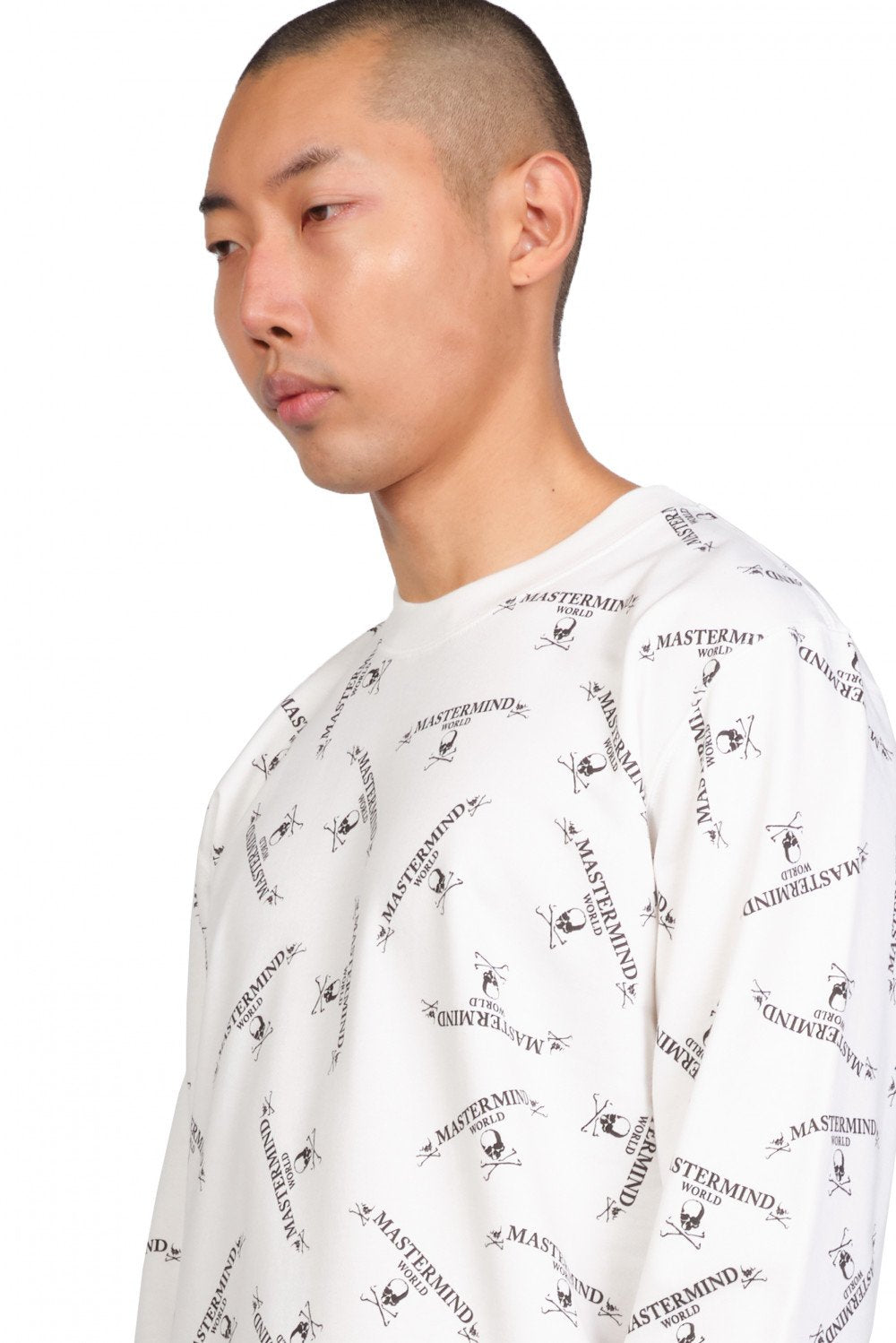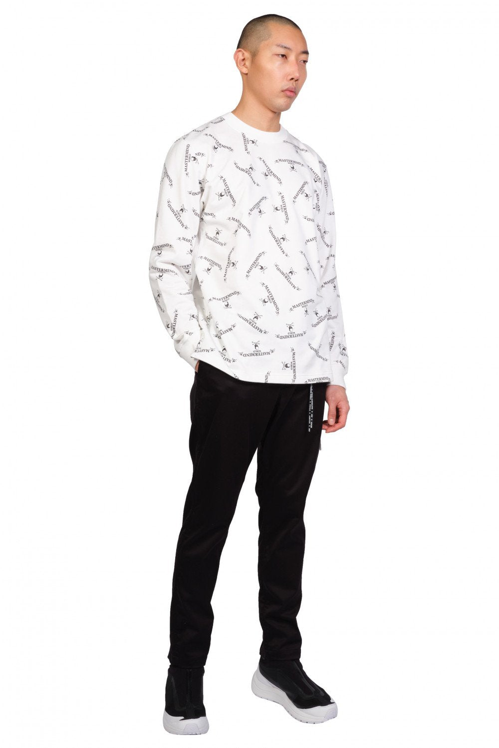 White featuring logo pattern printed in white throughout. Rib knit crewneck collar and cuffs. Textile logo patches in black at hem. Tonal stitching